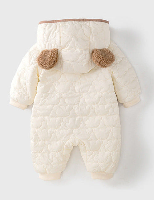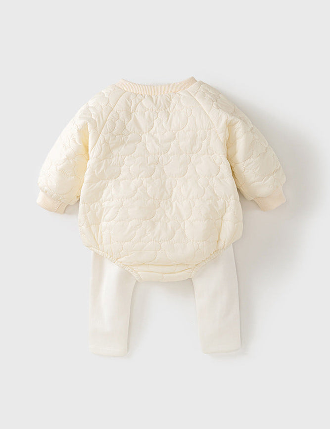 The boucle fabric — a looped, textured cotton that creates the most extraordinary soft, cloud-like surface — is what makes this romper immediately and obviously different from anything else a baby could be wearing. It's warmer and cosier than a standard romper. It photographs with a depth and texture that flat fabrics simply cannot match. And the teddy bear wrap design — with its distinctive bear identity worked into the construction of the garment itself — makes it simultaneously the most practical and the most beautiful piece in a baby's wardrobe.