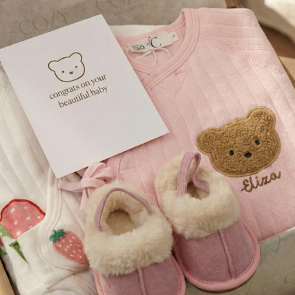 The Cozy Boucle Baby Bear Personalised Gift Box at £55 is our most popular baby shower choice. The VIP Cozy Boucle Baby Bear Personalised Gift Box at £75 is for when you want to go all out for someone you love.