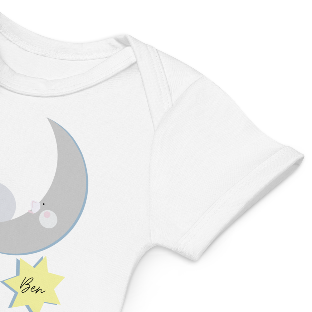 Introducing the Cozy Crew Club's mesmerizing "Dreamy Night Sky" personalized bodysuit, a magical addition to adorn your baby's wardrobe and a thoughtful gift for delighted parents. Crafted with love and meticulous attention to detail, this charming white onesie features a serene crescent moon surrounded by shimmering stars, casting a spell of tranquility and wonder.