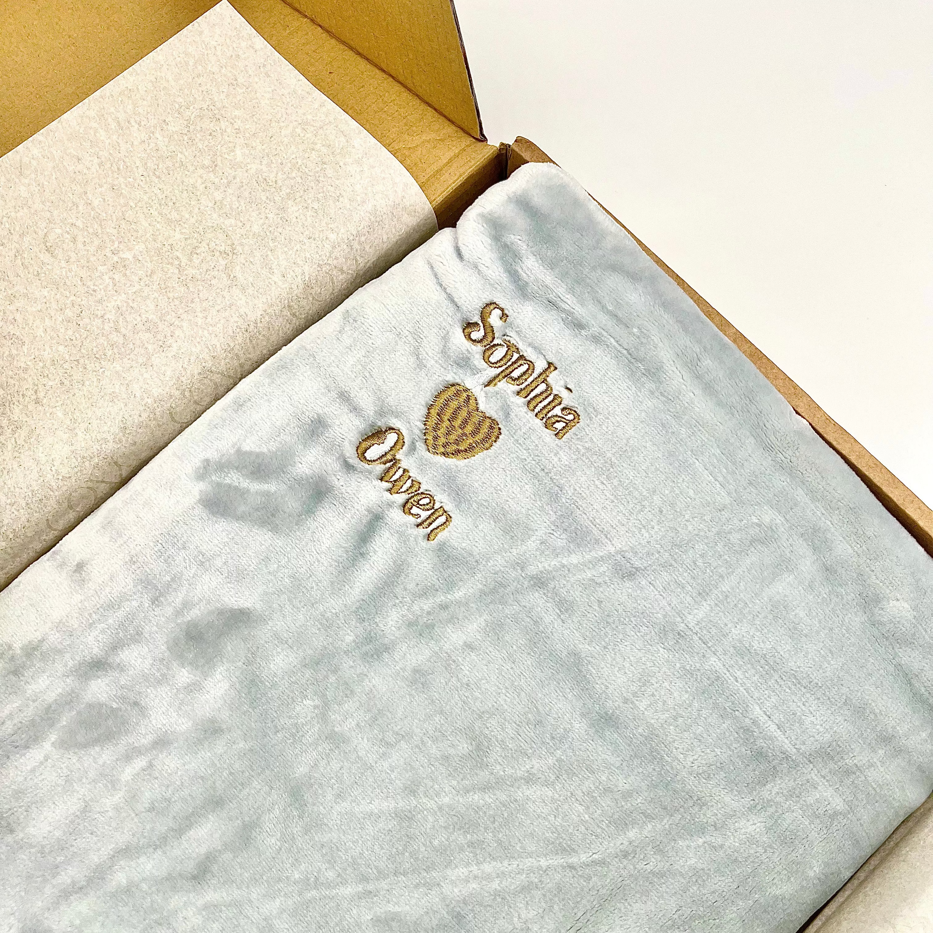 Our super-soft, elegant blankets come in a range of colours and can be hand-embroidered with your chosen names.