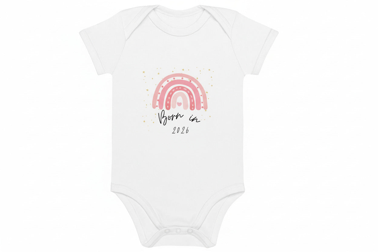 Introducing the Cozy Crew Club's exquisite "Born in 2025" personalized bodysuit, a delightful addition to any baby's wardrobe and an ideal gift for proud parents. Crafted with love and care, this charming white baby grow features a precious Rainbow design, evoking warmth and wonder.