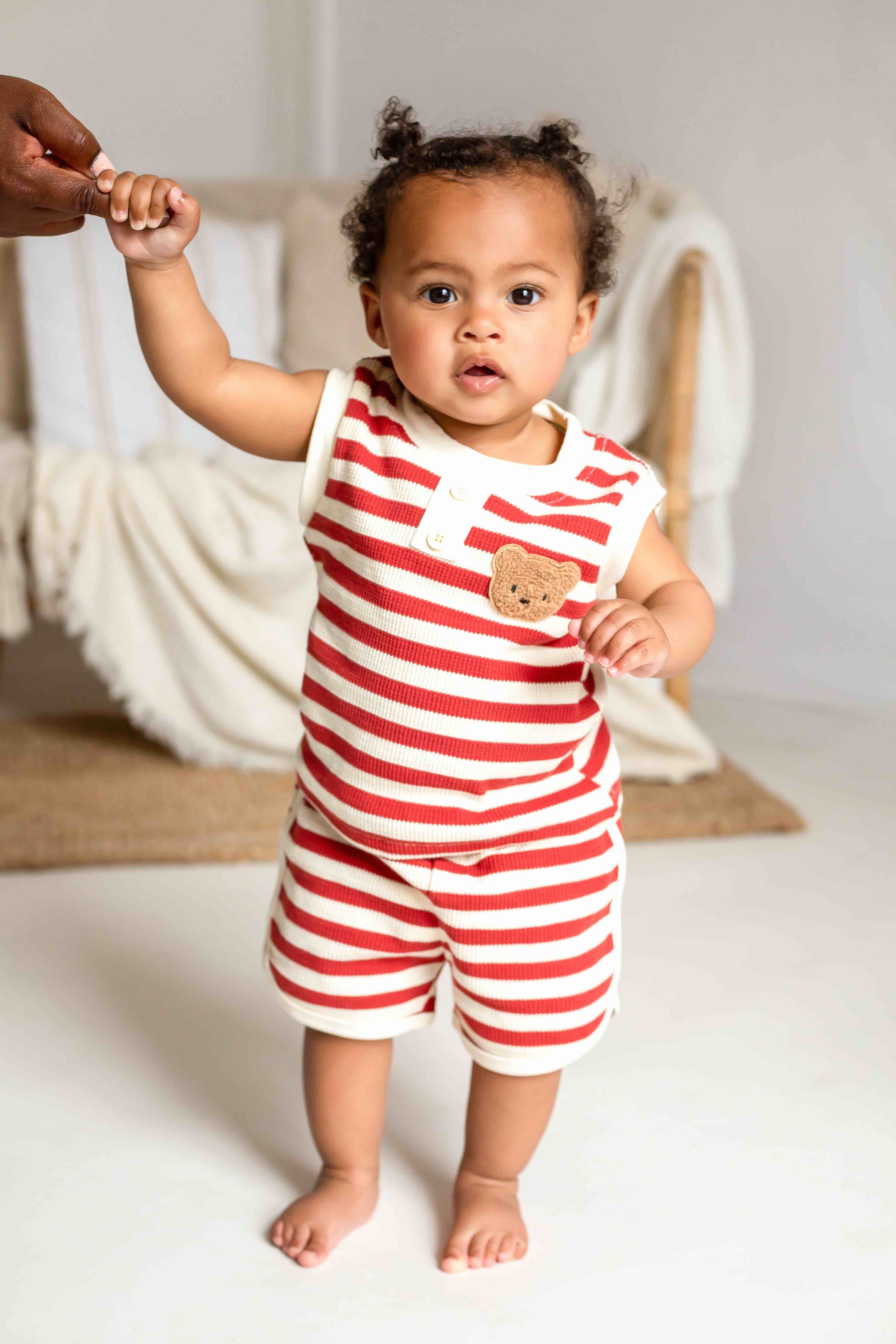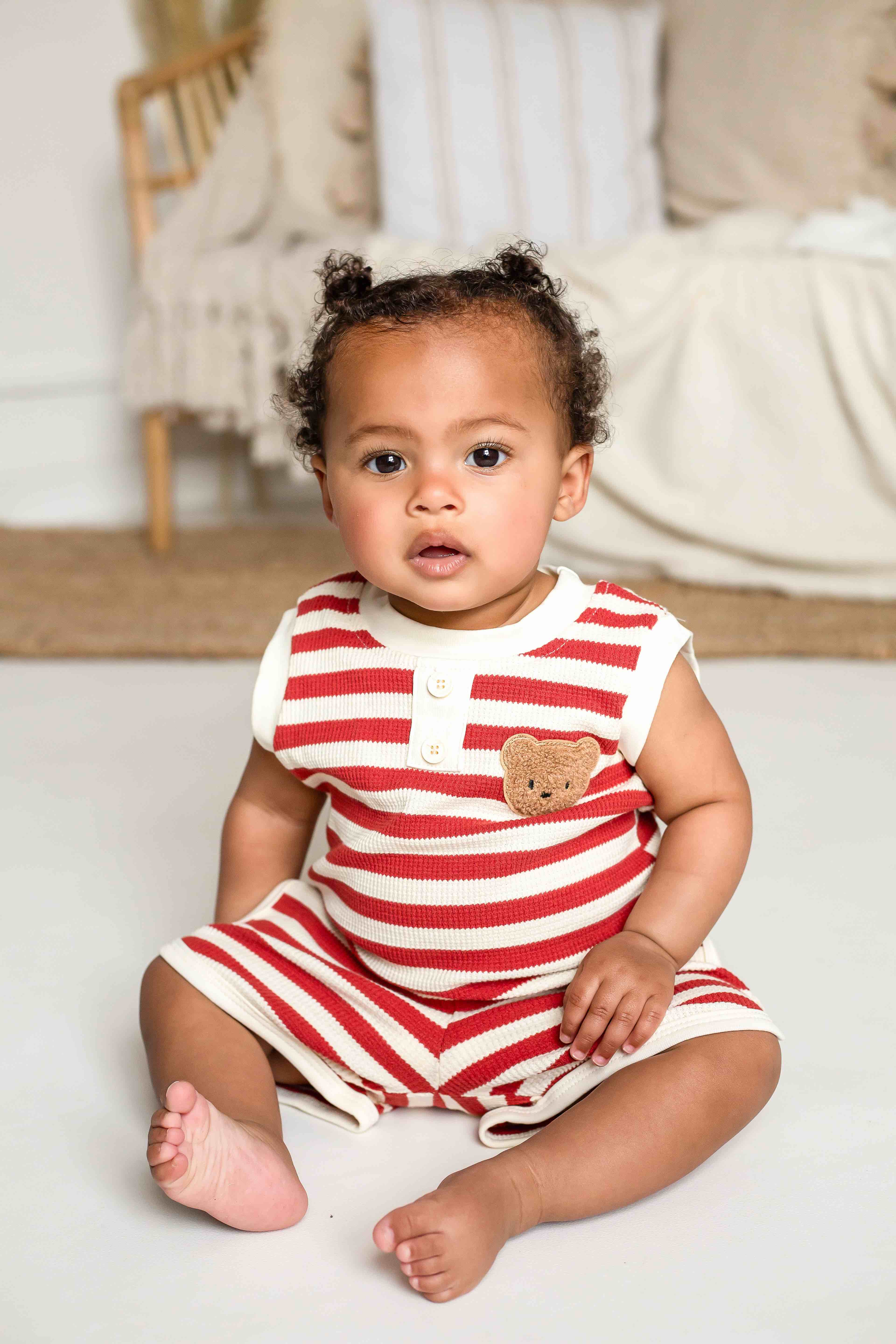 Made from soft and breathable cottons, our Bear Beach Stripe Shorts & T-Shirt Set keeps your baby comfy and cool, making it ideal for those fun-filled days at the beach. Let your little one splash in the waves and build sandcastles with ease and style.