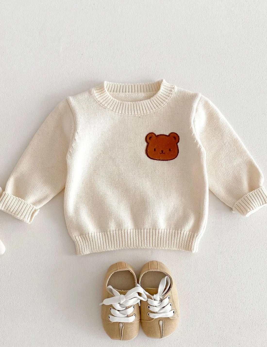 A baby knit jumper pulls on over the head as a complete top — more structured, more of a standalone outfit piece, and generally slightly warmer than a cardigan because the closed front retains heat more effectively. Jumpers pair beautifully with knit bottoms as a coordinated set, or with jogger bottoms and a bodysuit underneath for a layered, put-together everyday look.