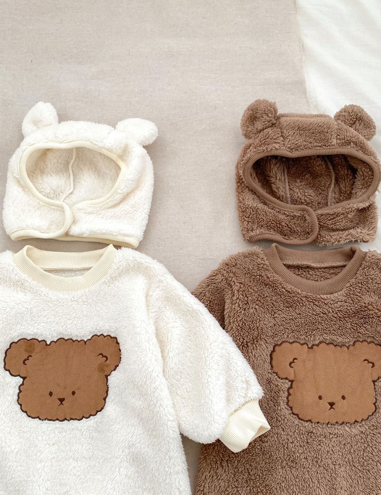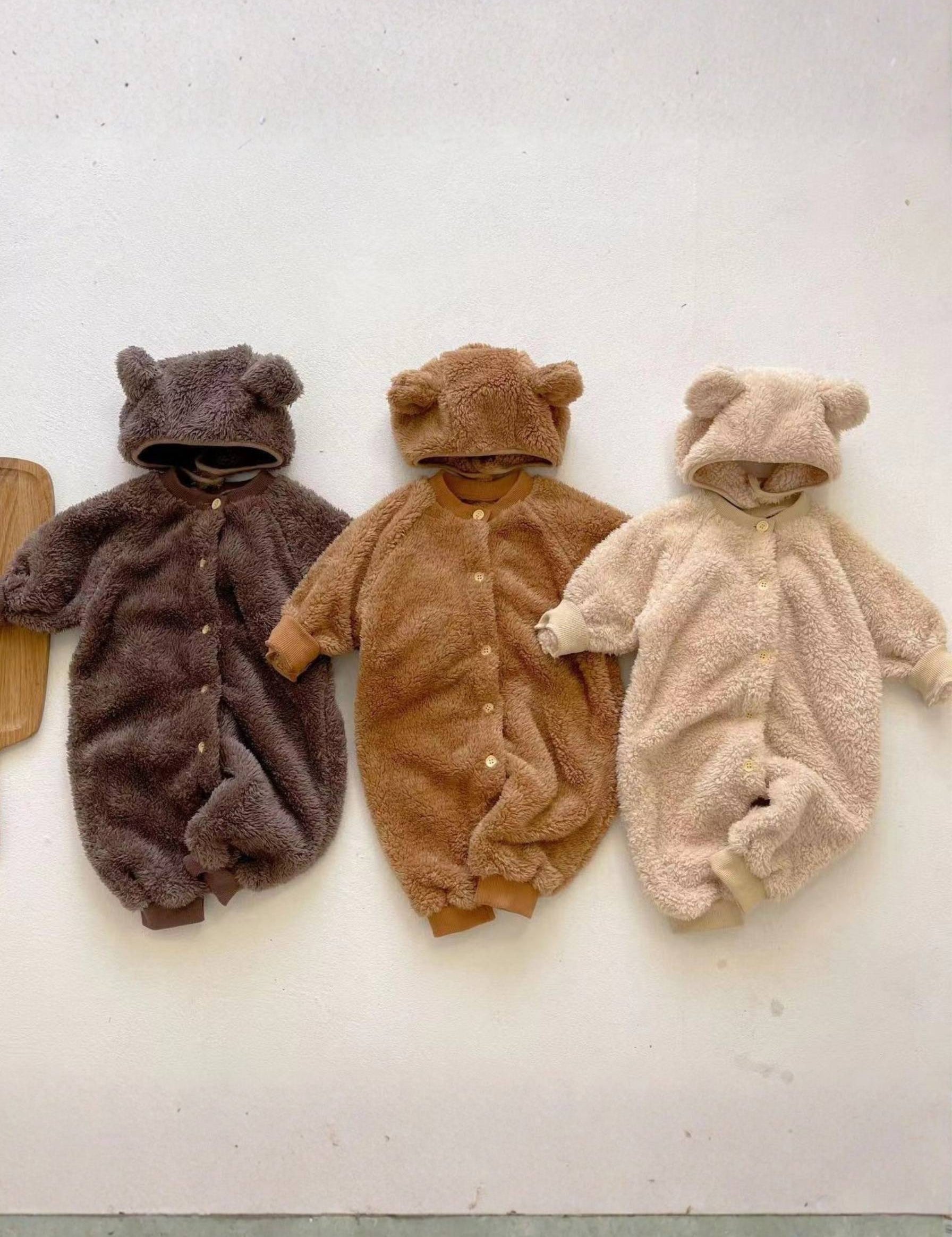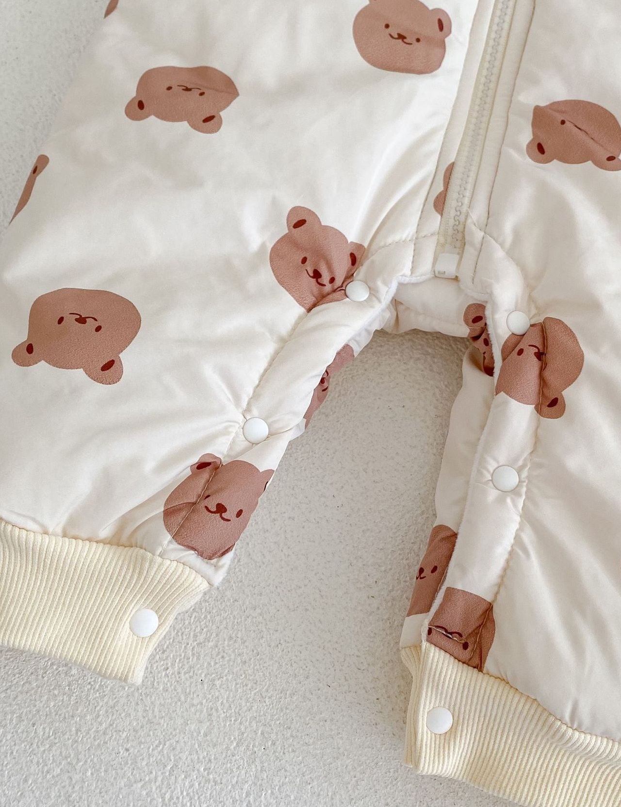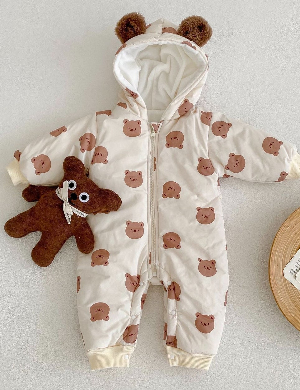 Our baby bear puffer suits are constructed with a padded, quilted outer that traps warmth close to your baby's body while remaining lightweight enough not to restrict movement or create the overheating that bulkier suits can cause. The signature bear hood — with its distinctive bear ears that frame your baby's face perfectly — is the detail that stops everyone in their tracks and the reason our puffer suits are among the most shared baby outfits on social media every winter.