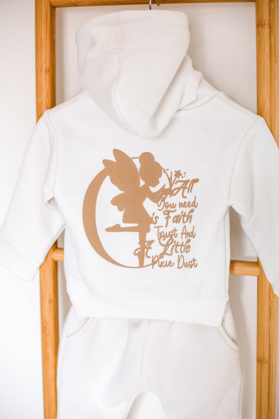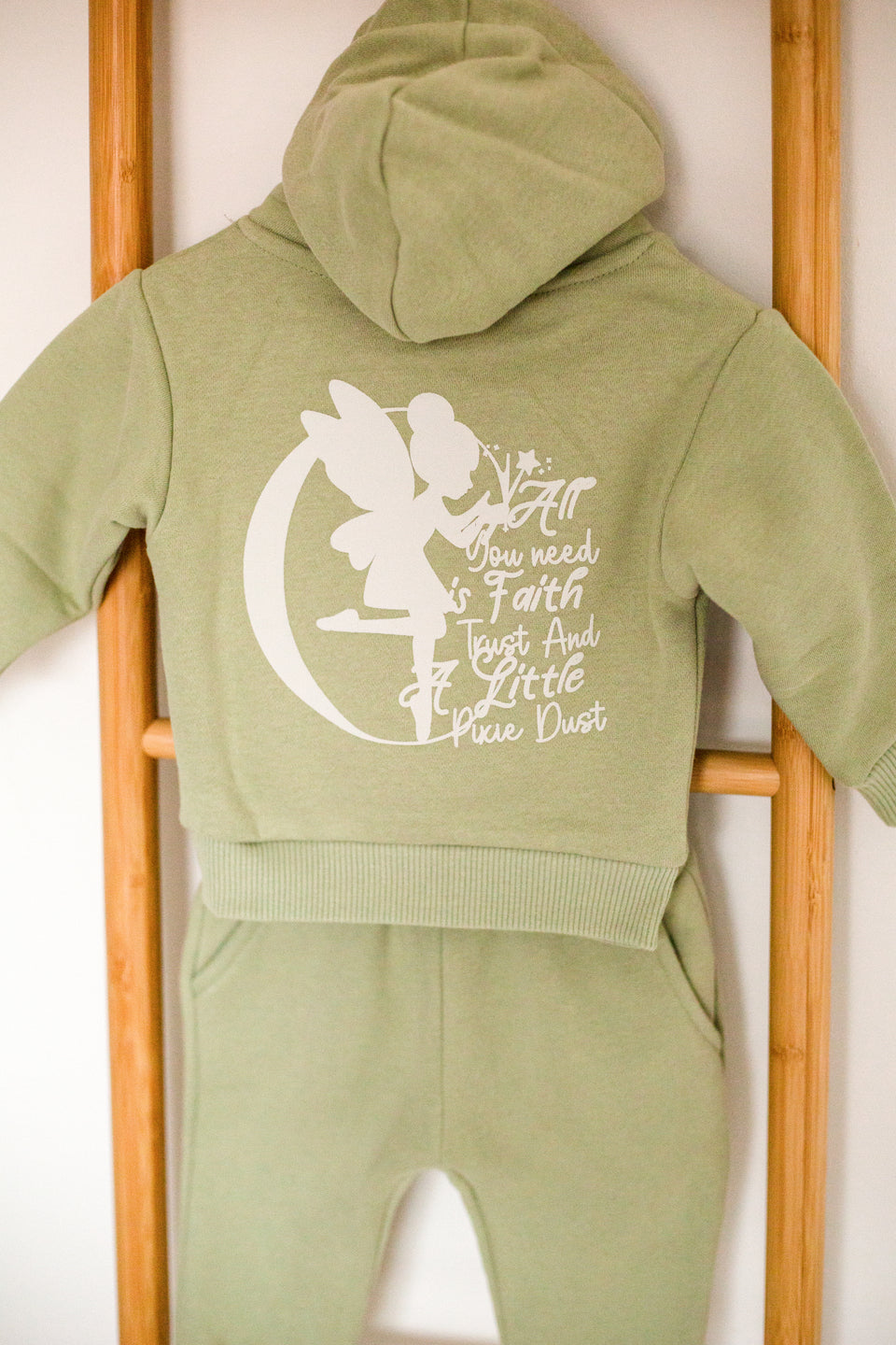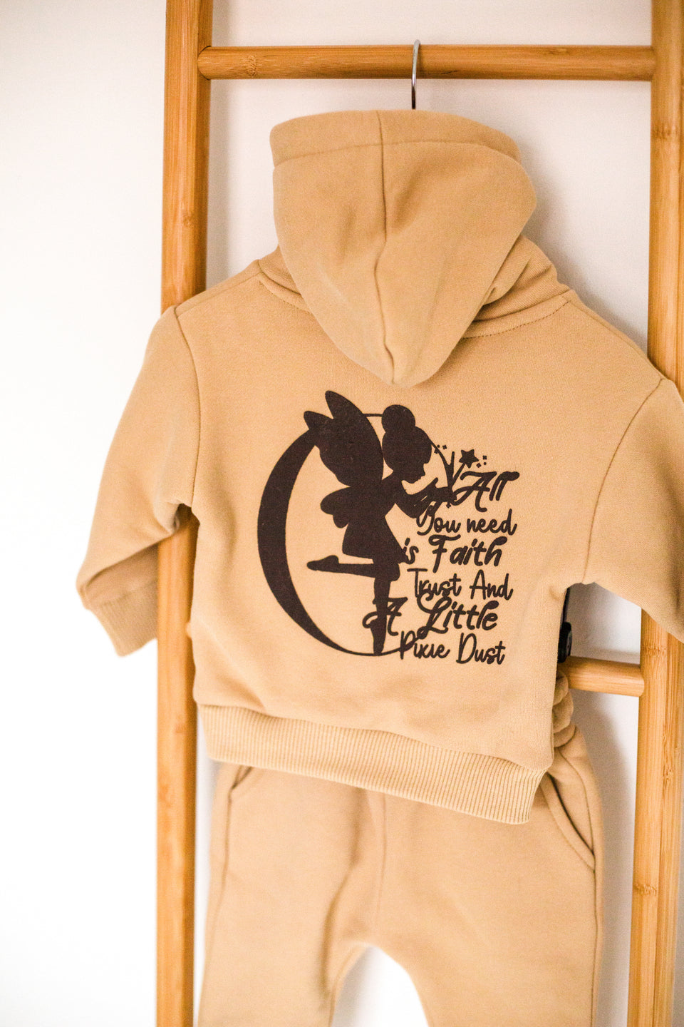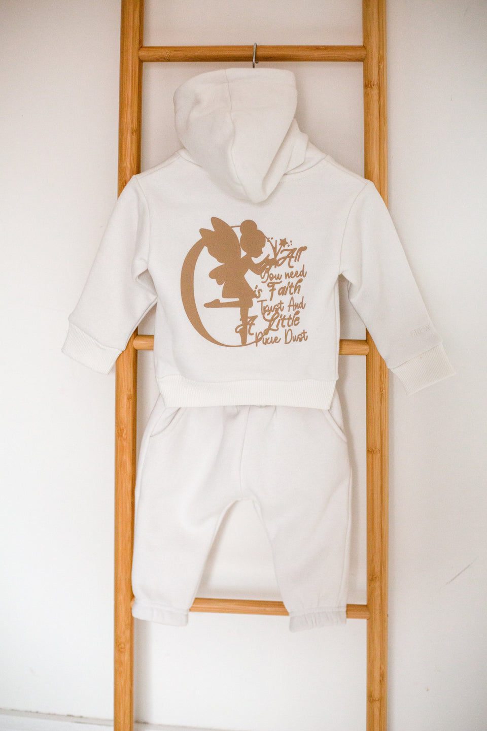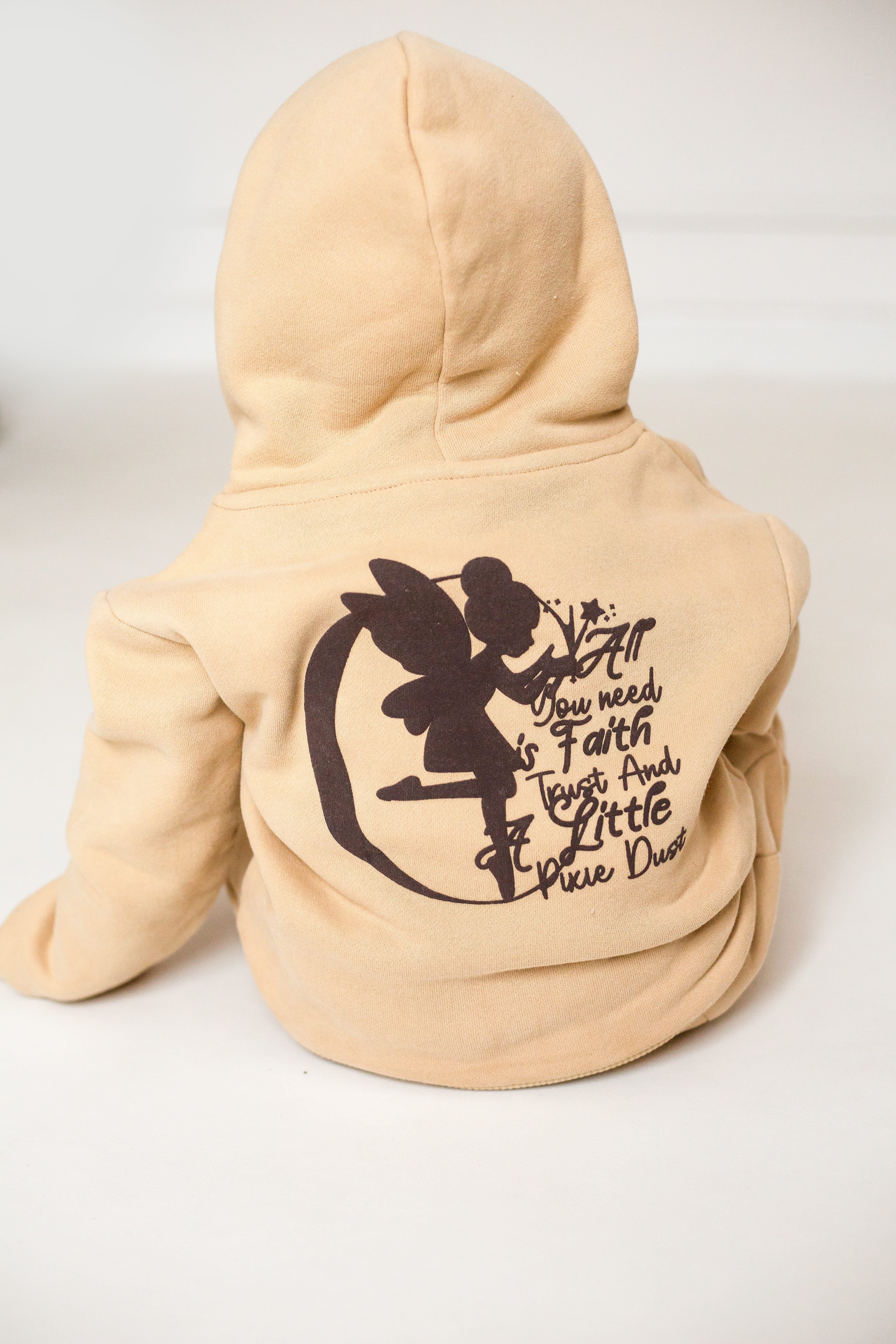 Wrap your little one in cozy magic with our Tinkerbell Tracksuit, available in Biscuit, Sage, and Off-White. This adorable set features a soft oversized hoodie with a playful Tinkerbell puff print on the chest, and the words "All you need is faith, trust, and a little pixie dust" in puff print on the back. Complete with matching sweatpants, this tracksuit is the perfect combination of comfort and style for your child.