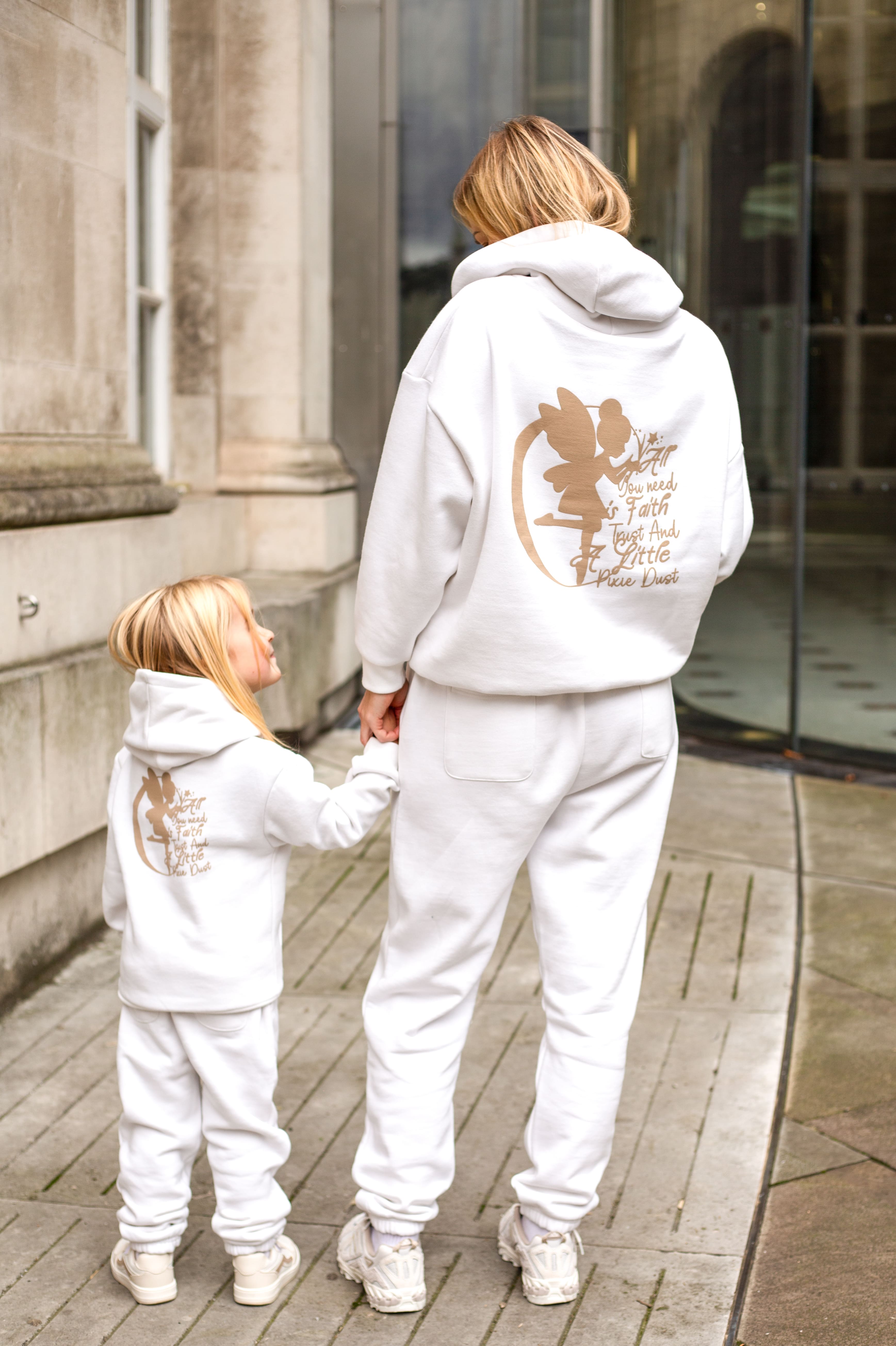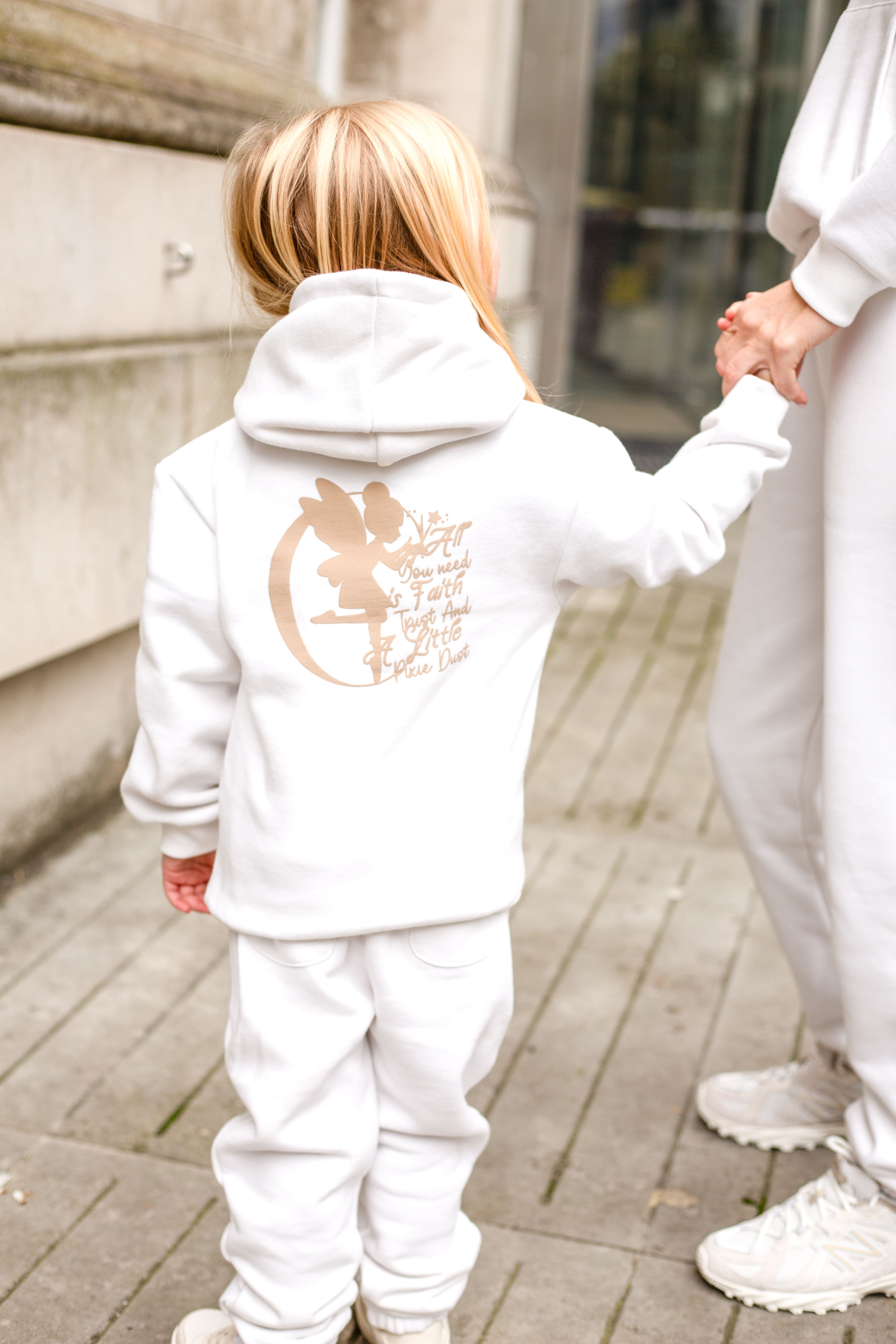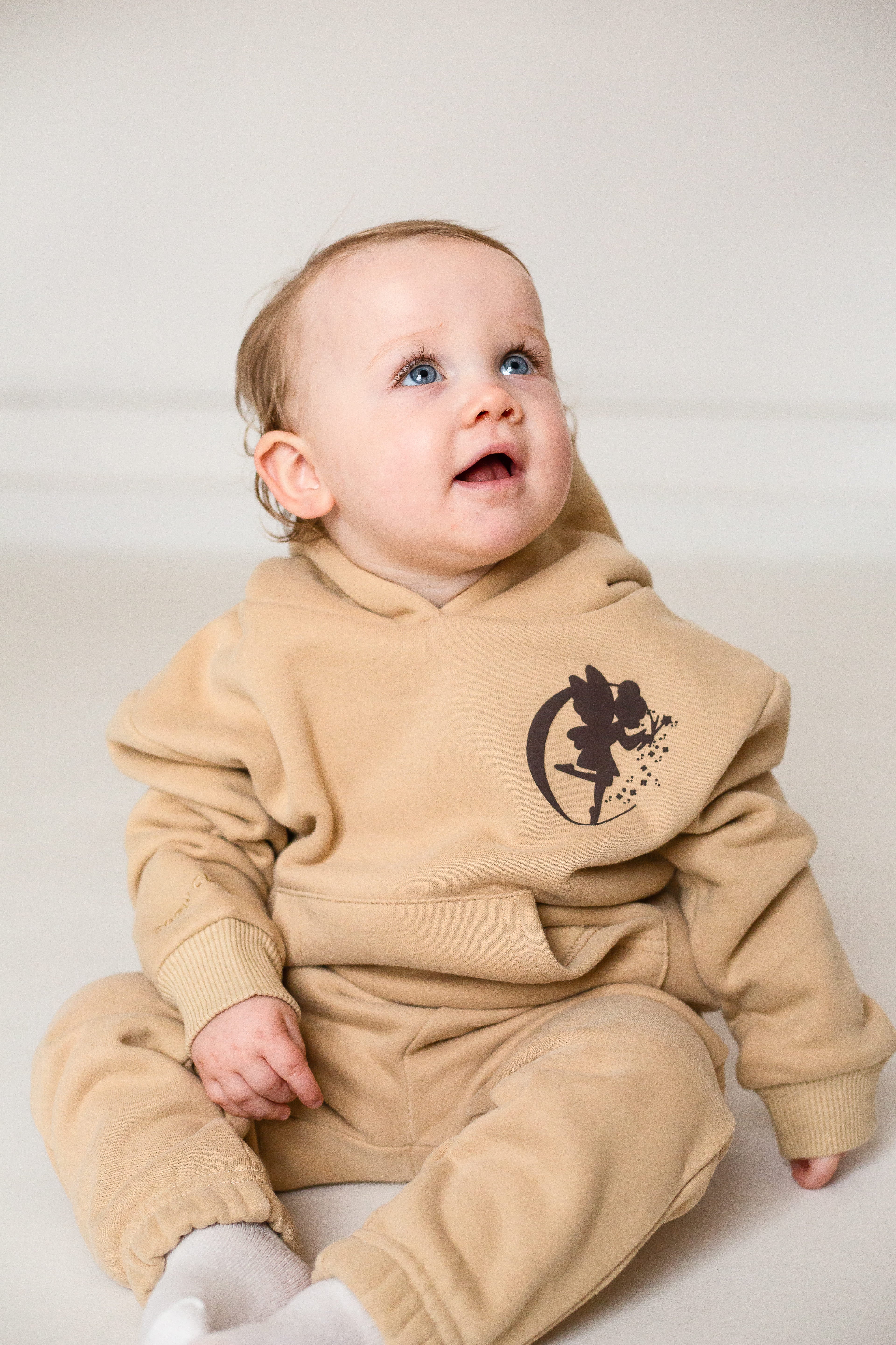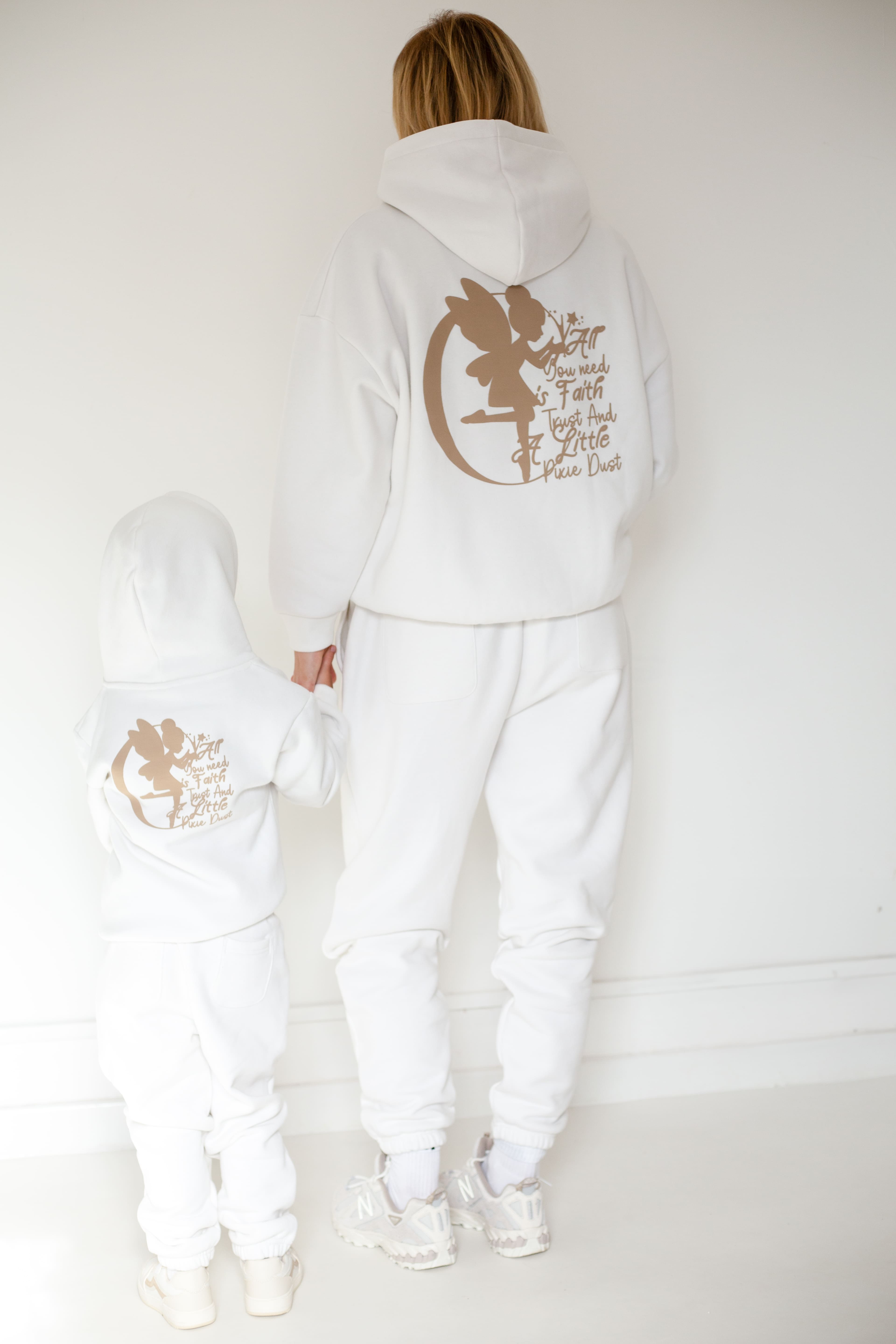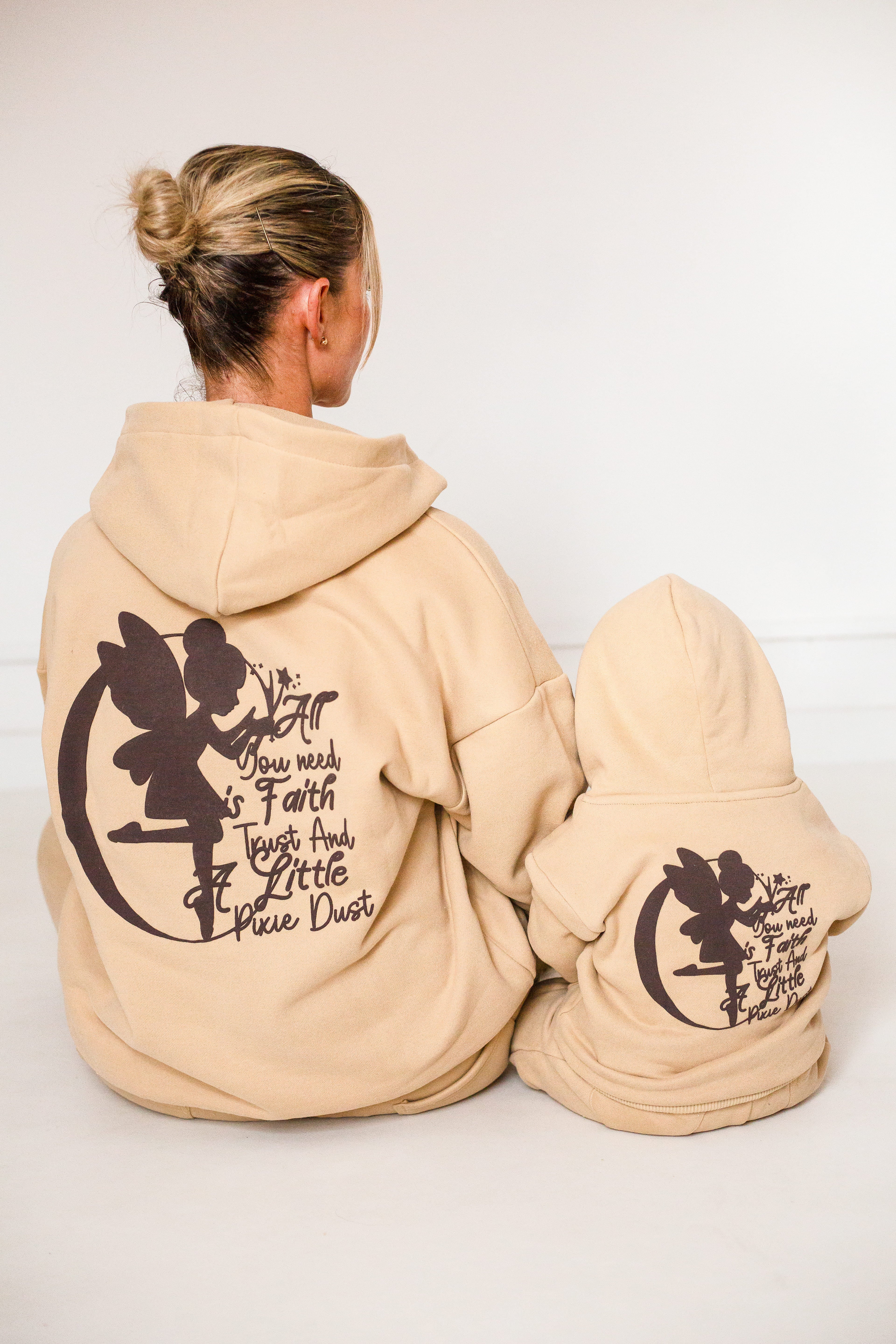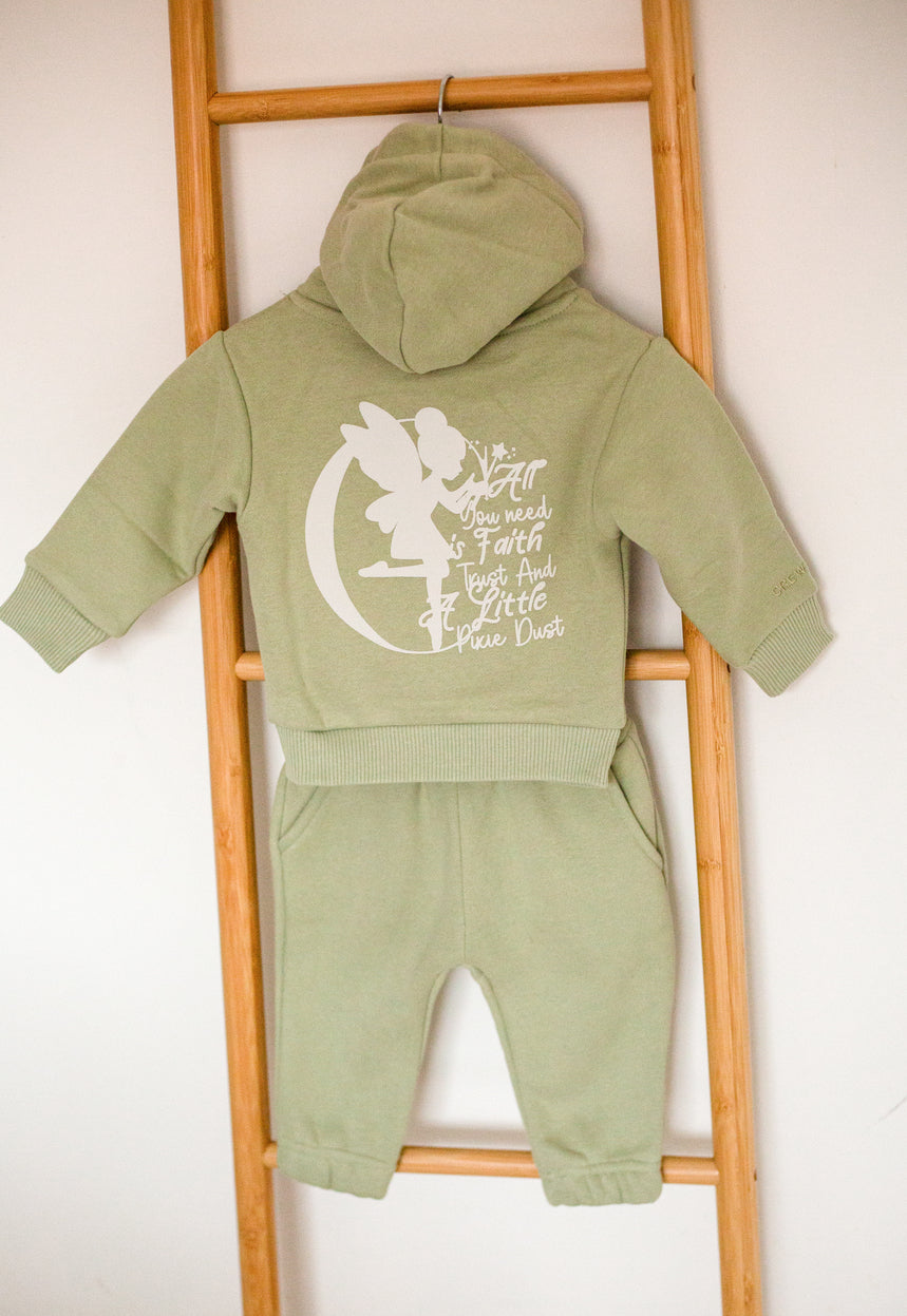Wrap your little one in cozy magic with our Tinkerbell Tracksuit, available in Biscuit, Sage, and Off-White. This adorable set features a soft oversized hoodie with a playful Tinkerbell puff print on the chest, and the words "All you need is faith, trust, and a little pixie dust" in puff print on the back. Complete with matching sweatpants, this tracksuit is the perfect combination of comfort and style for your child.