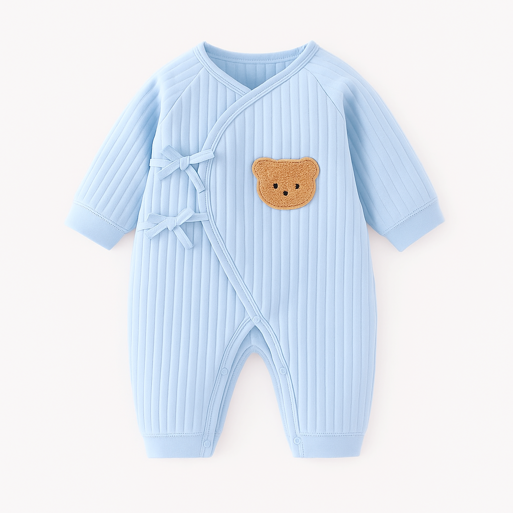 👶 Teddy Boucle Wrap Blue Romper, featuring the baby’s name in your selected font 🍓 Blue Rainbow Boucle Wrap Romper 💌 Boucle Socks & A handwritten gift card with your heartfelt message, making it extra special.