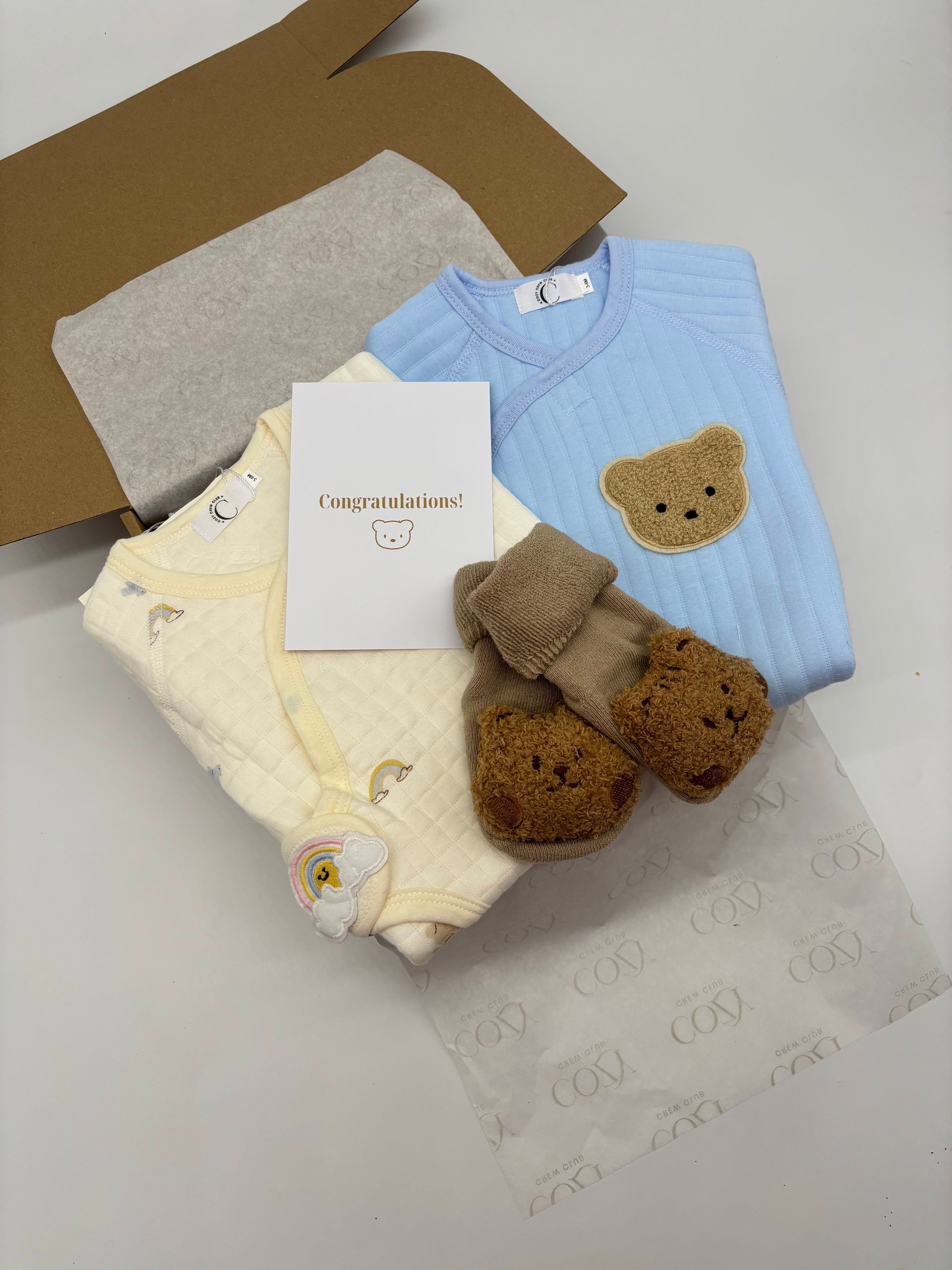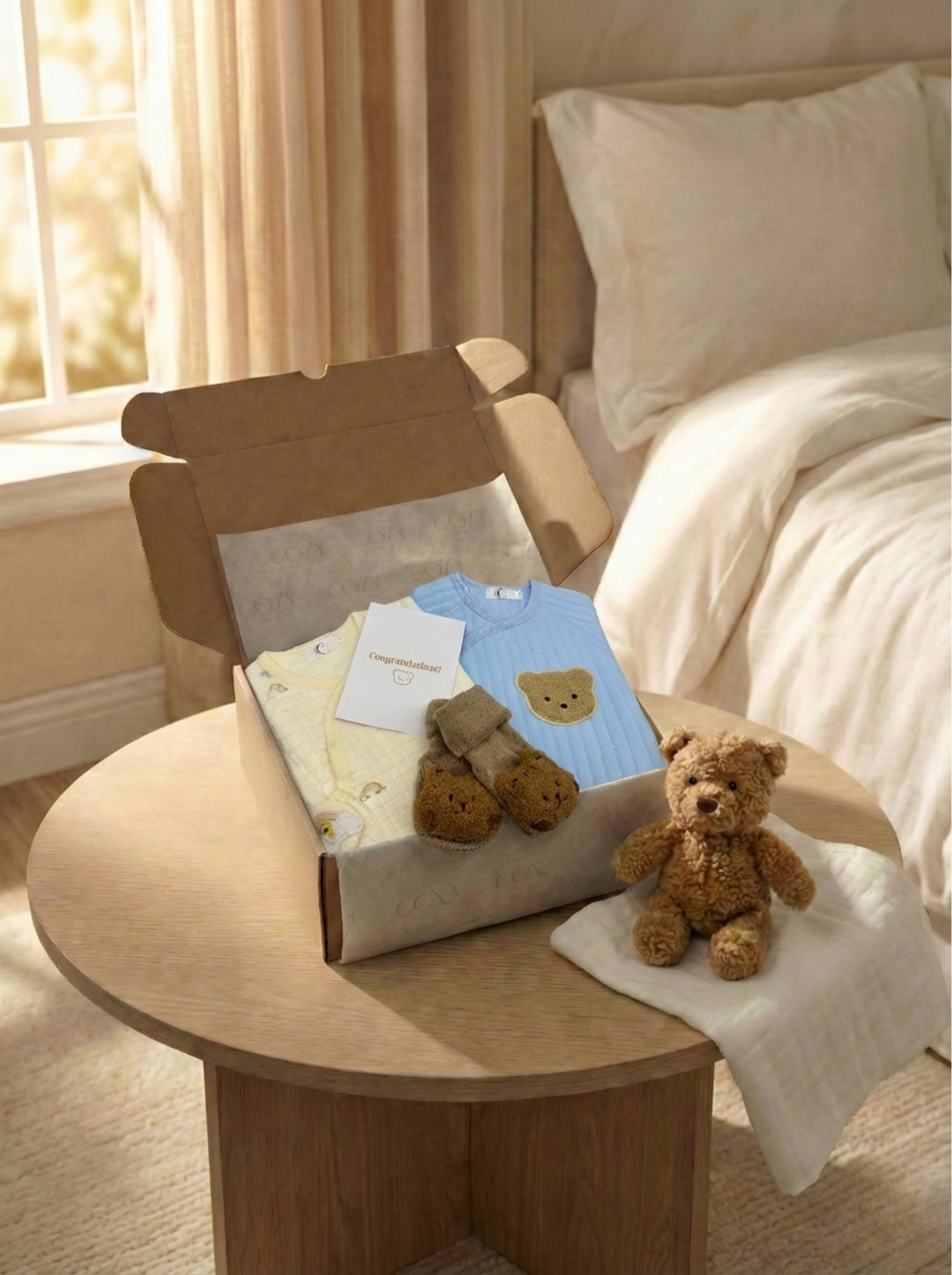 Crafted from eco-friendly, baby-safe materials, our gift set guarantees quality, warmth, and style for little ones while giving parents the ultimate thoughtful present. Whether for a baby boy or girl, this box takes the guesswork out of gifting and delivers pure joy every time.