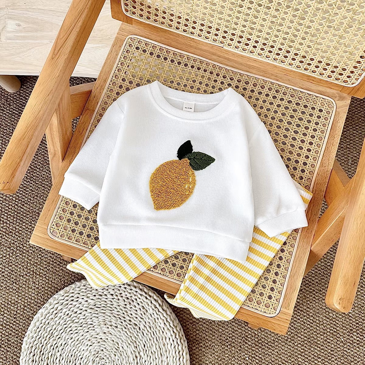 Bringen Sie mit unserem Little Lemon Zest Baby-Sweatshirt einen Hauch von Sonnenschein in die Garderobe Ihres Kleinen! Dieses verspielte Design aus weichem, umweltfreundlichem Stoff verfügt über eine leuchtende Zitronen-Applikation, die so frisch und lustig ist wie Ihr Baby. Zusammen mit fröhlich gestreiften Leggings ist es das perfekte Outfit, um jeden Tag aufzuhellen. Dieses gemütliche, atmungsaktive und nachhaltig hergestellte Set ist eine pikante Wahl zum Spielen, Kuscheln oder für bildschöne Momente. 🍋✨