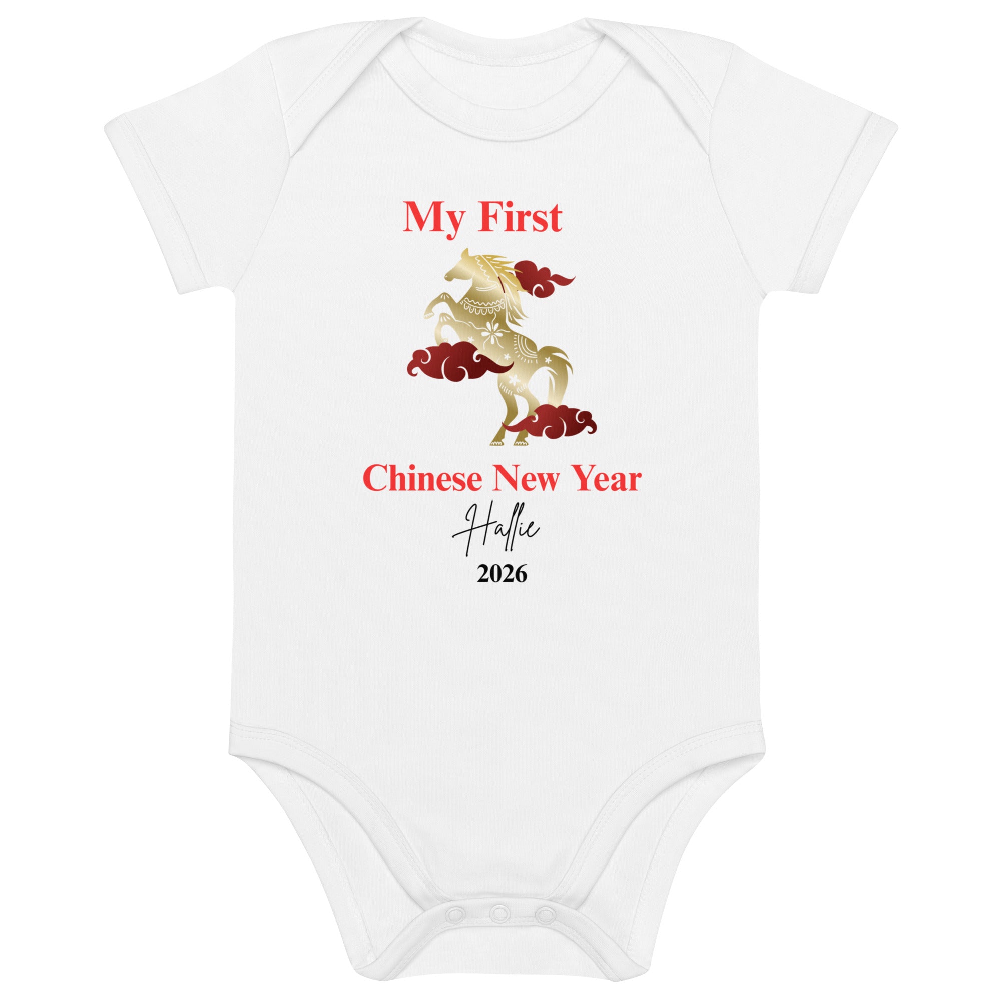 Embrace the spirit of Chinese New Year with the Cozy Crew Club's "My 1st Chinese New year of the horse and clouds 2026" personalized bodysuit – where each detail is crafted with love, mirroring the preciousness of your little miracle.