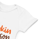 Introducing the Cozy Crew Club’s "Pumpkin Season" – the perfect blend of festive fun and personalized charm for your little one's first Halloween! This delightful white bodysuit features an adorable pumpkin bear design, capturing the spirit of the season with a touch of whimsy.