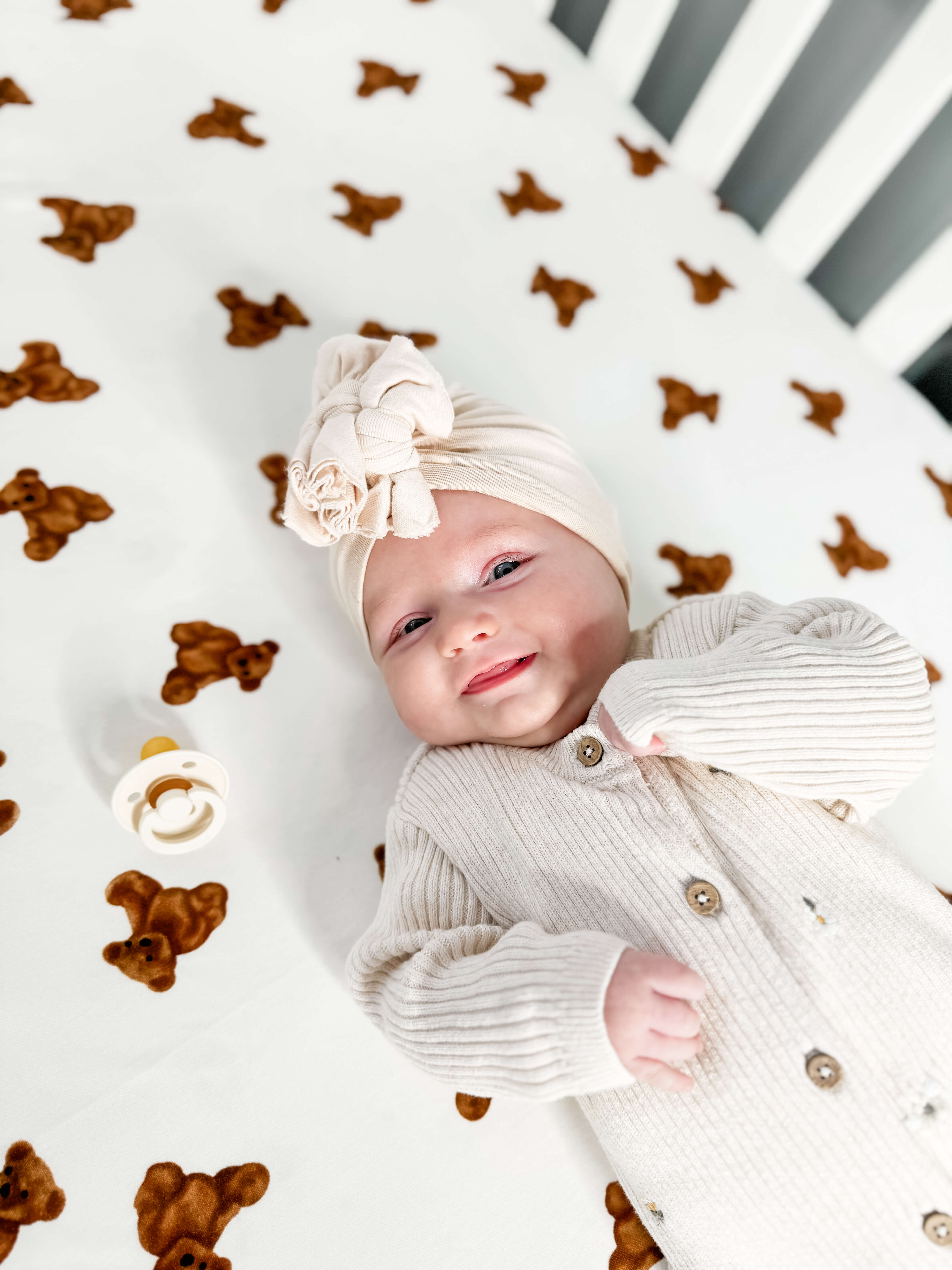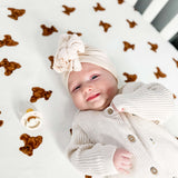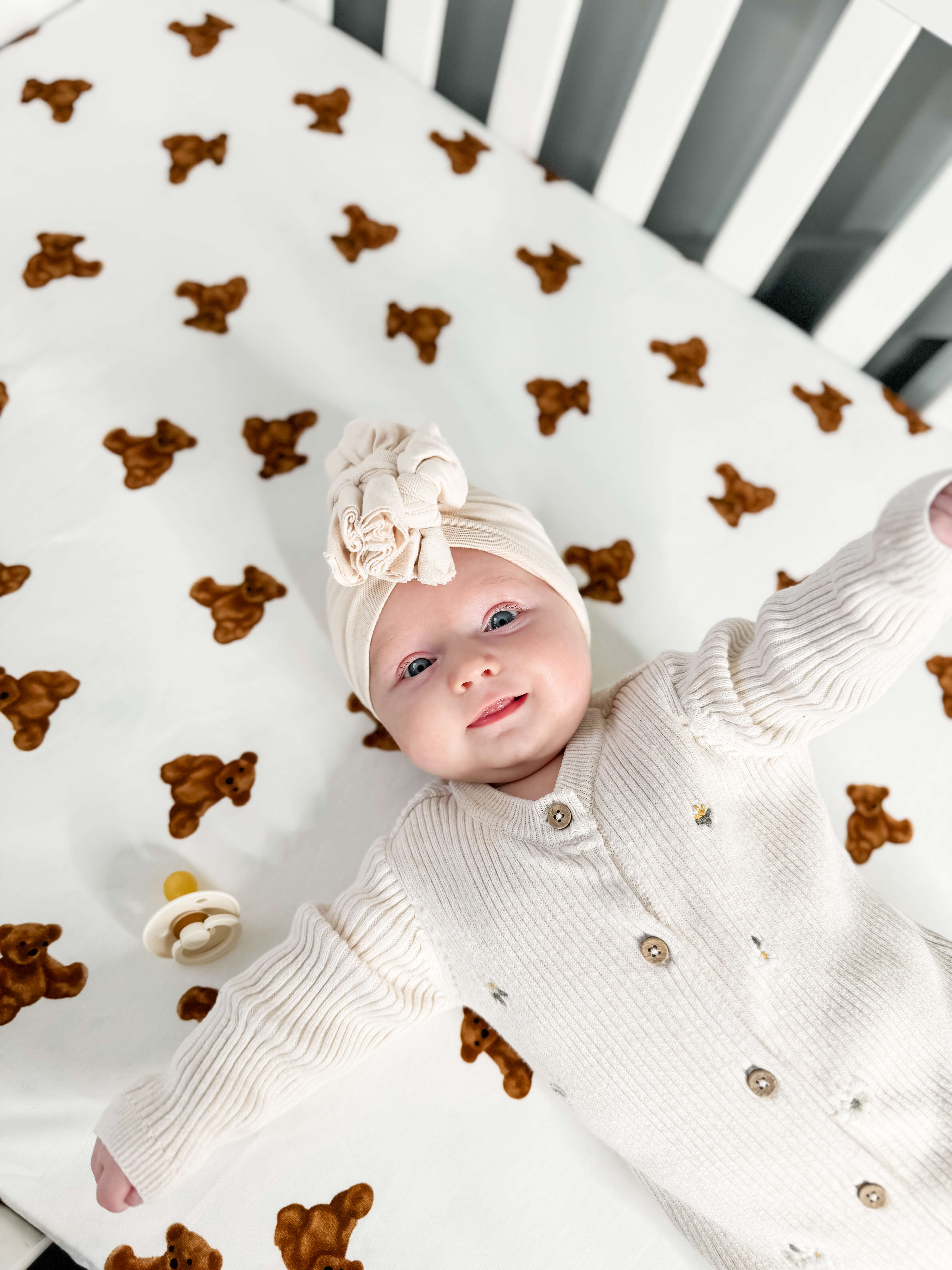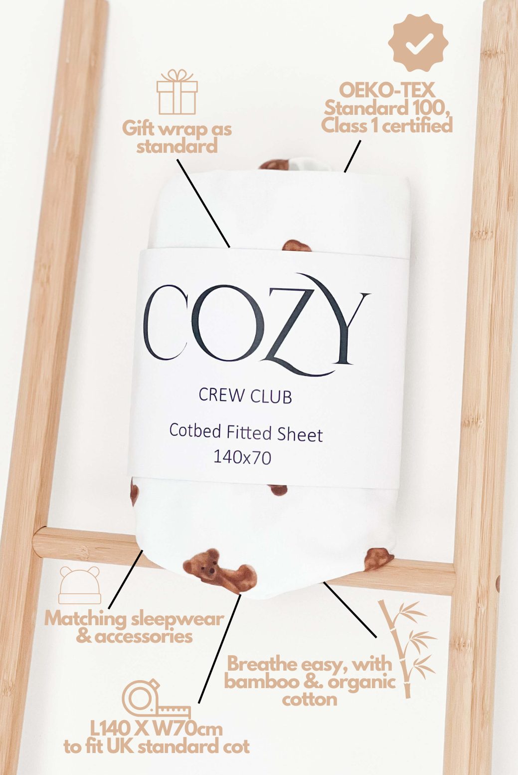 Wir präsentieren Ihnen die neuste Ergänzung vom Cozy Crew Club für das Kinderzimmer Ihres Babys: unsere entzückenden Bettlaken mit Bärenmuster.