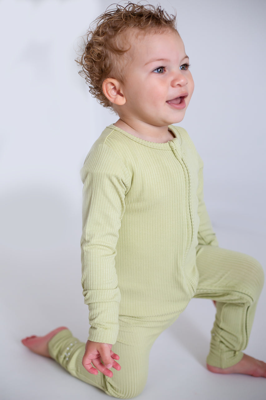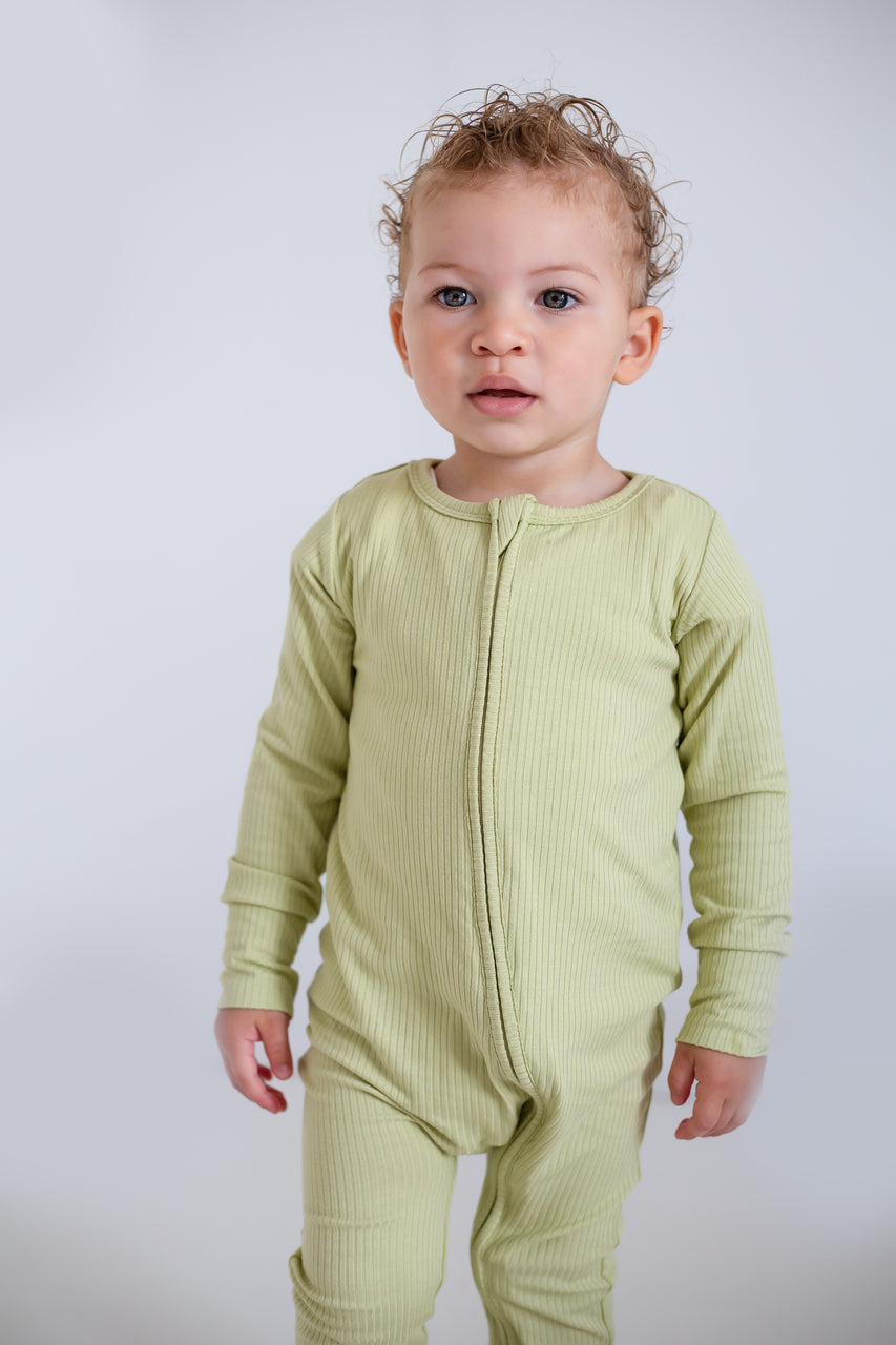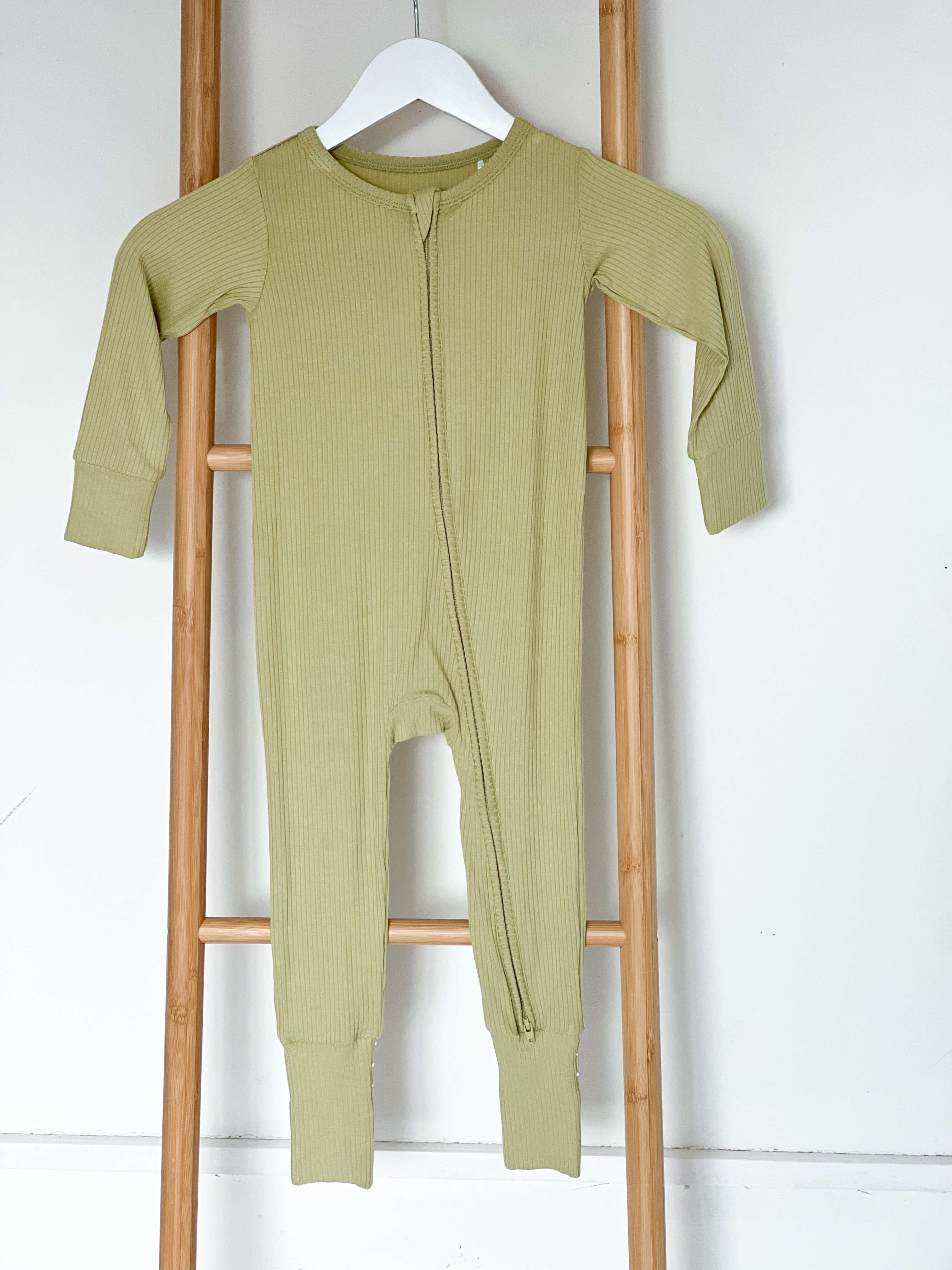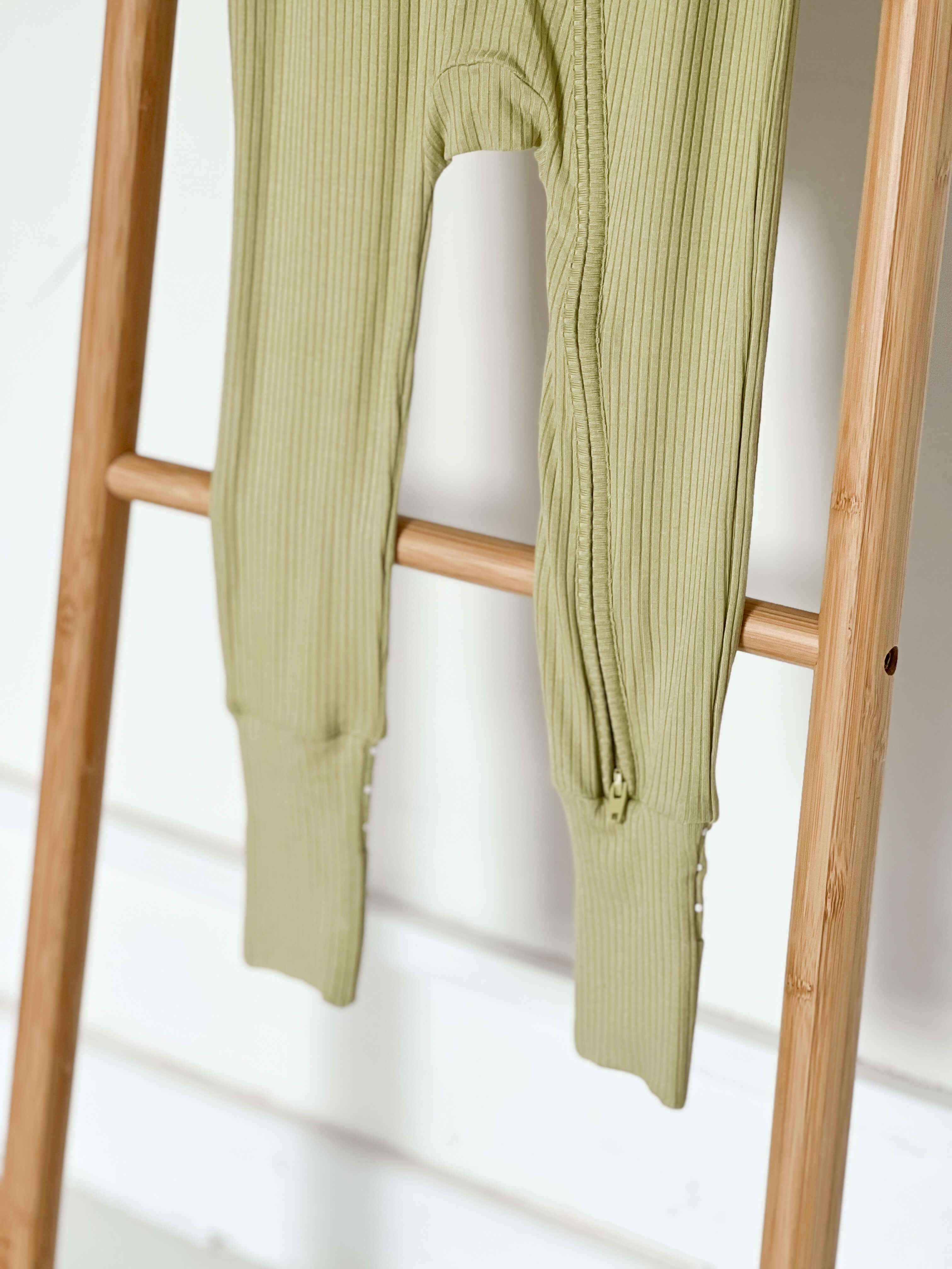 Grüner gerippter Schlafanzug aus Bambus mit Reißverschluss, einteilig