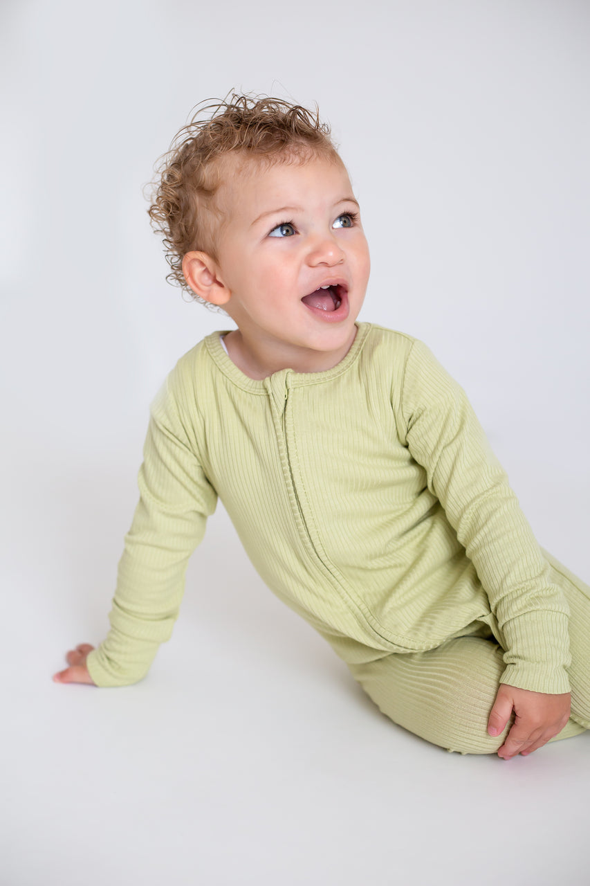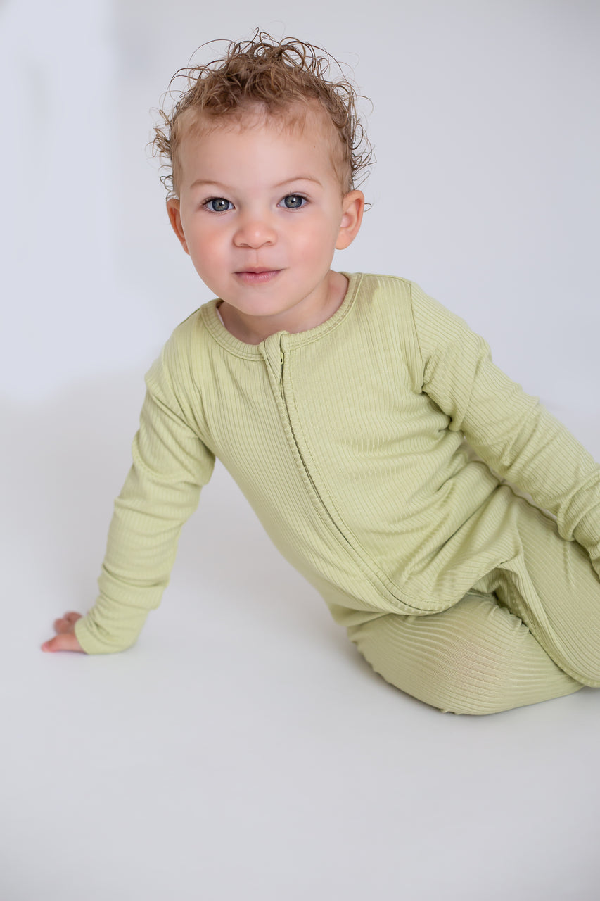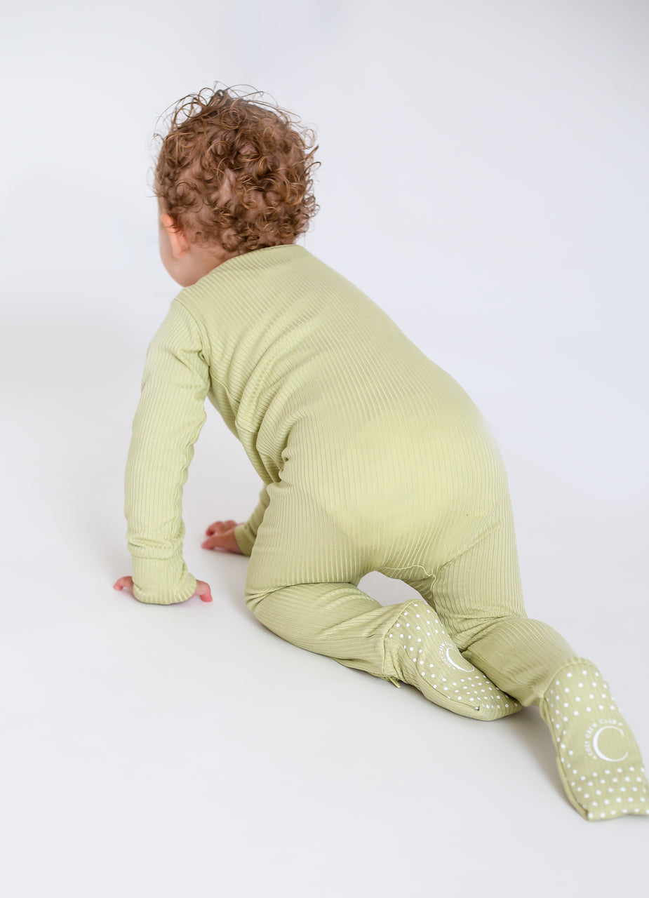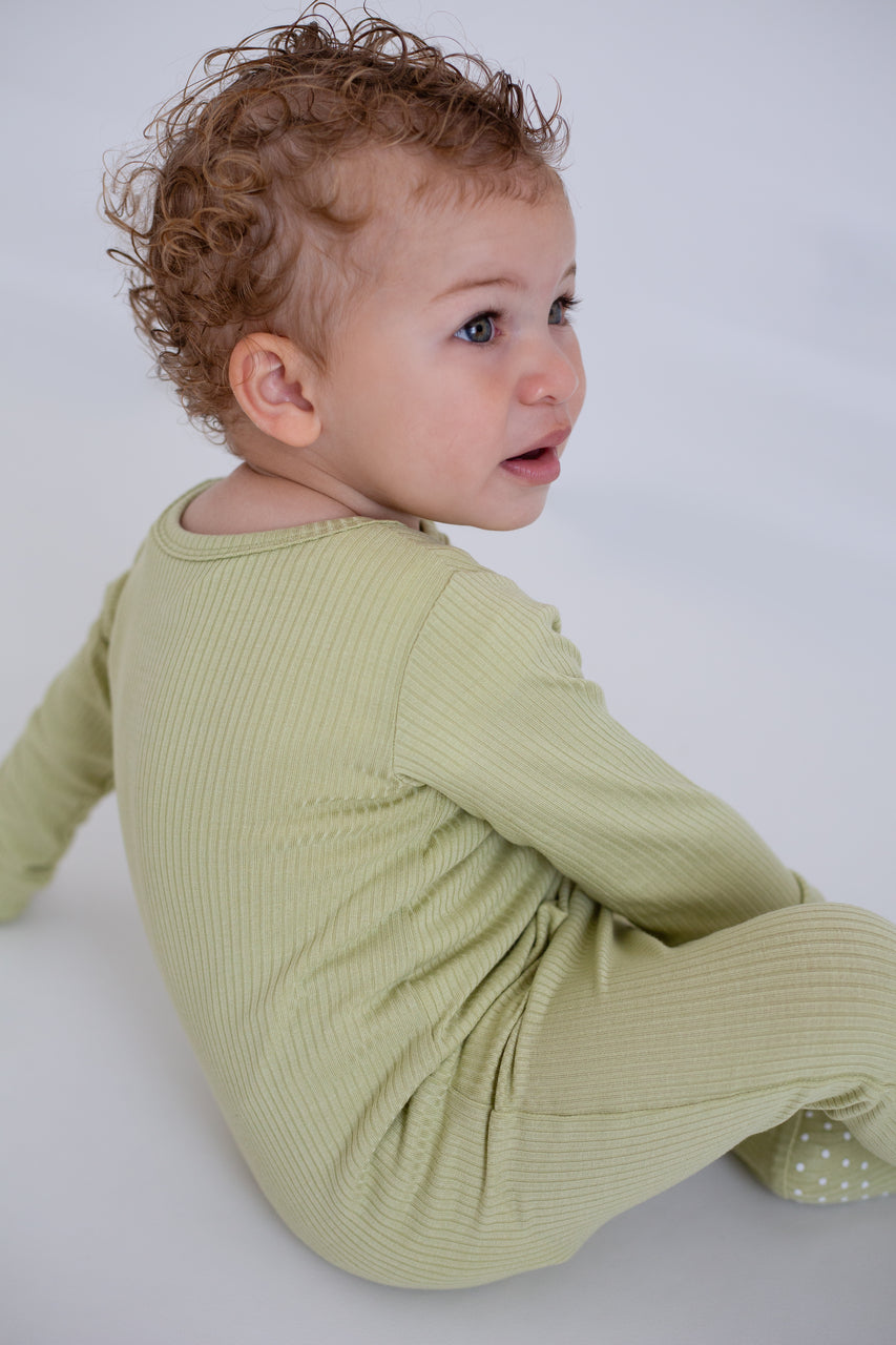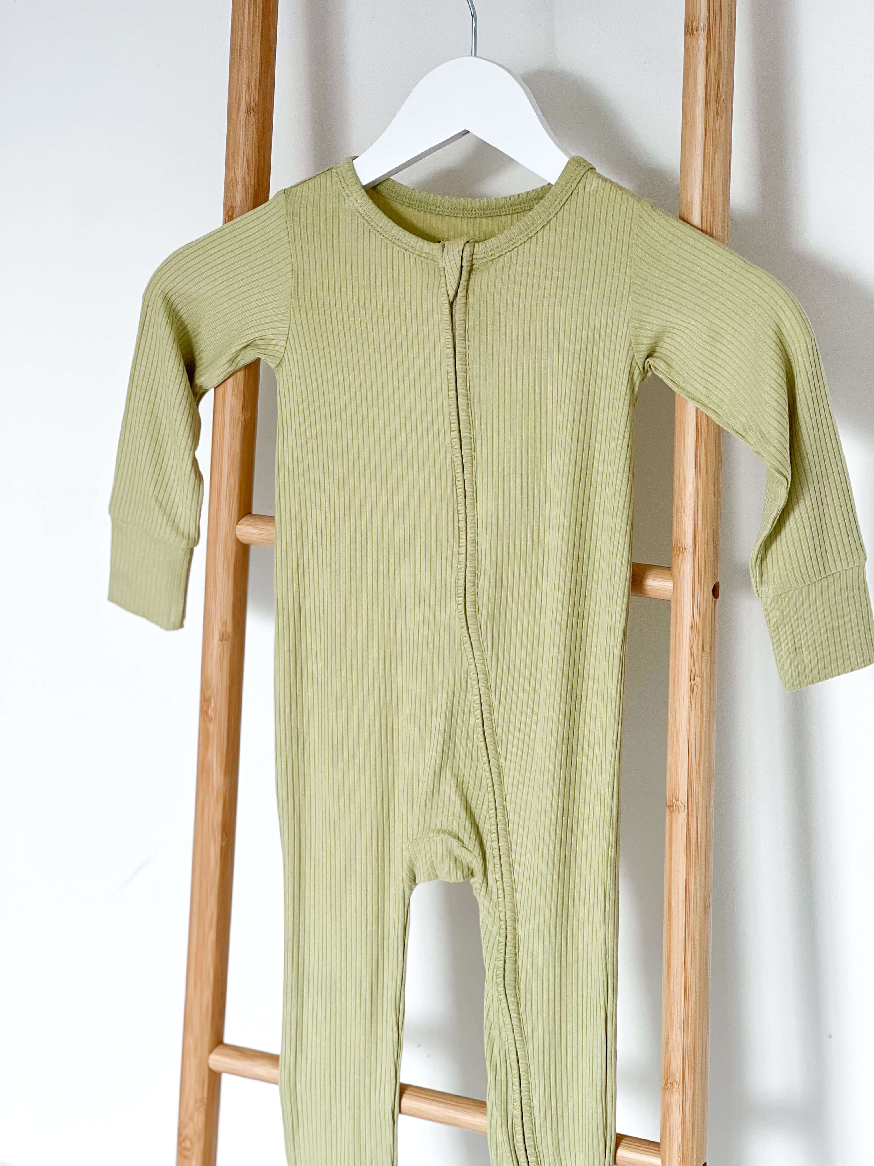 Grüner gerippter Schlafanzug aus Bambus mit Reißverschluss, einteilig