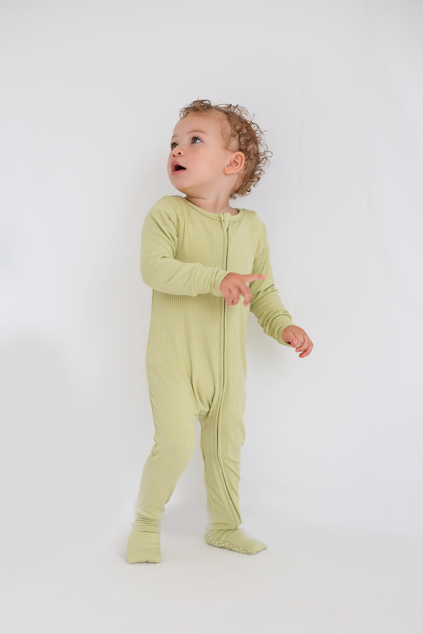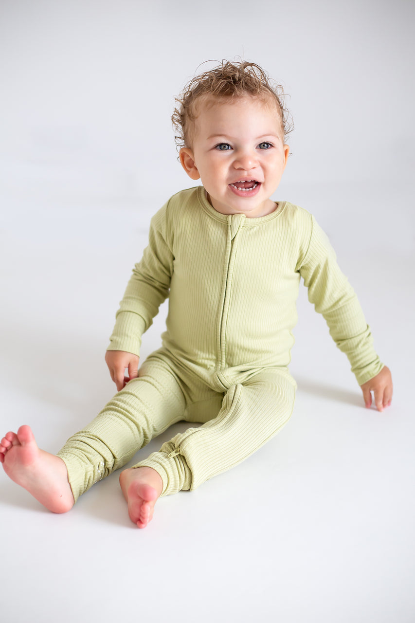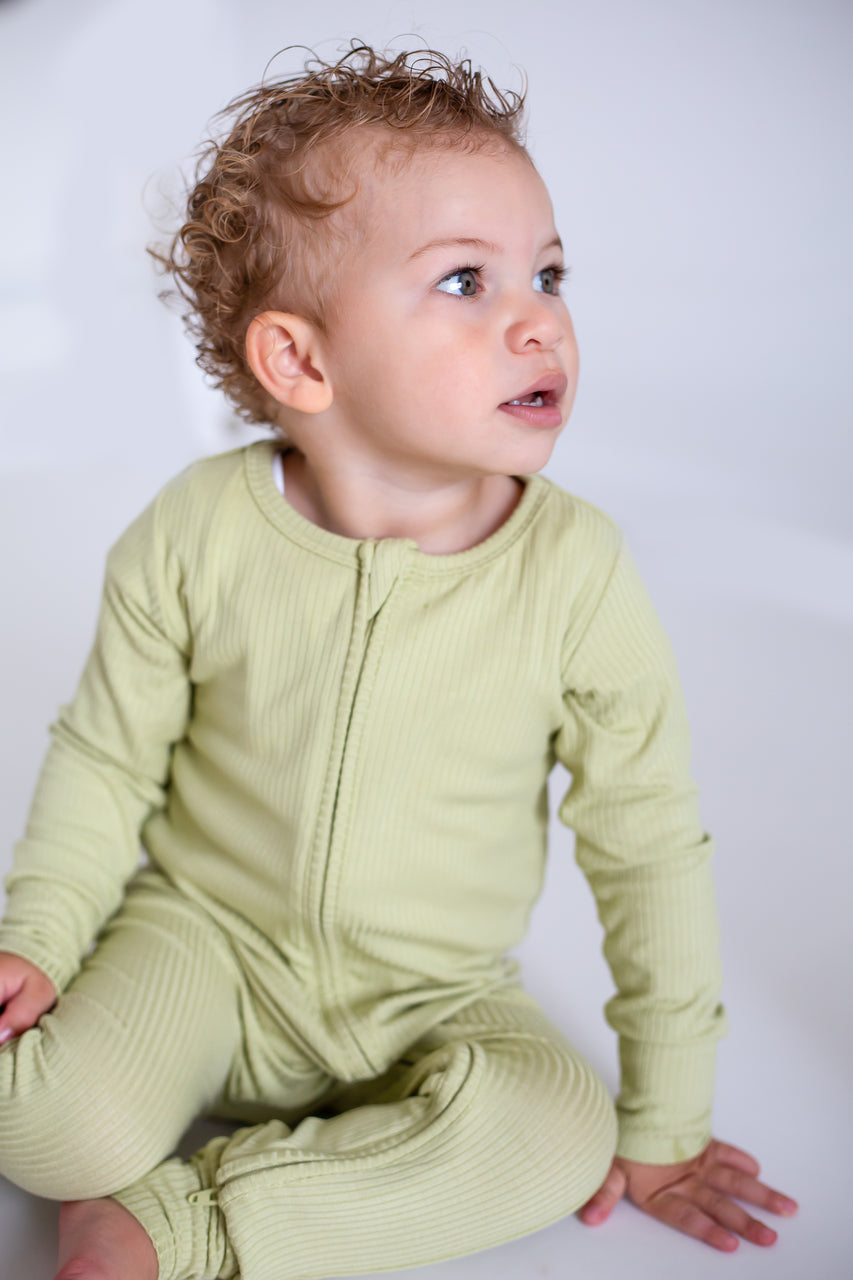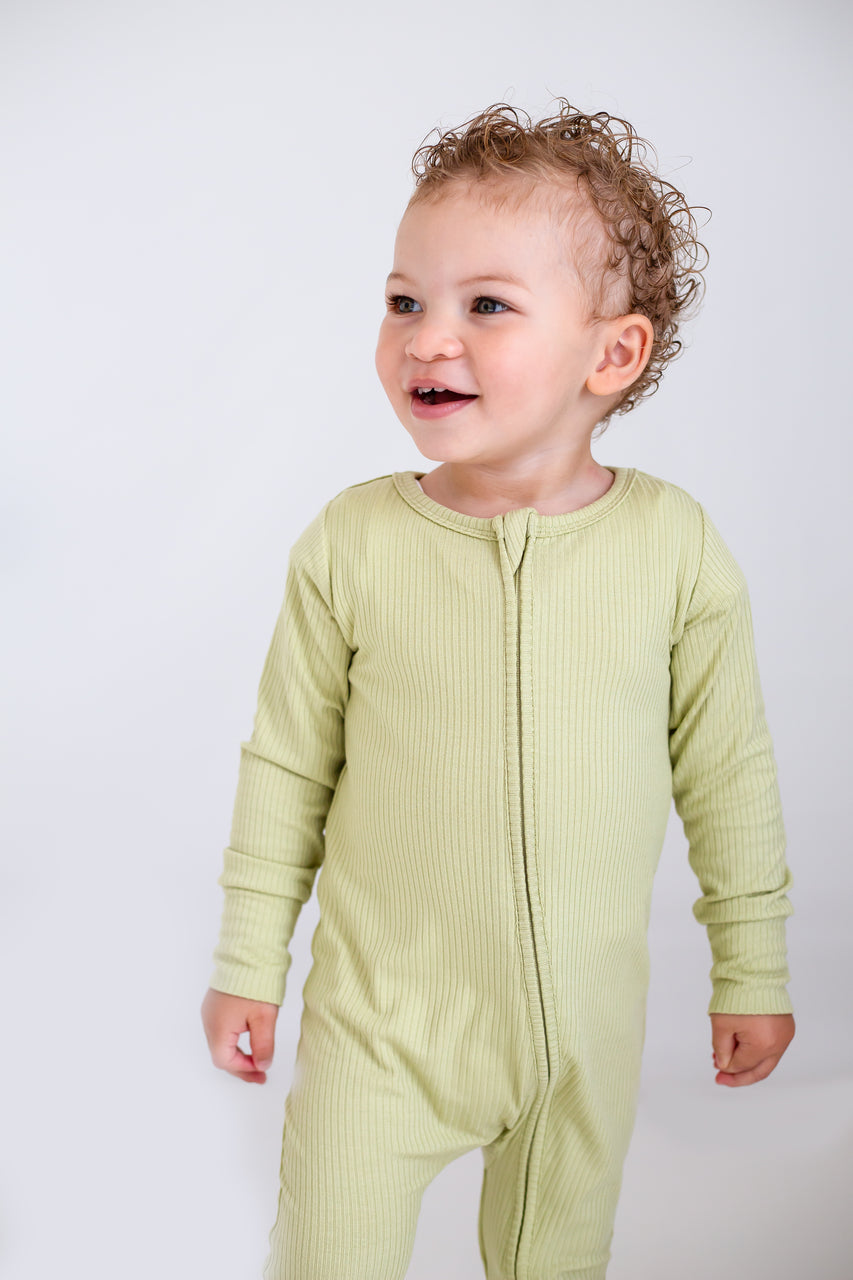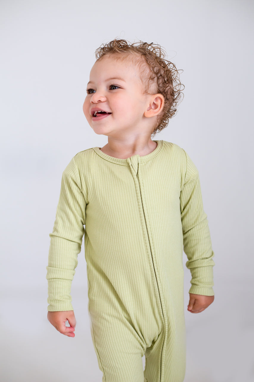 Grüner gerippter Schlafanzug aus Bambus mit Reißverschluss, einteilig