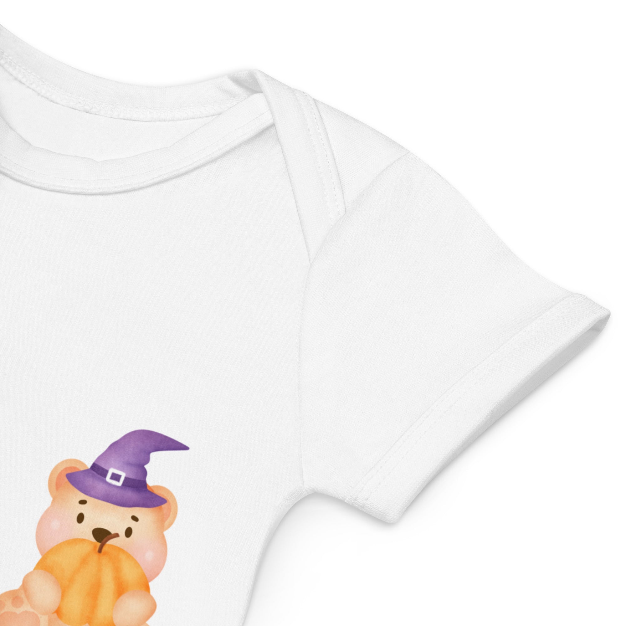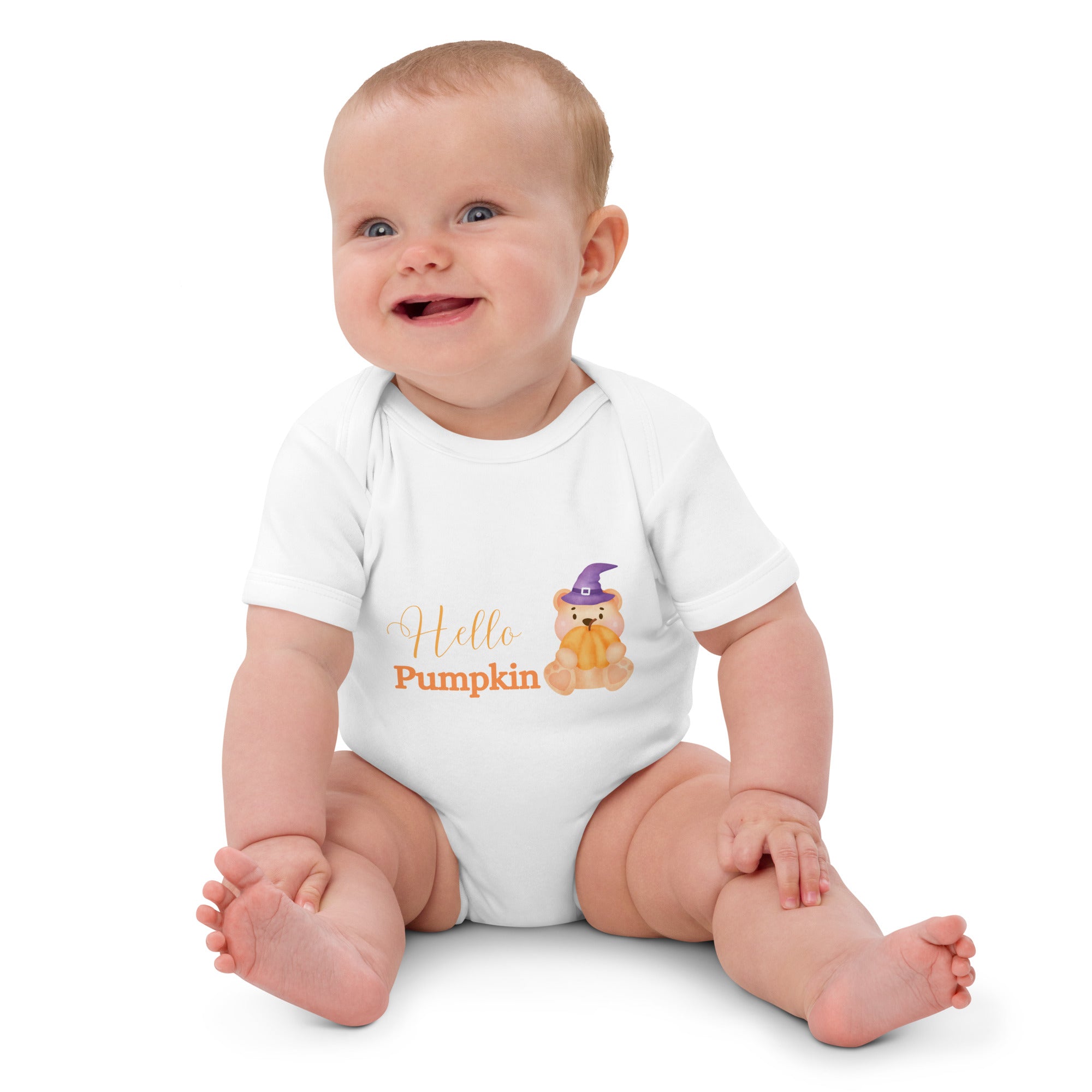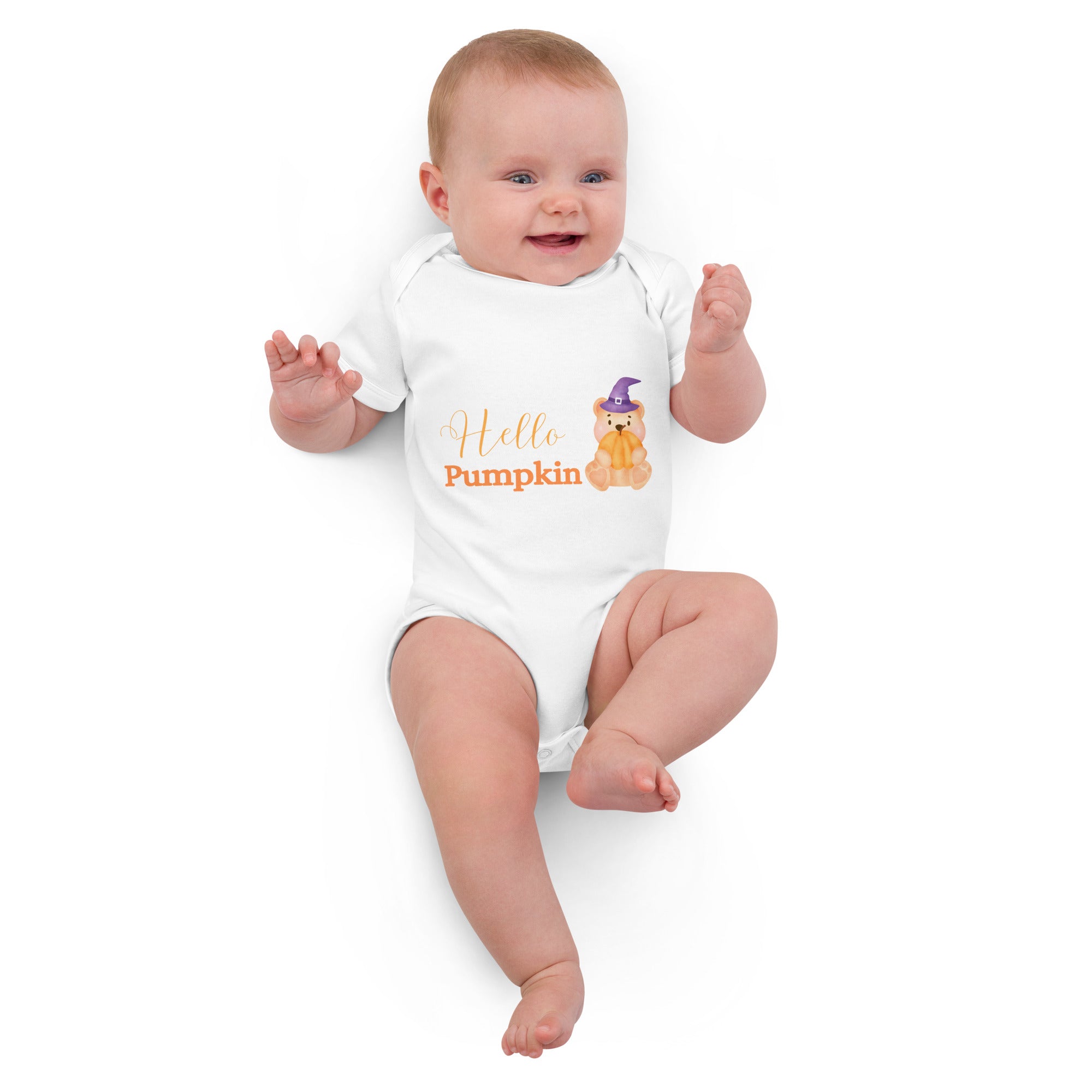 Introducing the Cozy Crew Club’s "Hello Pumpkin Bodysuit" – the perfect blend of festive fun and personalized charm for your little one's first Halloween! This delightful white bodysuit features an adorable pumpkin bear design, capturing the spirit of the season with a touch of whimsy.