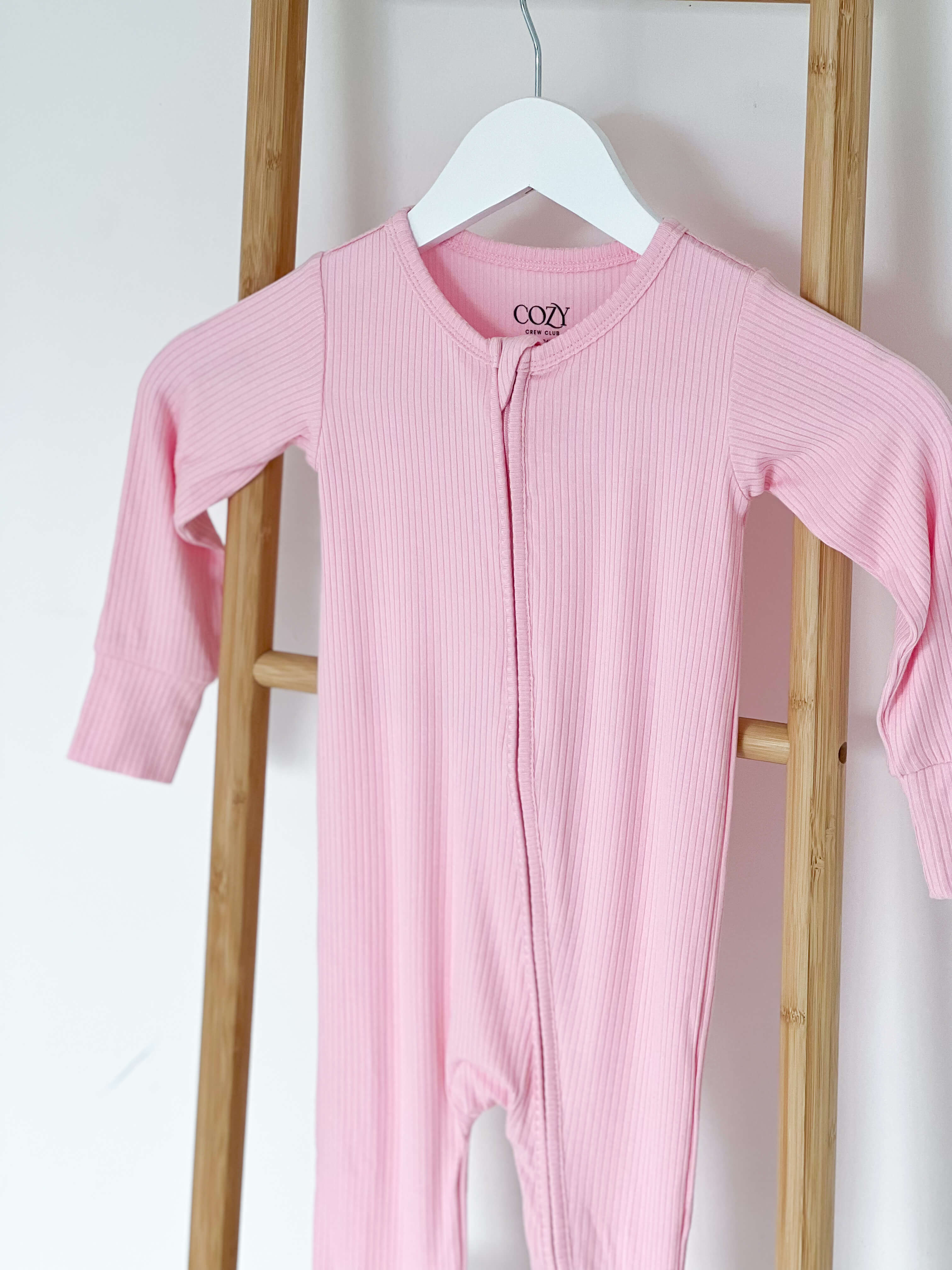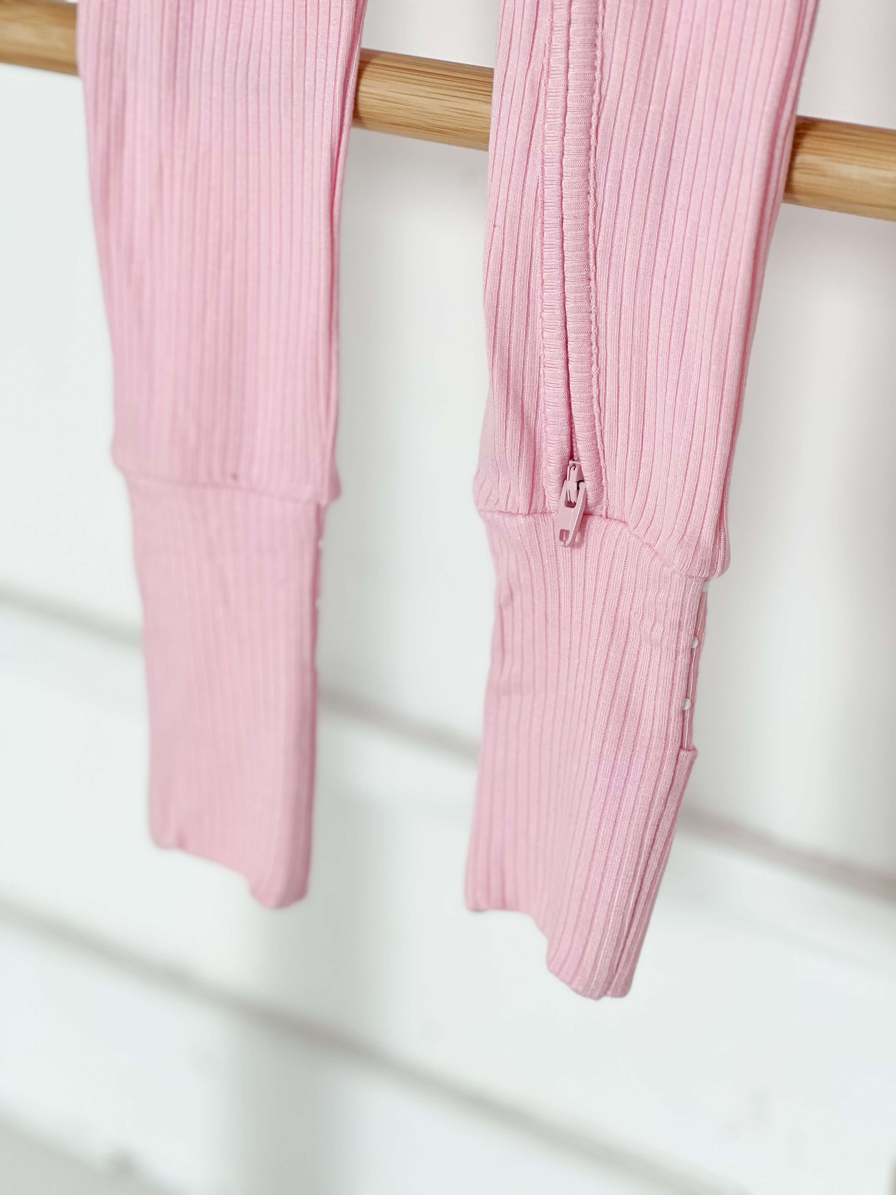 Rosa, gerippter Schlafanzug aus Bambus mit Reißverschluss, einteilig