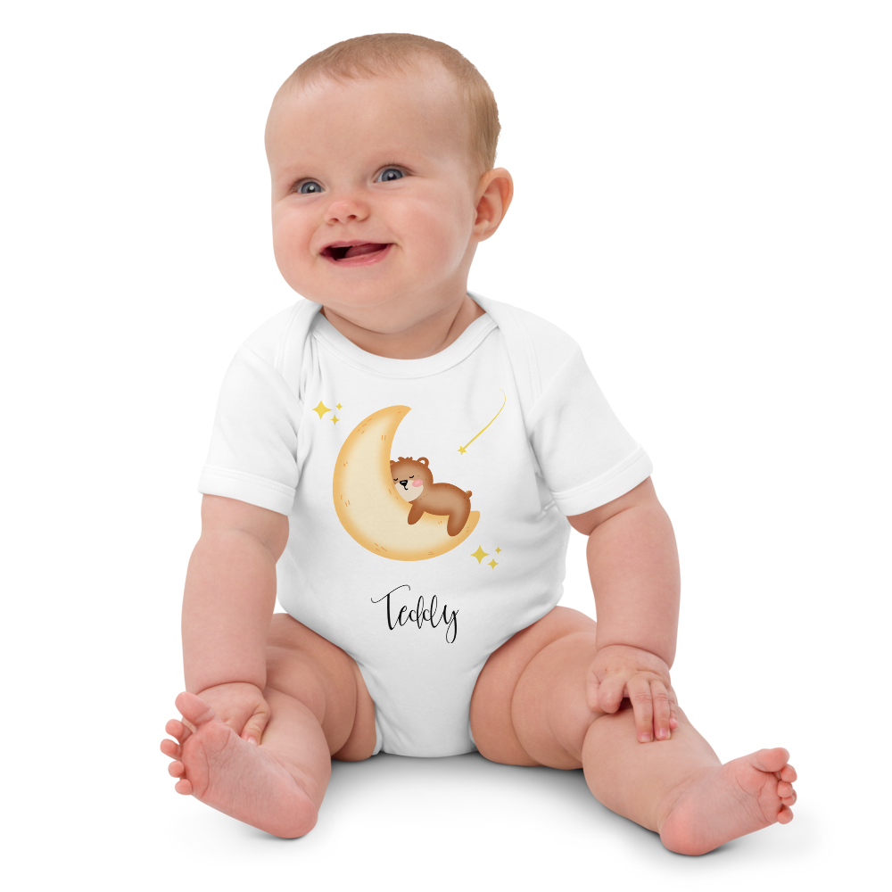 Wir präsentieren den bezaubernden personalisierten Body „Dreaming Bear“ des Cozy Crew Club, eine traumhafte Ergänzung für jede Babygarderobe und ein perfektes Geschenk für strahlende Eltern. Dieser entzückende weiße Strampler wurde mit viel Liebe und Liebe zum Detail gefertigt und zeigt einen ruhigen Teddybären, der friedlich auf einer Mondsichel ruht, umgeben von funkelnden Sternen, und ein Gefühl der Ruhe und Ehrfurcht hervorruft.