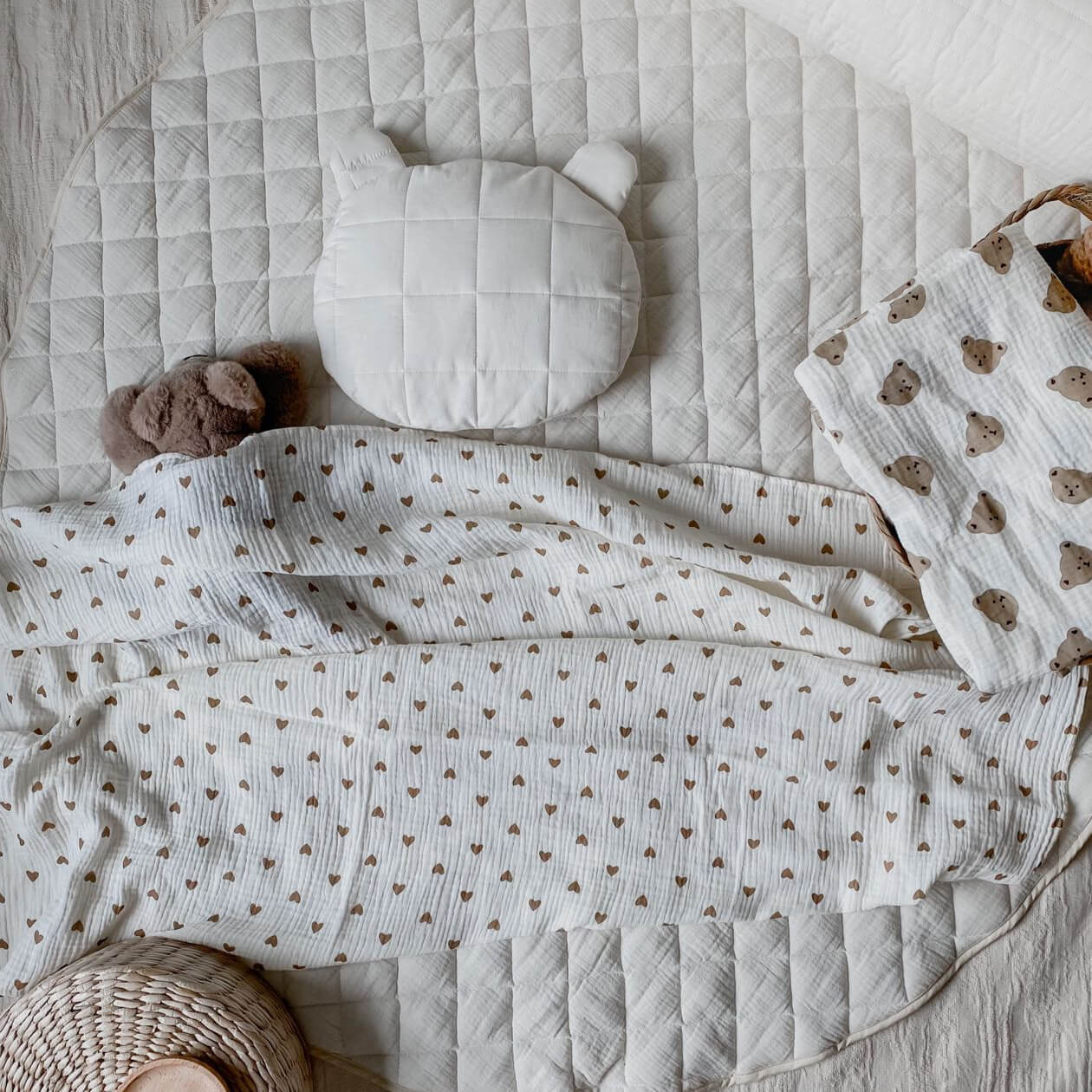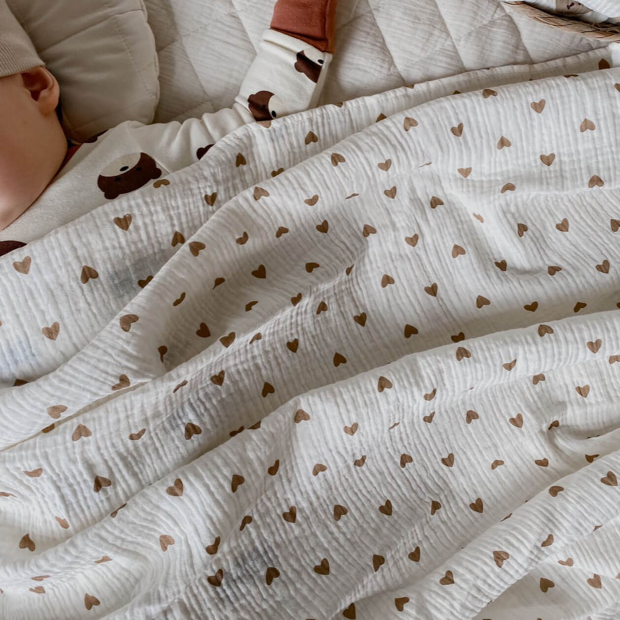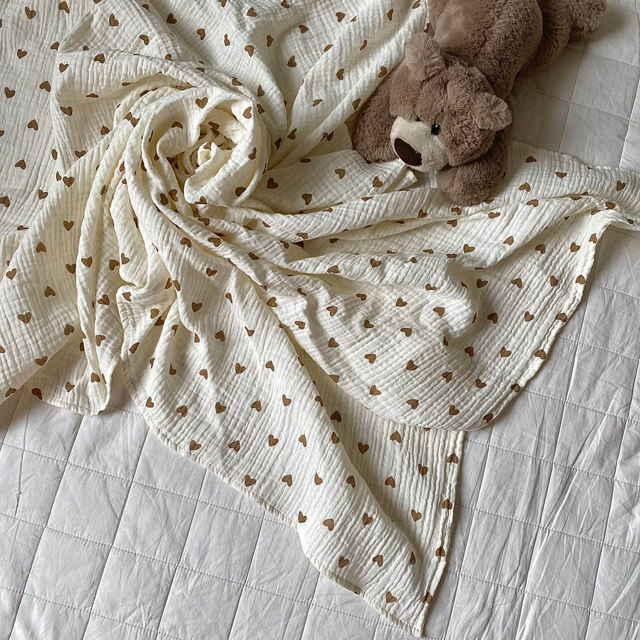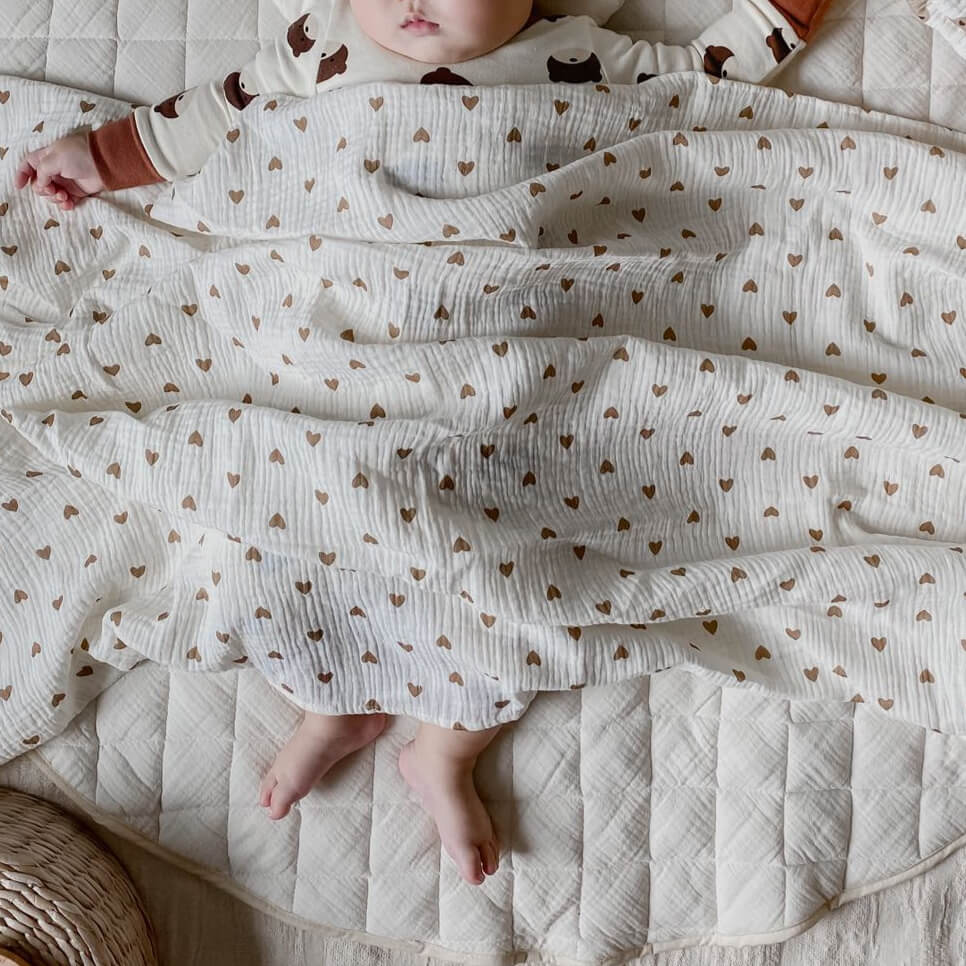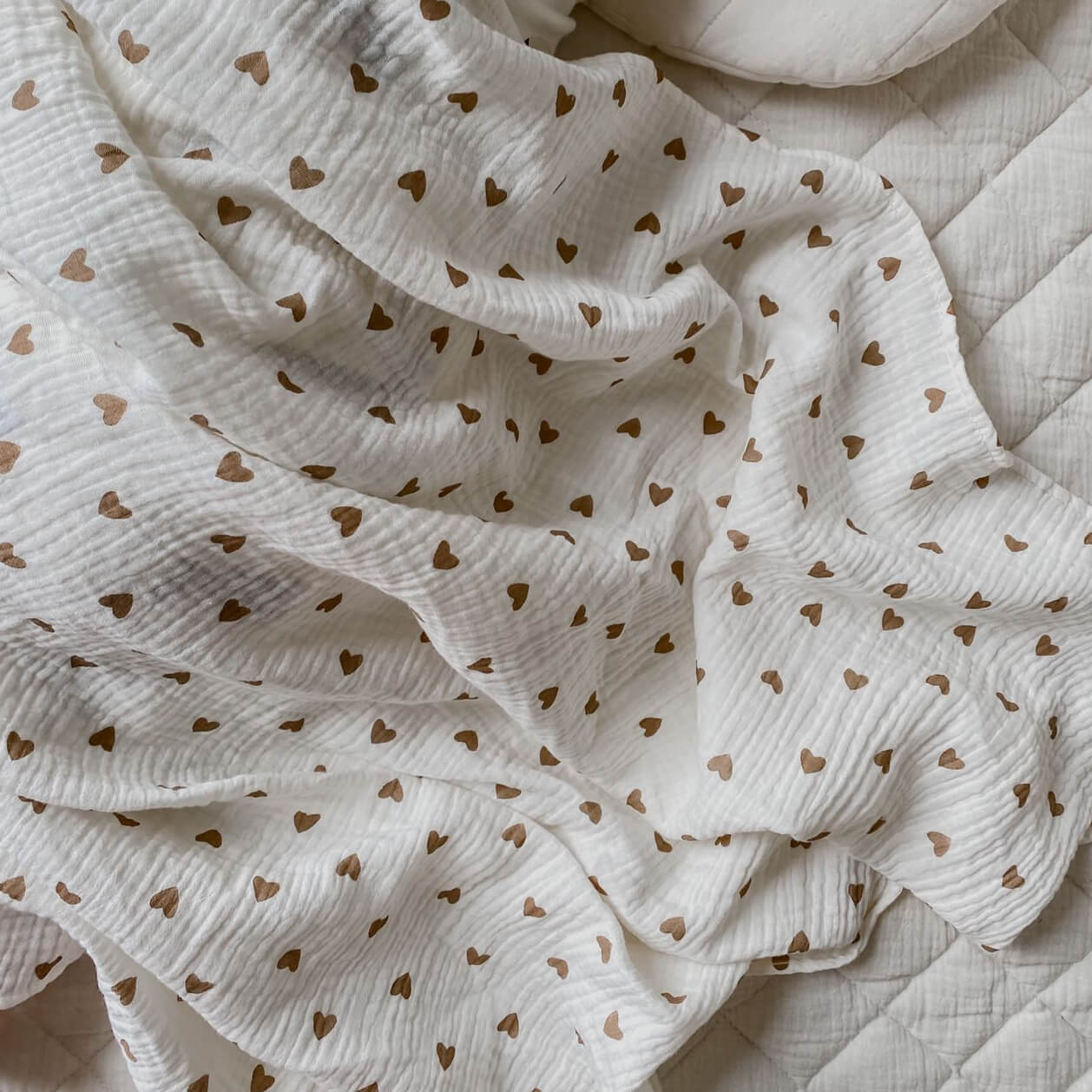 Die Love Heart-Decke ist so konzipiert, dass Sie und Ihr Baby jeden besonderen Moment des Familienlebens bequem genießen können. Sie besteht aus unserer 100 % Musselin-Baumwolle, fühlt sich also weich an, ist aber strapazierfähig und hält ewig. Die Decke ist doppellagig, was sie perfekt für die kälteren Monate macht, um sie als Decke für die Kleinen oder als Schal für die Eltern zu verwenden. Die großzügige Größe macht sie praktisch für unzählige Verwendungszwecke, vom diskreten Stillen bis hin zu einer Spielmatte für unterwegs, einer Sommerdecke oder als perfektes Geschenk. Sie sind hochwertig, atmungsaktiv, strapazierfähig und pflegeleicht.