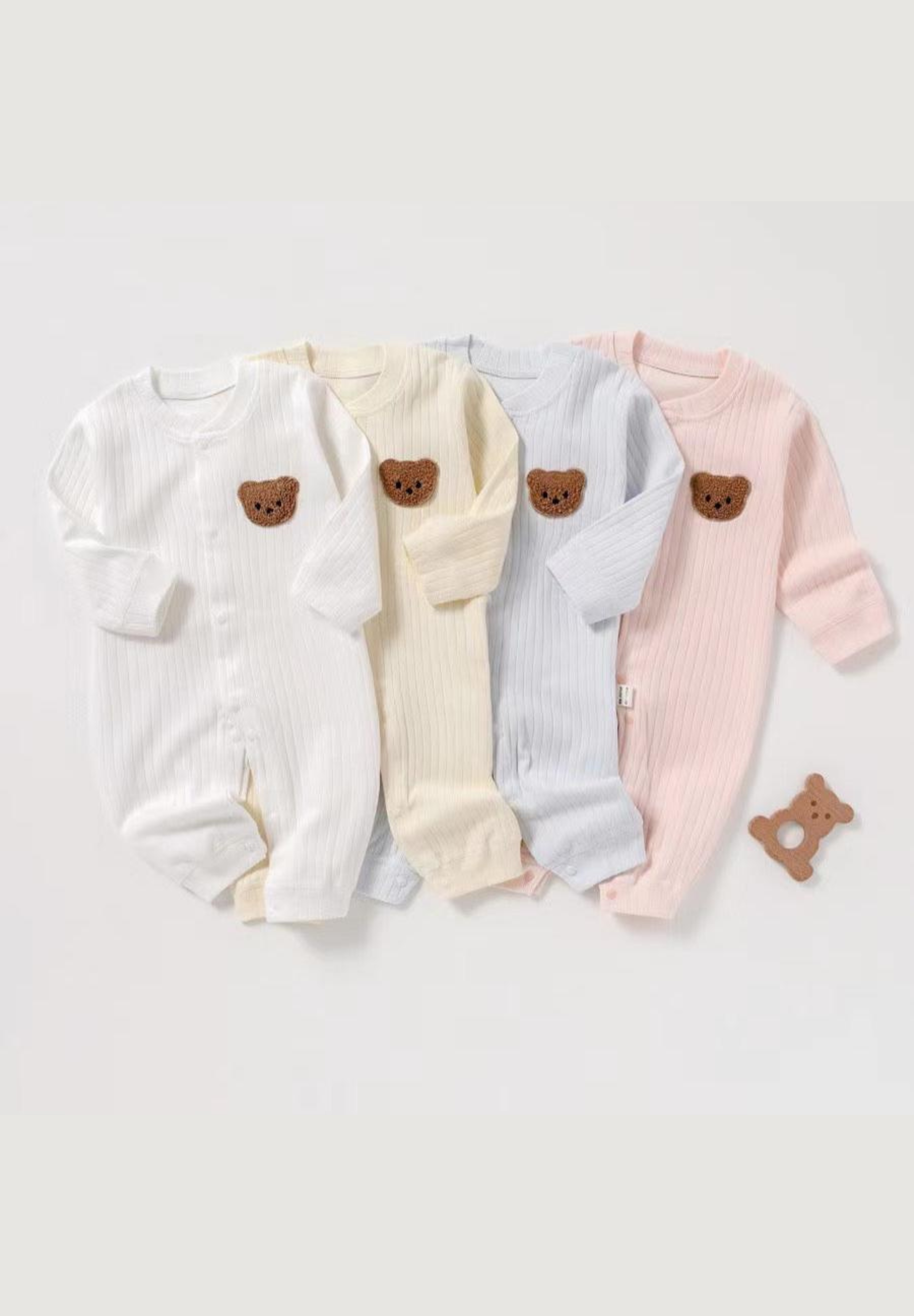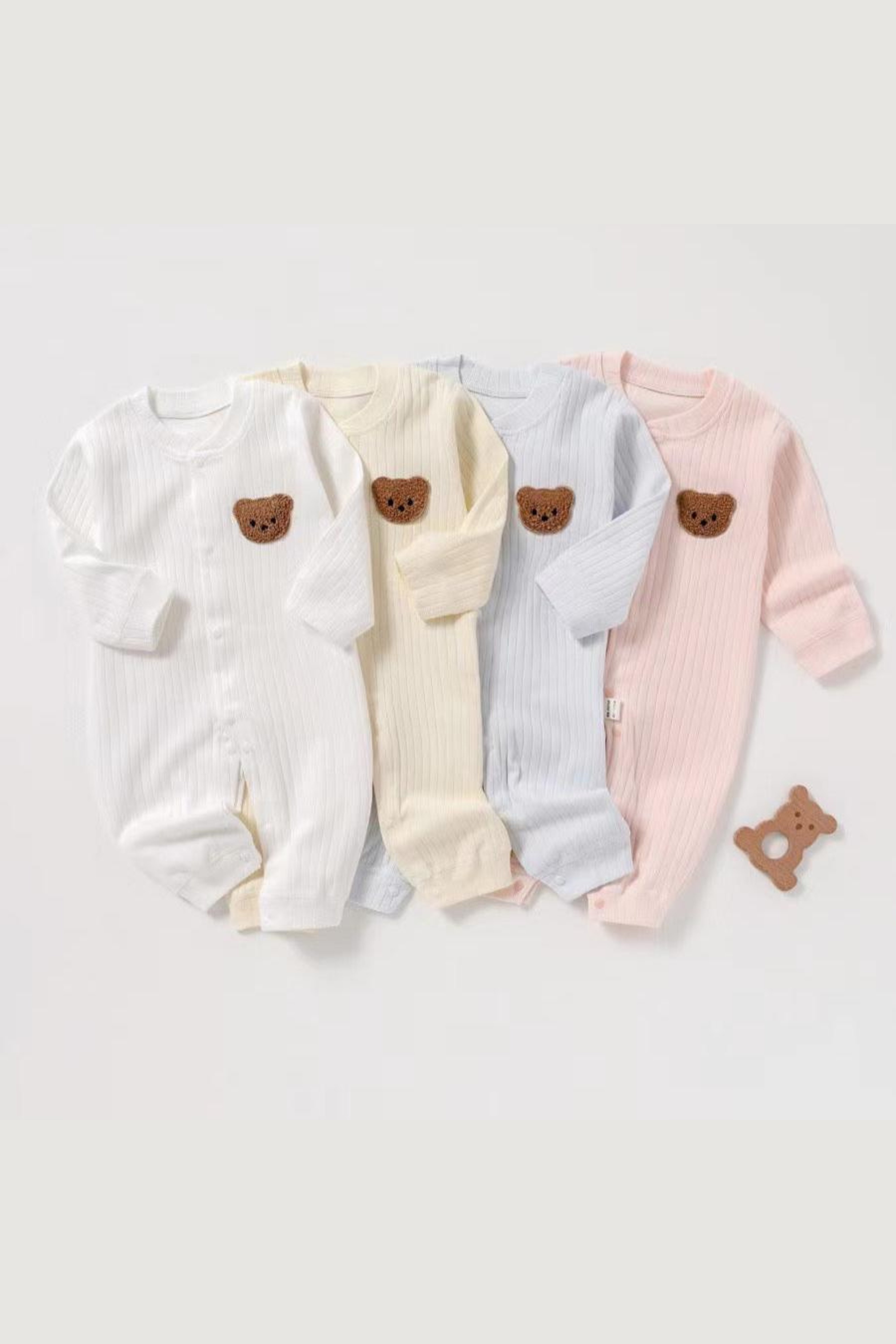 Hüllen Sie Ihren Kleinen in ultimative Gemütlichkeit mit unserem Ribbed Bear Romper, erhältlich in vier entzückenden Pastelltönen: Weiß, Blau, Rosa und Gelb. Dieser entzückende Romper aus weicher, gerippter Baumwolle ist perfekt zum Spielen und für den Mittagsschlaf geeignet und bietet sanften Komfort und Bewegungsfreiheit. Mit einem bezaubernden Teddybär-Aufnäher auf der Brust verleiht er eine verspielte Note, die Sie garantiert zum Lächeln bringt. Aus 100 % Baumwolle.