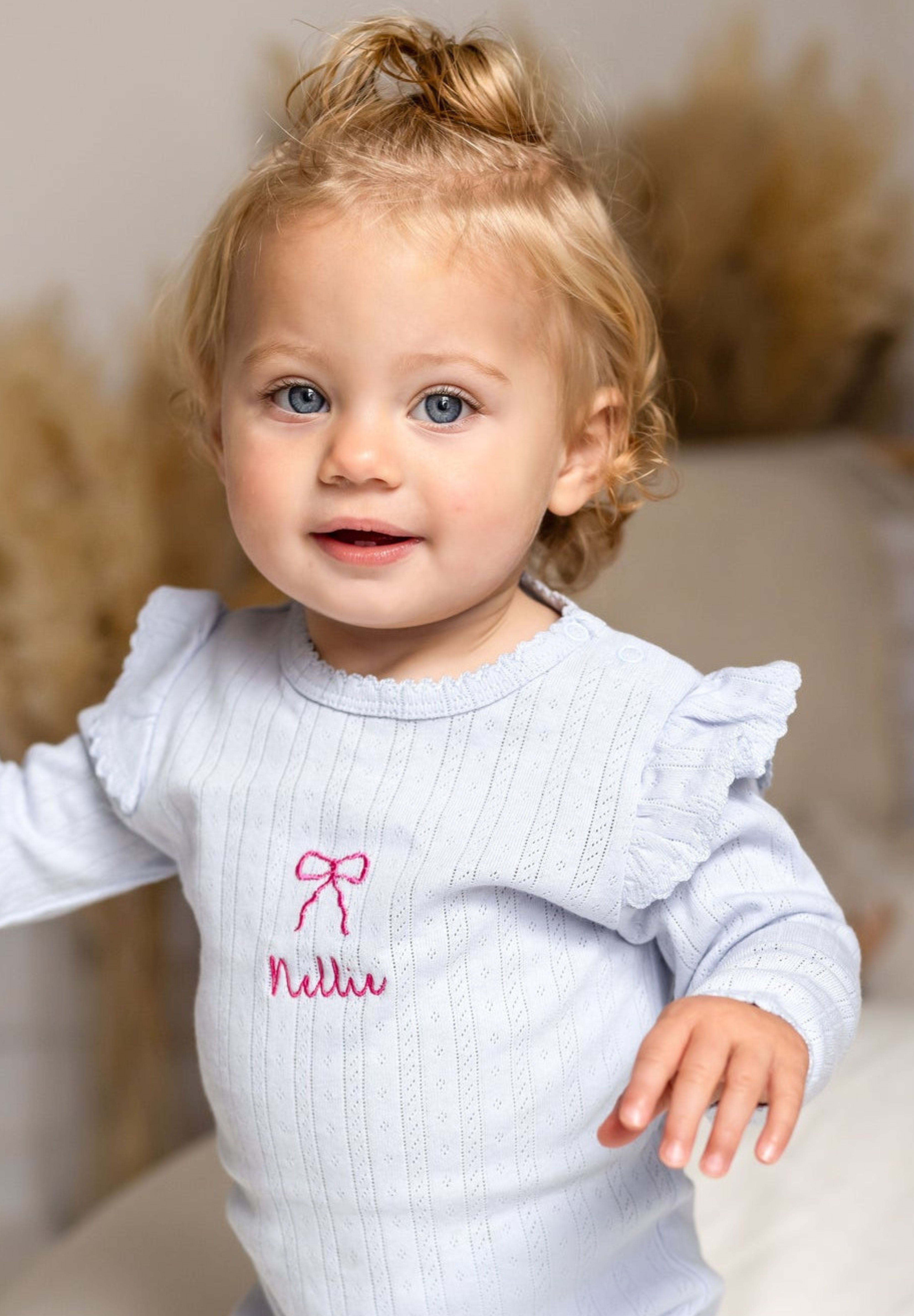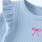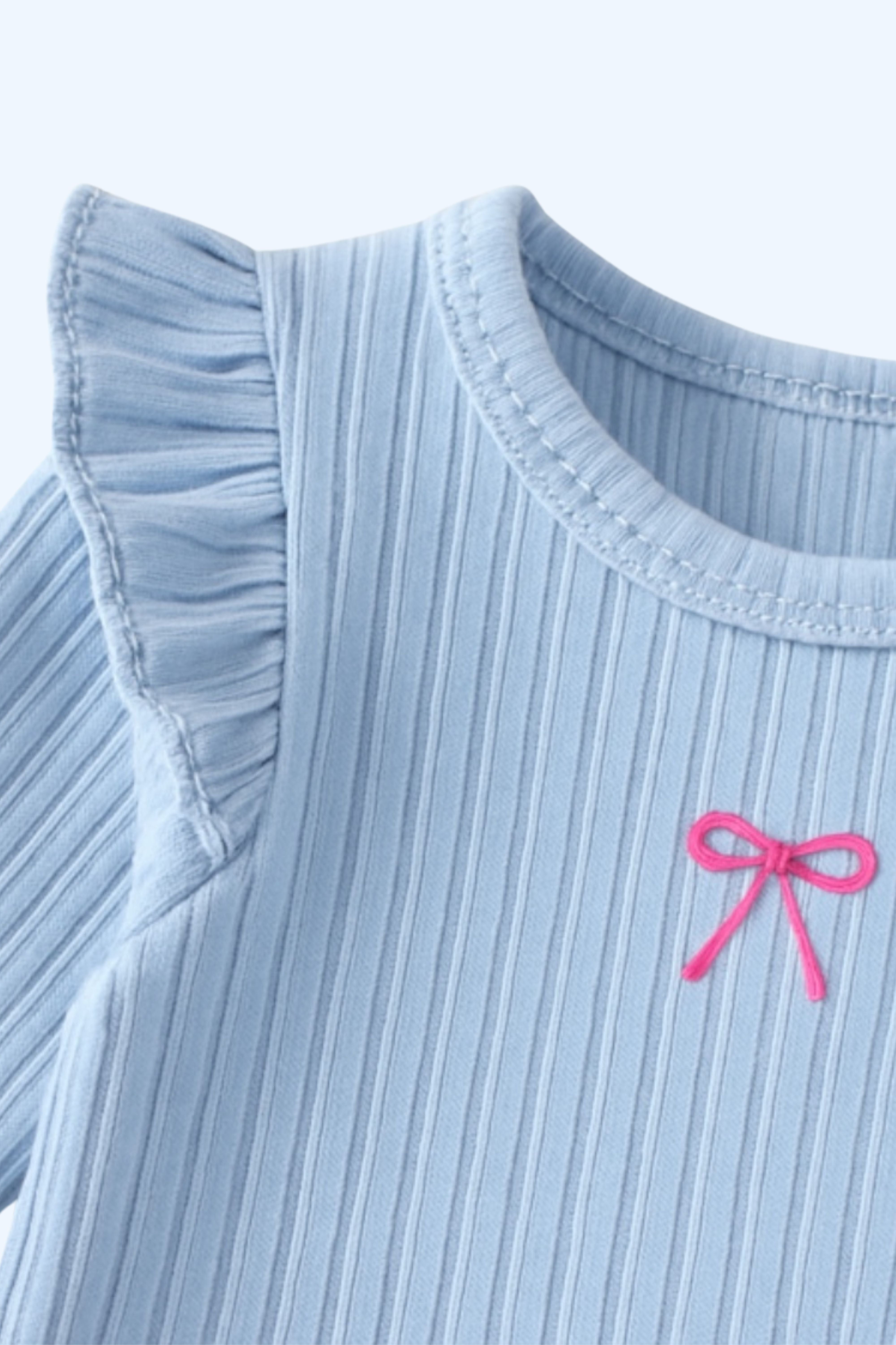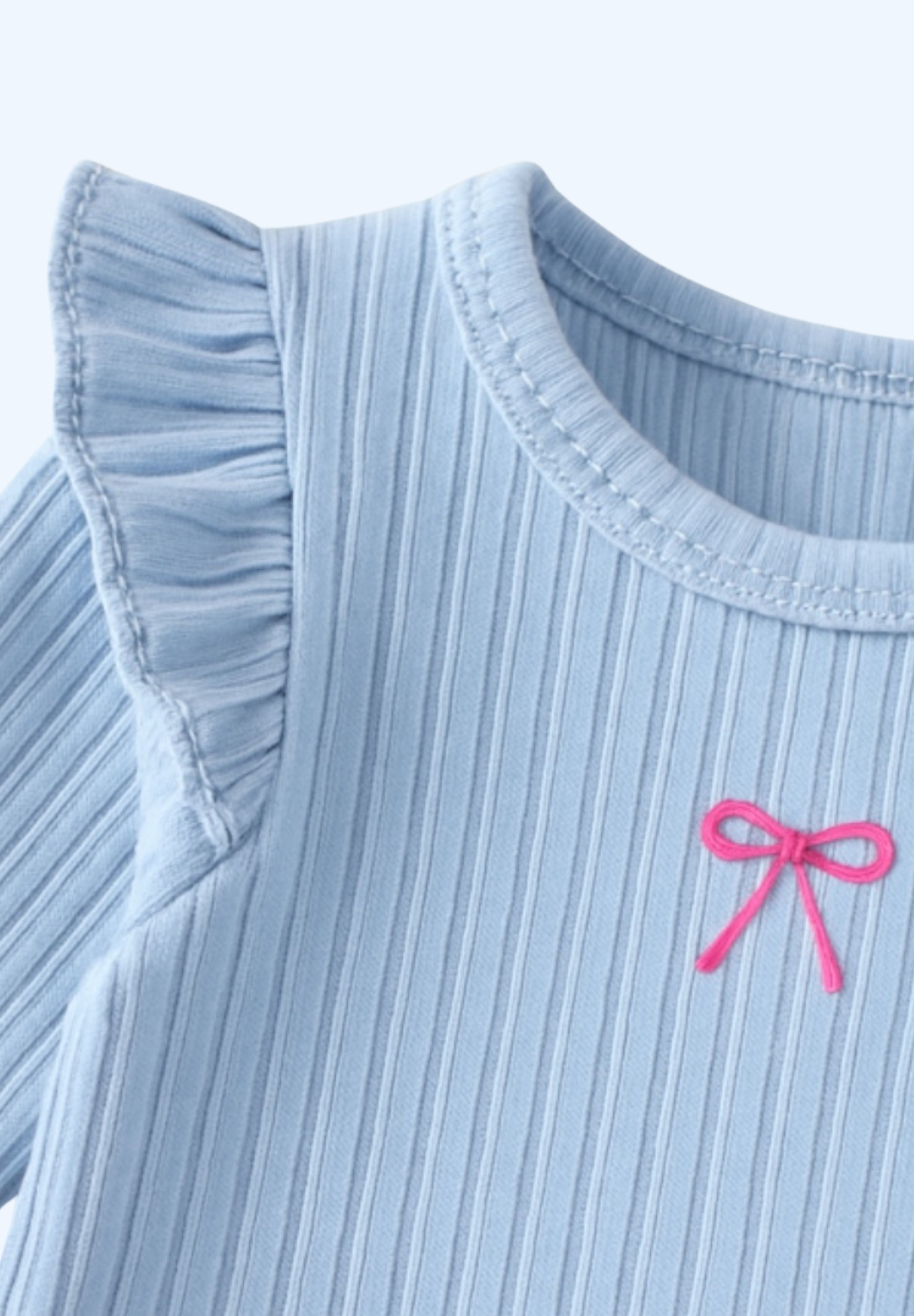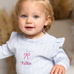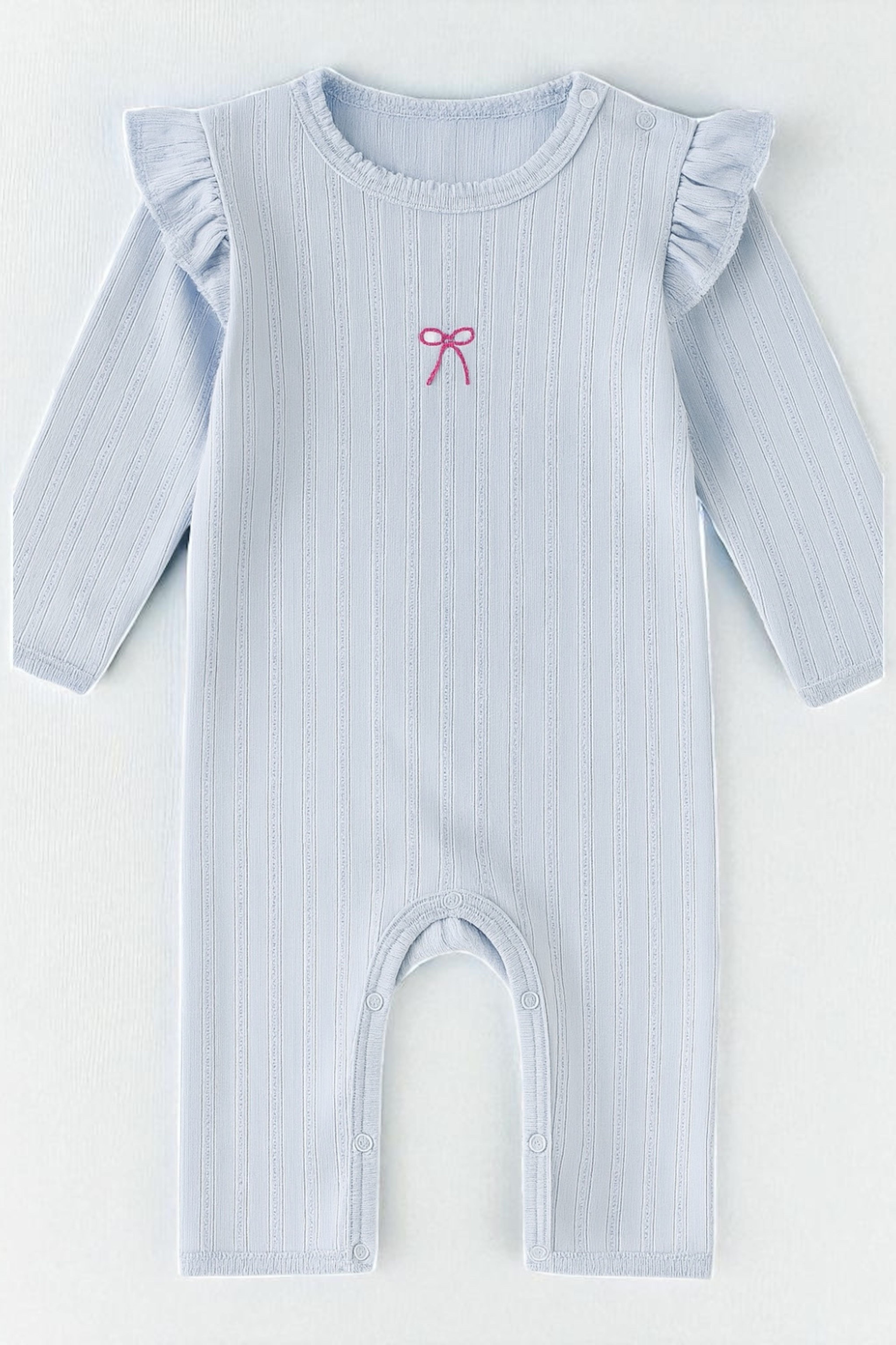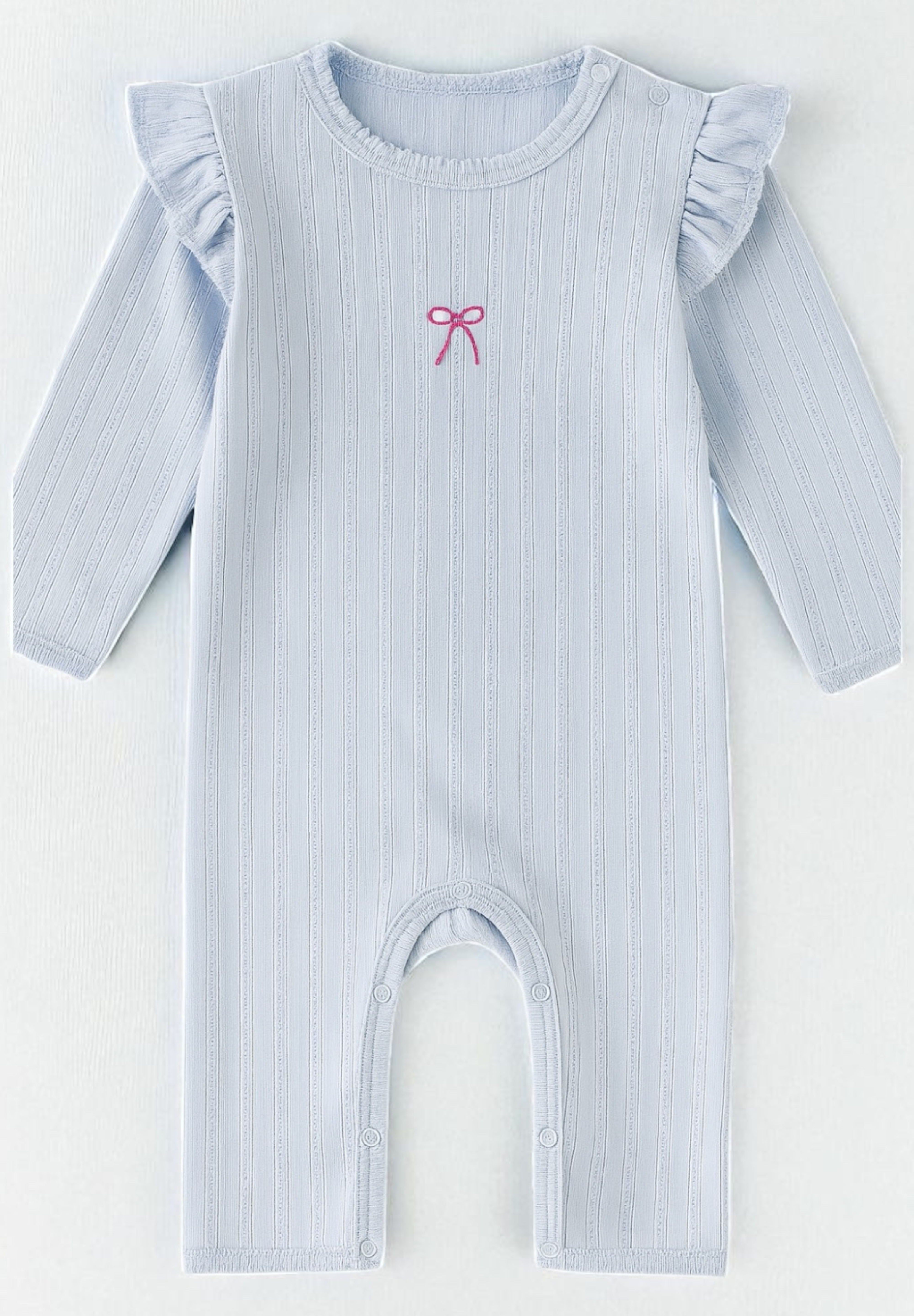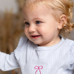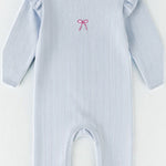 The Knitted Bow Frill Romper is the perfect mix of delicate detail and everyday comfort. Designed in a soft baby blue ribbed knit with a pop of pink bow embroidery, it’s made to make your mini feel (and look) absolutely adorable—from playtime to nap time and every cuddle in between.