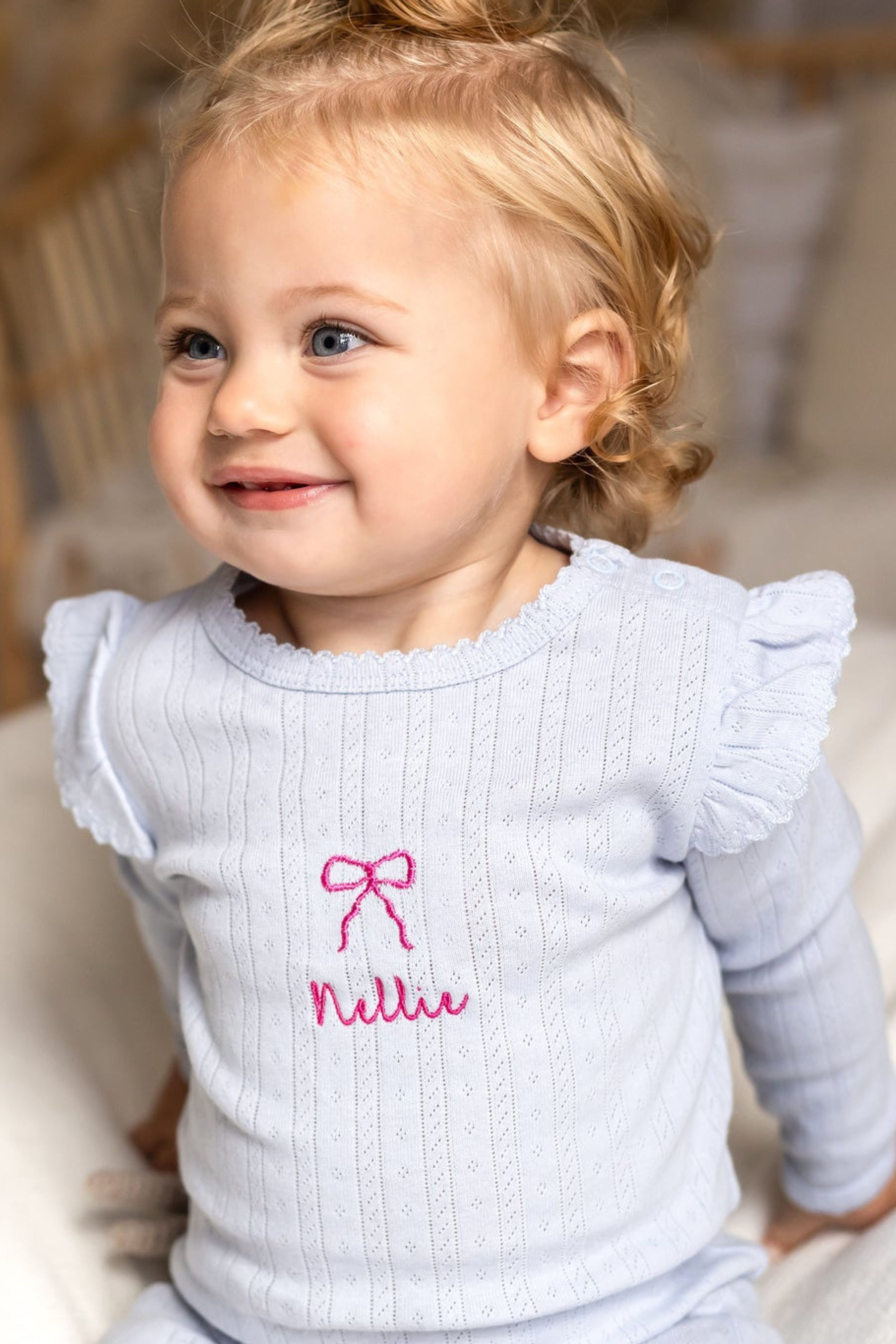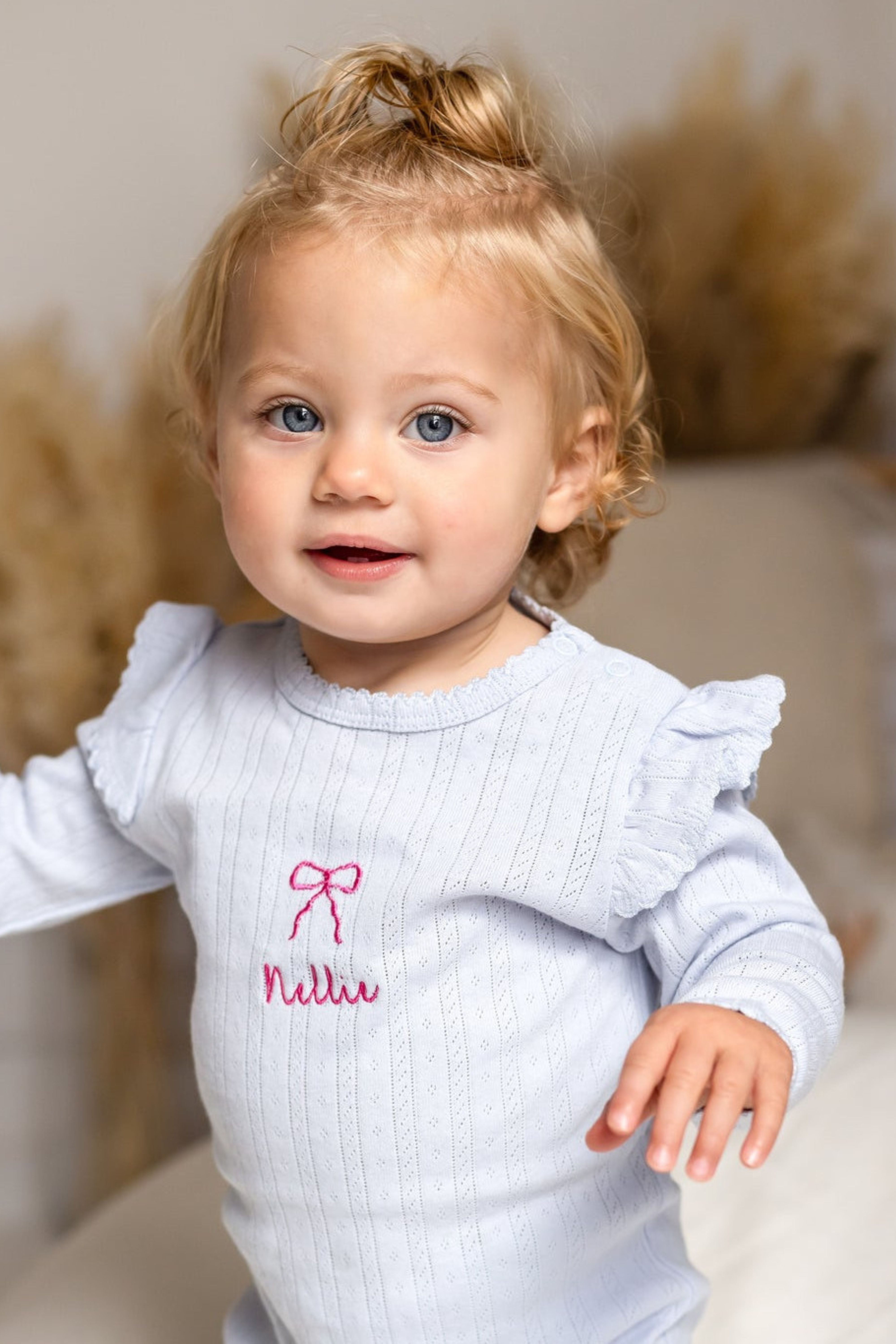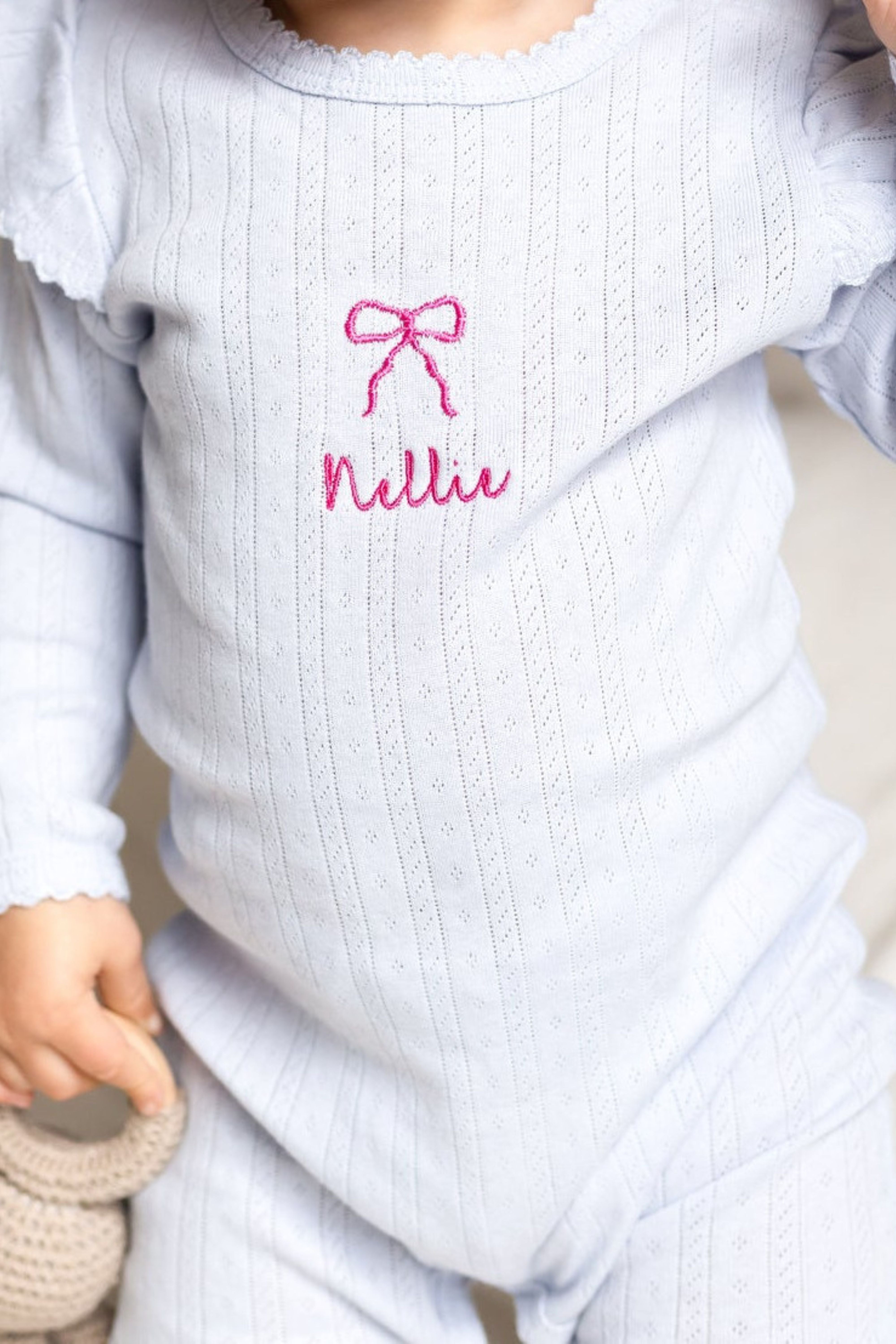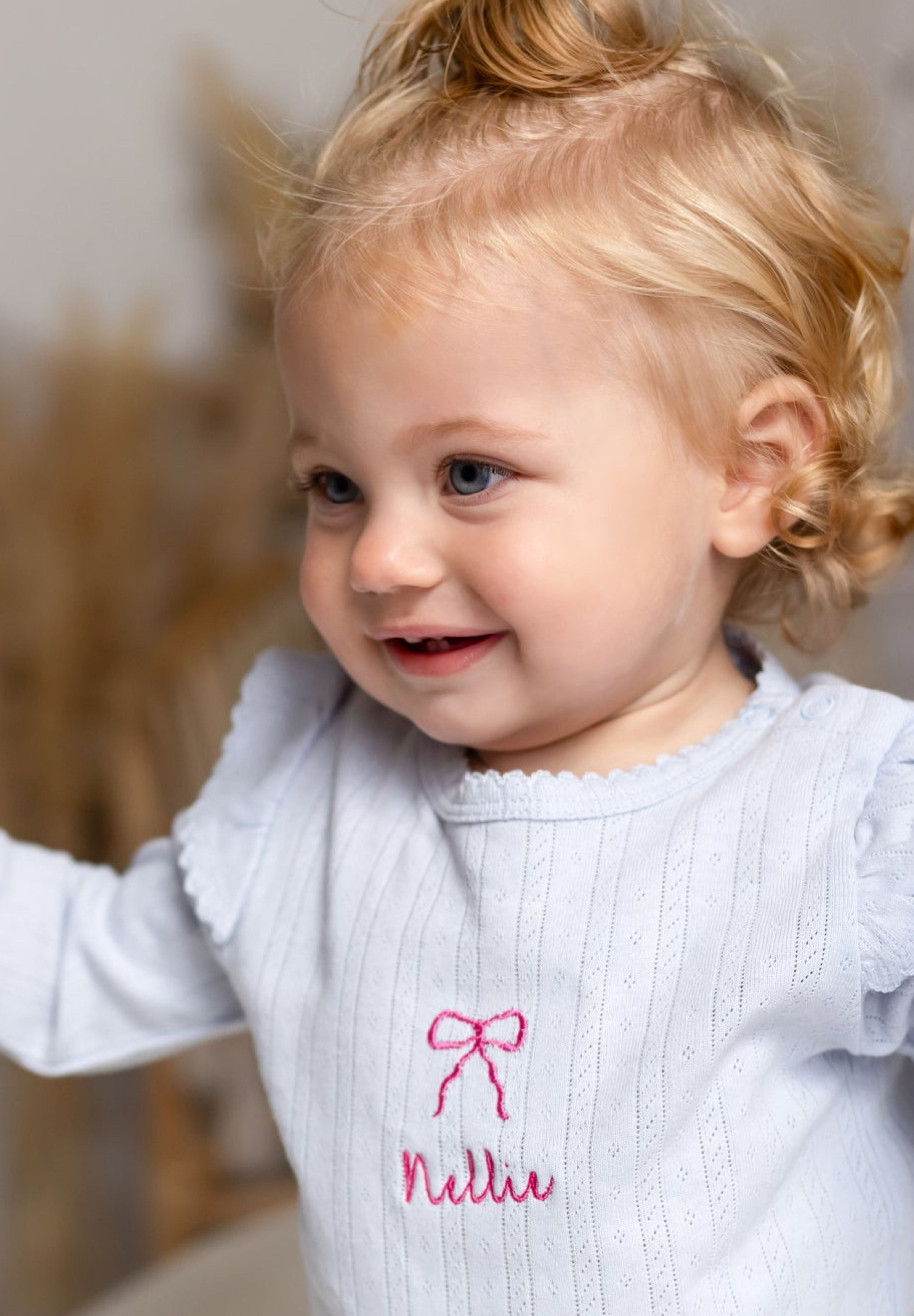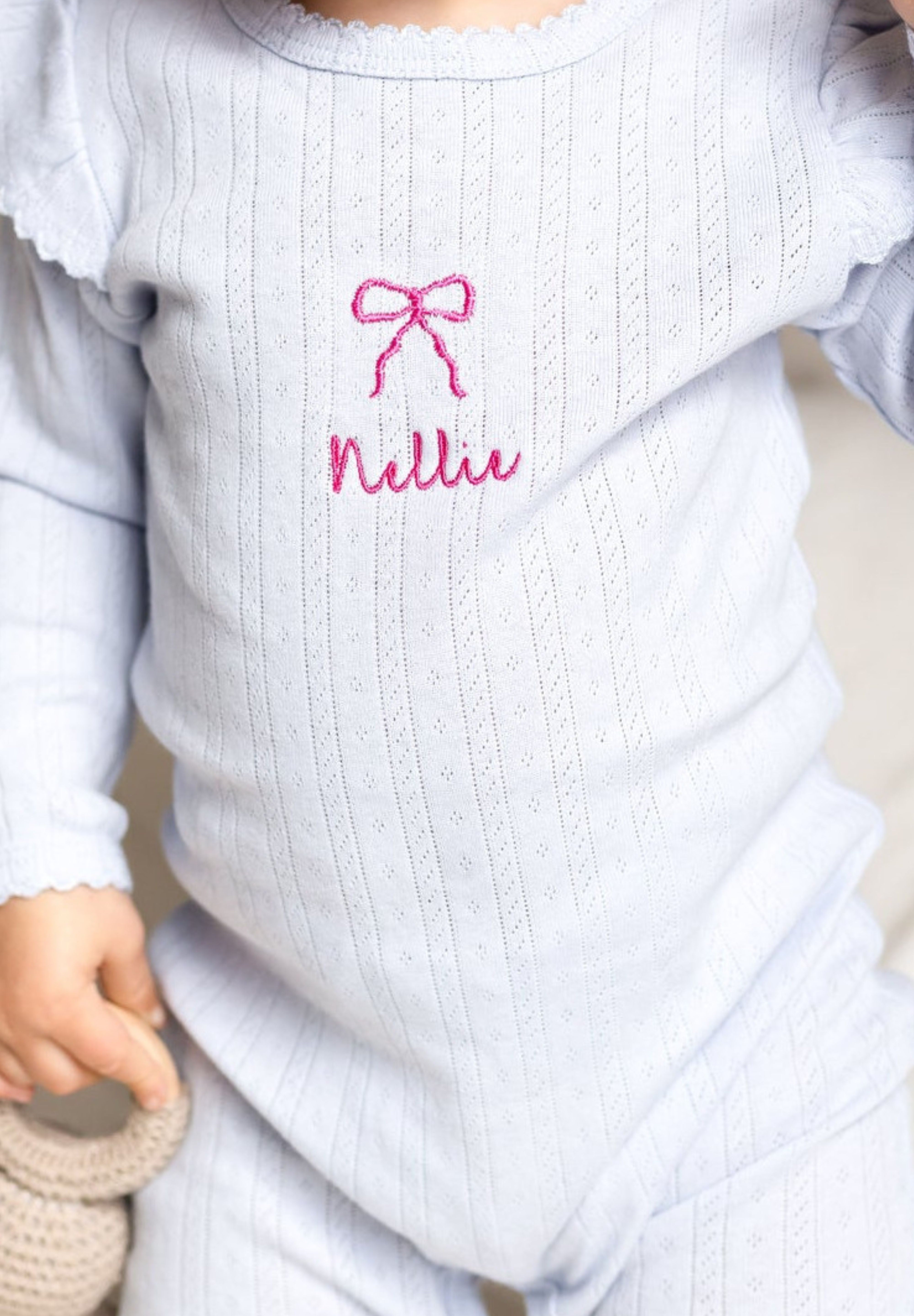 The Knitted Bow Frill Romper is the perfect mix of delicate detail and everyday comfort. Designed in a soft baby blue ribbed knit with a pop of pink bow embroidery, it’s made to make your mini feel (and look) absolutely adorable—from playtime to nap time and every cuddle in between.