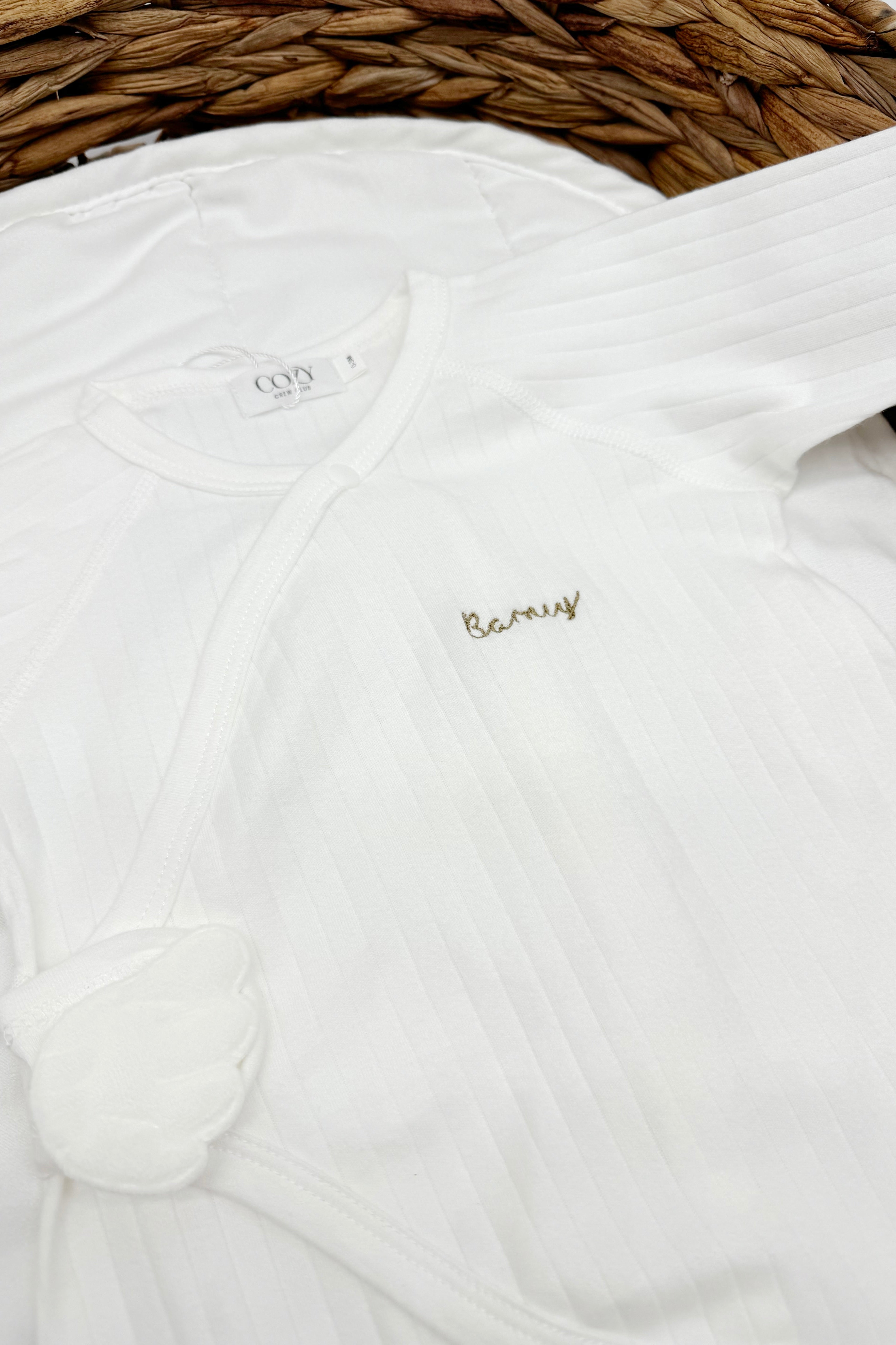 Der Angel Boucle Wrap Baby Grow Romper zeichnet sich durch ein zeitloses Design aus, das Eleganz und Schlichtheit ausstrahlt. Seine klassische Silhouette und die dezenten Details machen ihn zu einer vielseitigen Wahl für jeden Anlass, sei es ein besonderes Familientreffen oder ein entspannter Tag zu Hause.
