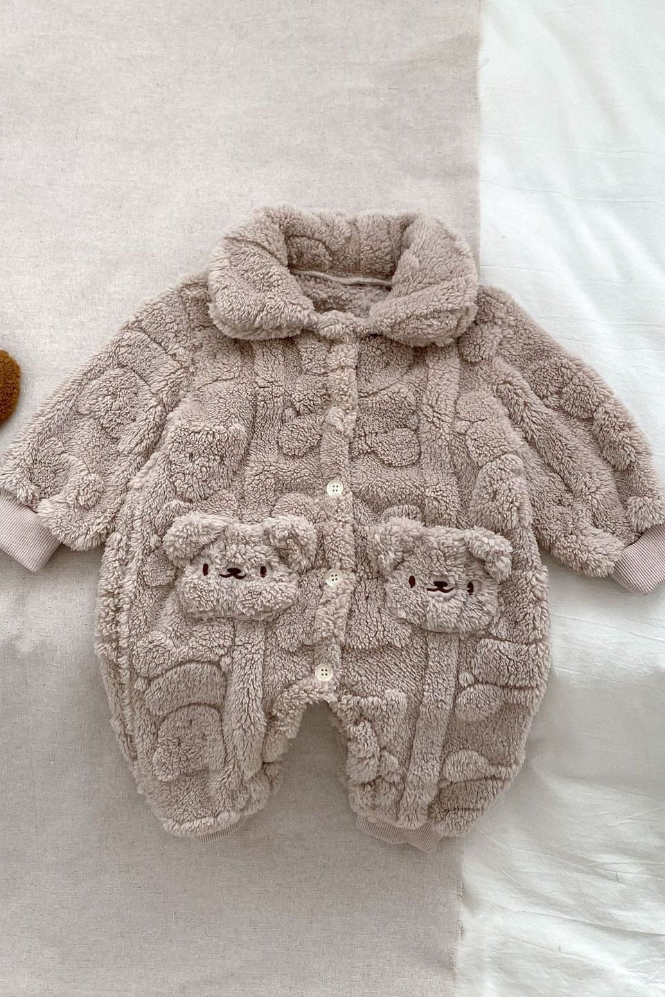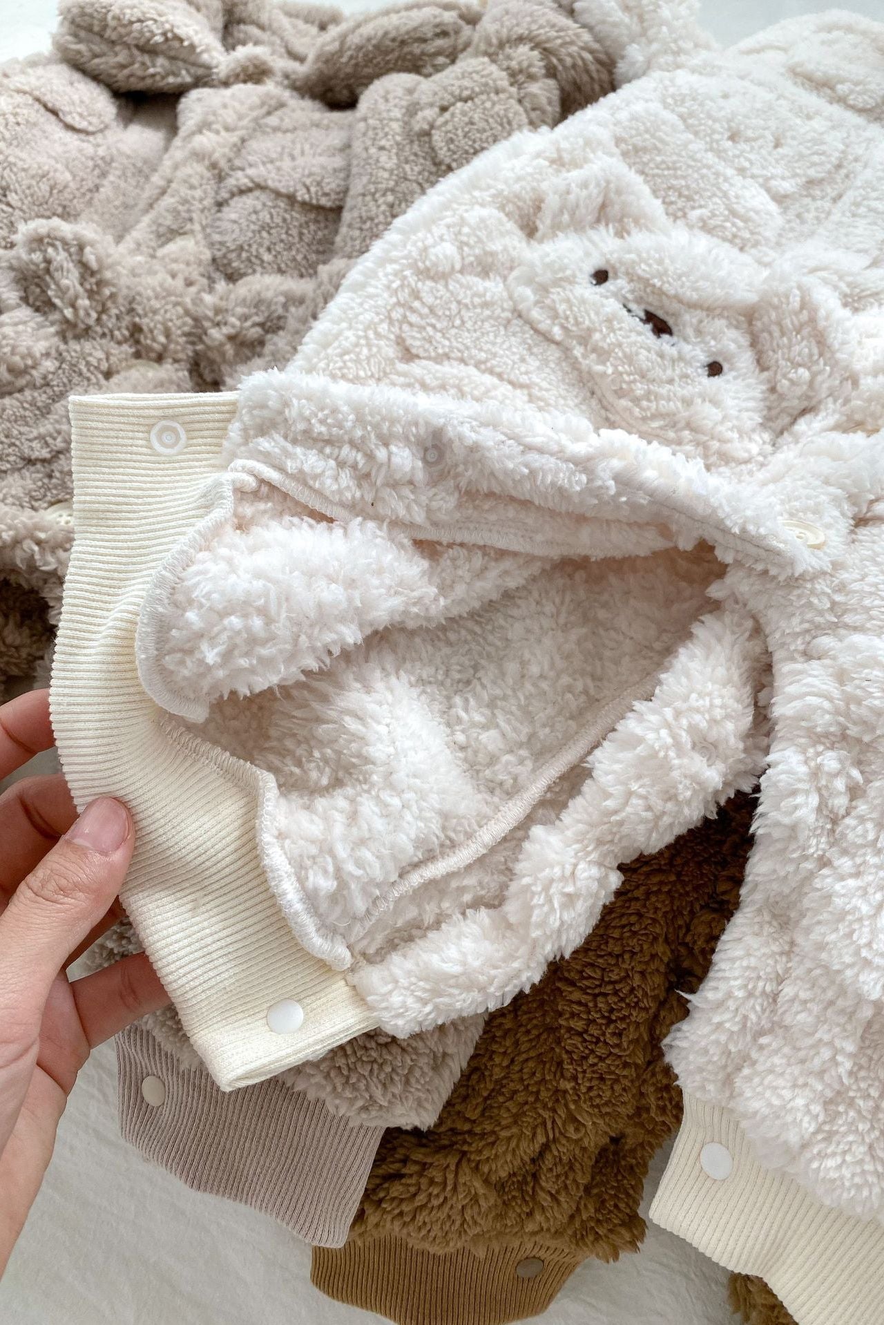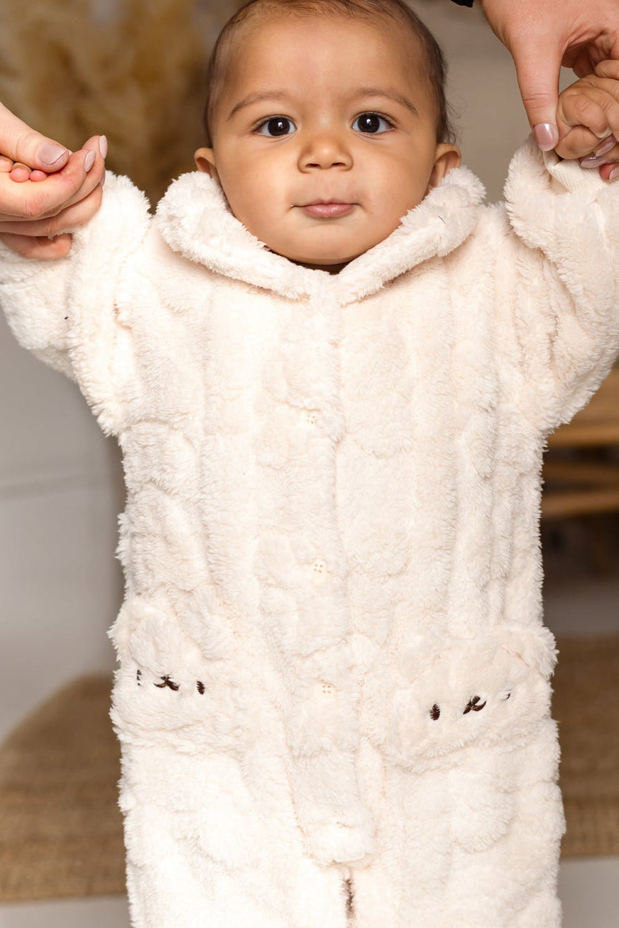 Verwandeln Sie Ihr Baby in ein süßes, wärmendes Bündel mit unserem flauschigen Strampler mit Pelzfutter aus Bärenfell – das ultimative, kuschelige Must-have für frostige Tage.