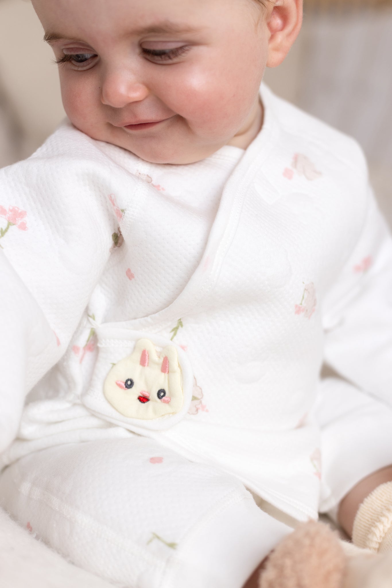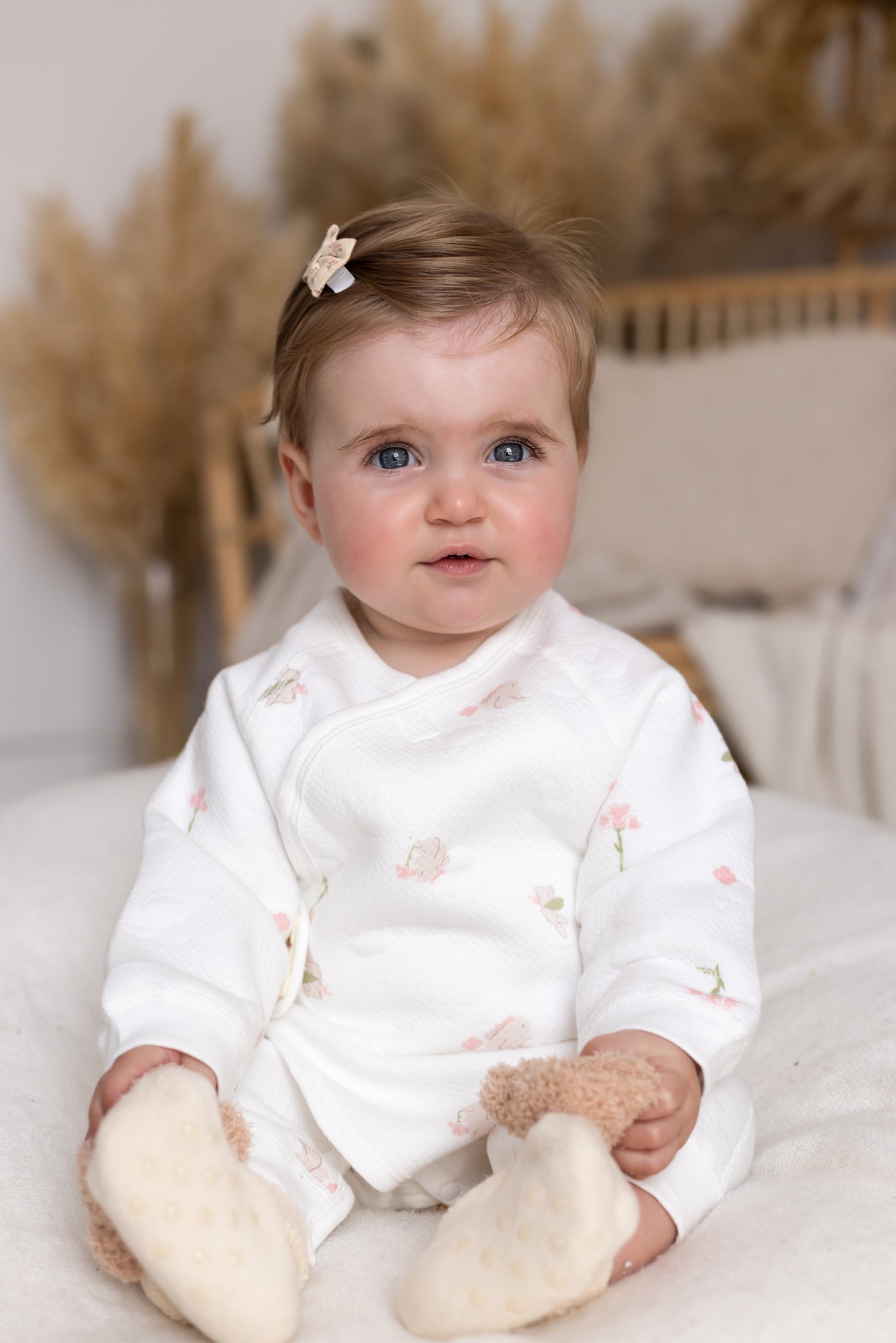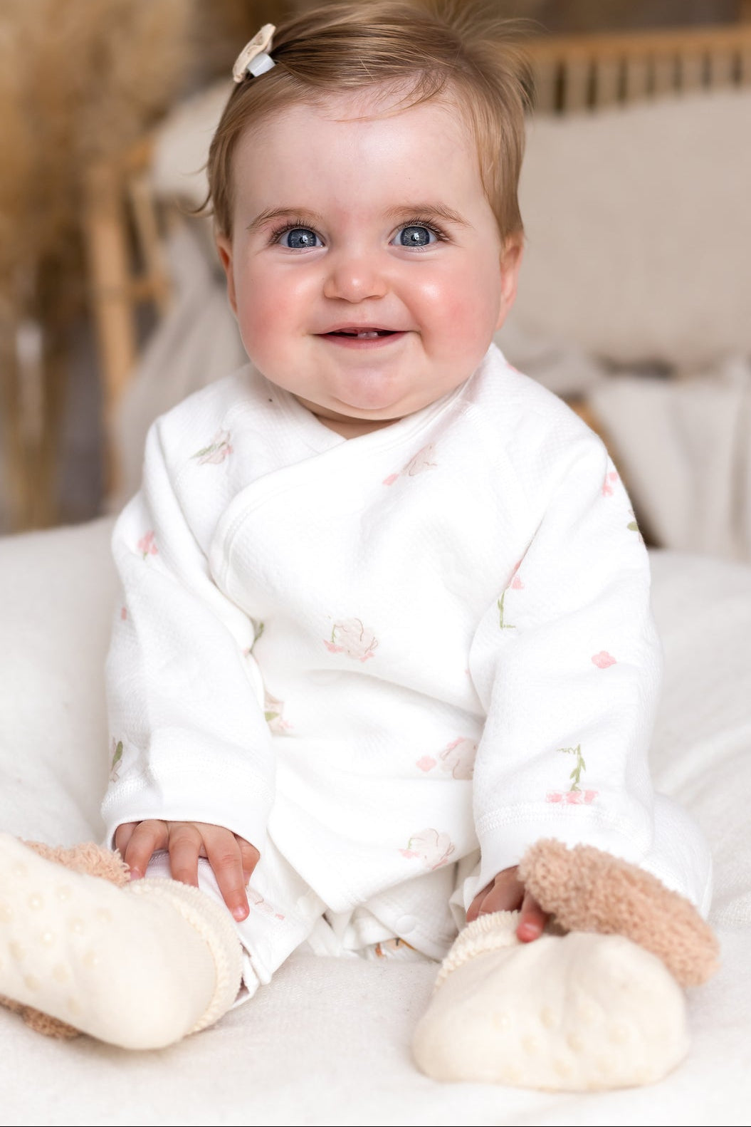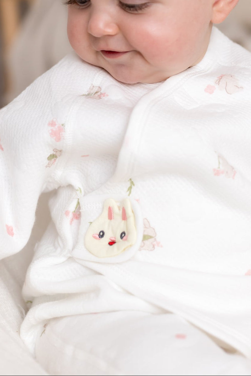 Hop into cozy with The Snuggle Bun Boucle Wrap Baby Grow Romper – the sweetest wrap-style romper designed to make your baby look (and feel) like the snuggliest little bun in the patch. With its delicate floral print and signature bunny clasp, it’s a heart-melter for naptime, playtime, and everything in between. 🐰🌸