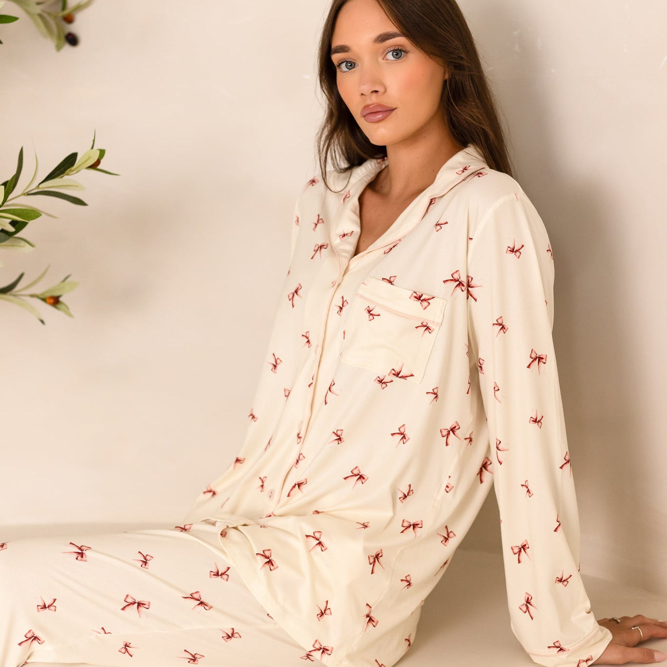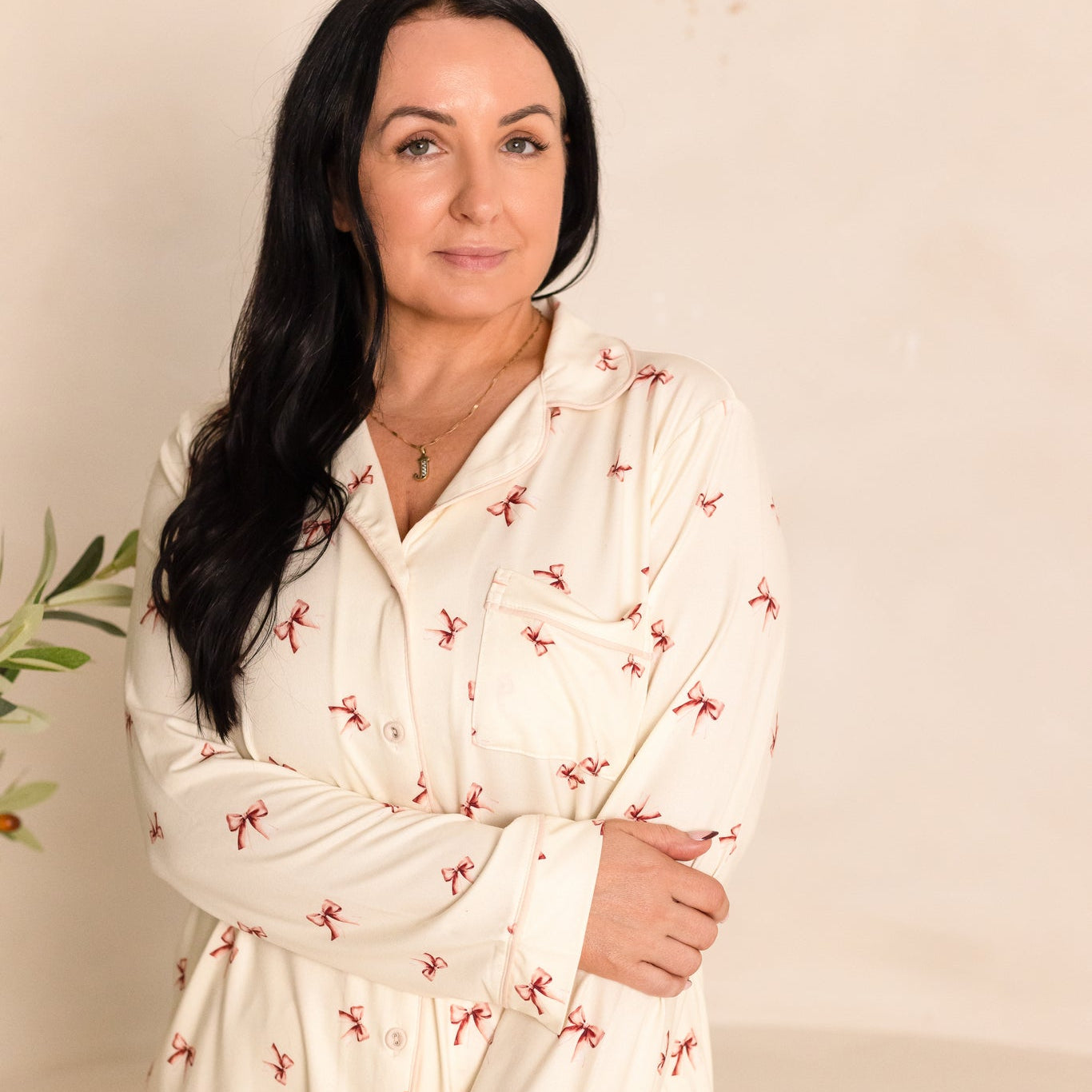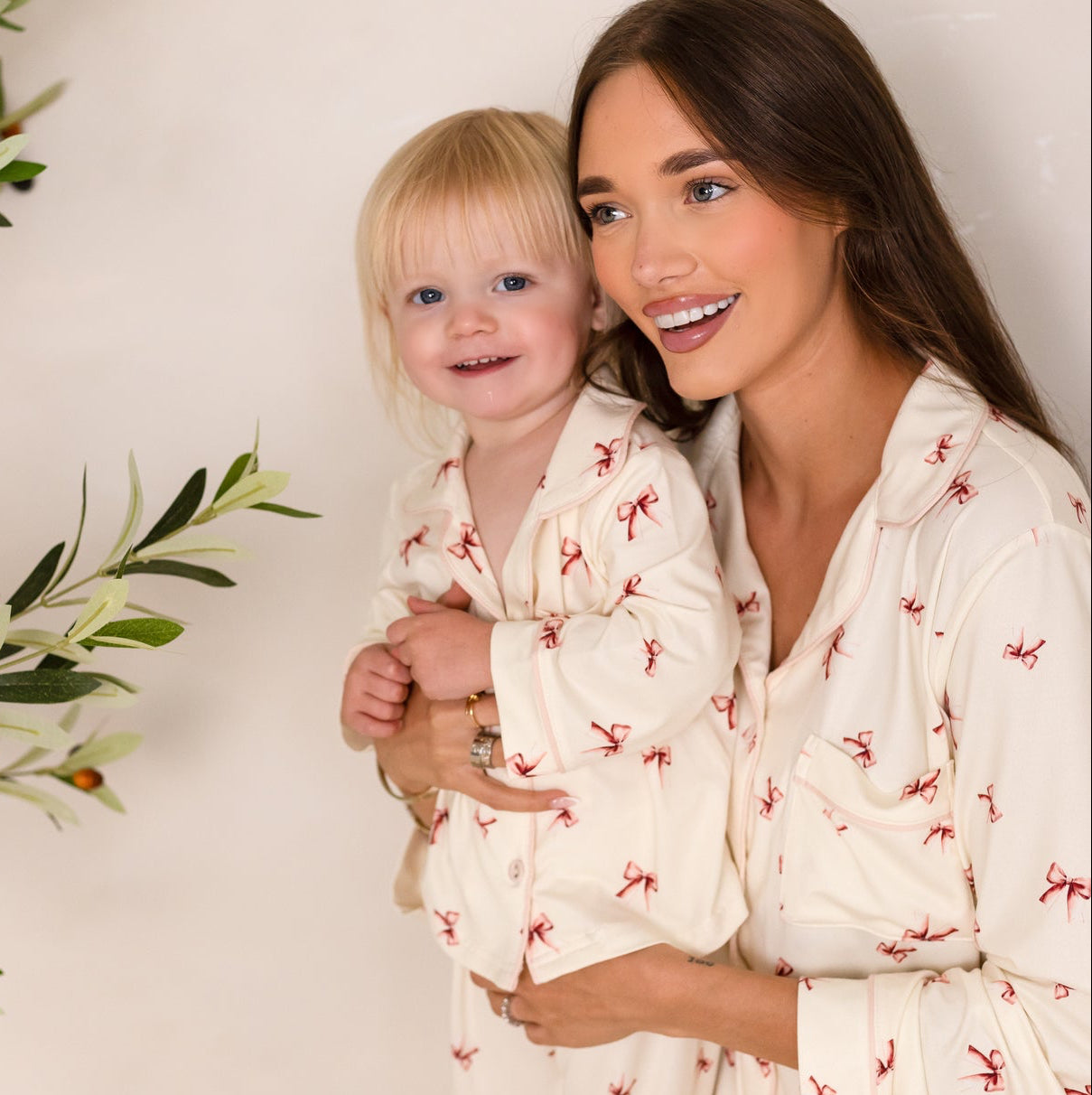 Wrap yourself in comfort and charm with our COZY Rosy Ribbon Pyjamas, designed for mums (and grown-up snugglers) who love a little whimsy with their wind-down. Featuring our exclusive rosy ribbon print on a creamy soft base, this matching set is perfect for festive mornings, bedtime stories, or just curling up with a cuppa.