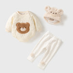 - Complete Ensemble: This adorable set includes a quilted bodysuit featuring a plush bear applique, soft leggings with playful pom-pom details, and a cozy bear-themed hat with 3D ears for added cuteness.