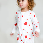 Introducing our enchanting 2-Way Zipper Bamboo Sleepsuit One Piece in a delightful Love Heart print, perfect for your precious Valentine's baby. Immerse your little one in unparalleled comfort with the award winning luxuriously soft bamboo and organic cotton fabric, meticulously chosen to enhance their overall wearing experience.