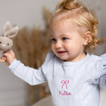 The Knitted Bow Frill Romper is the perfect mix of delicate detail and everyday comfort. Designed in a soft baby blue ribbed knit with a pop of pink bow embroidery, it’s made to make your mini feel (and look) absolutely adorable—from playtime to nap time and every cuddle in between.