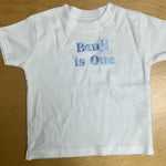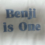 Sample Sale - 1-2yrs - 'Benji is one' in baby blue thread - logo printed about half way down the back of the top