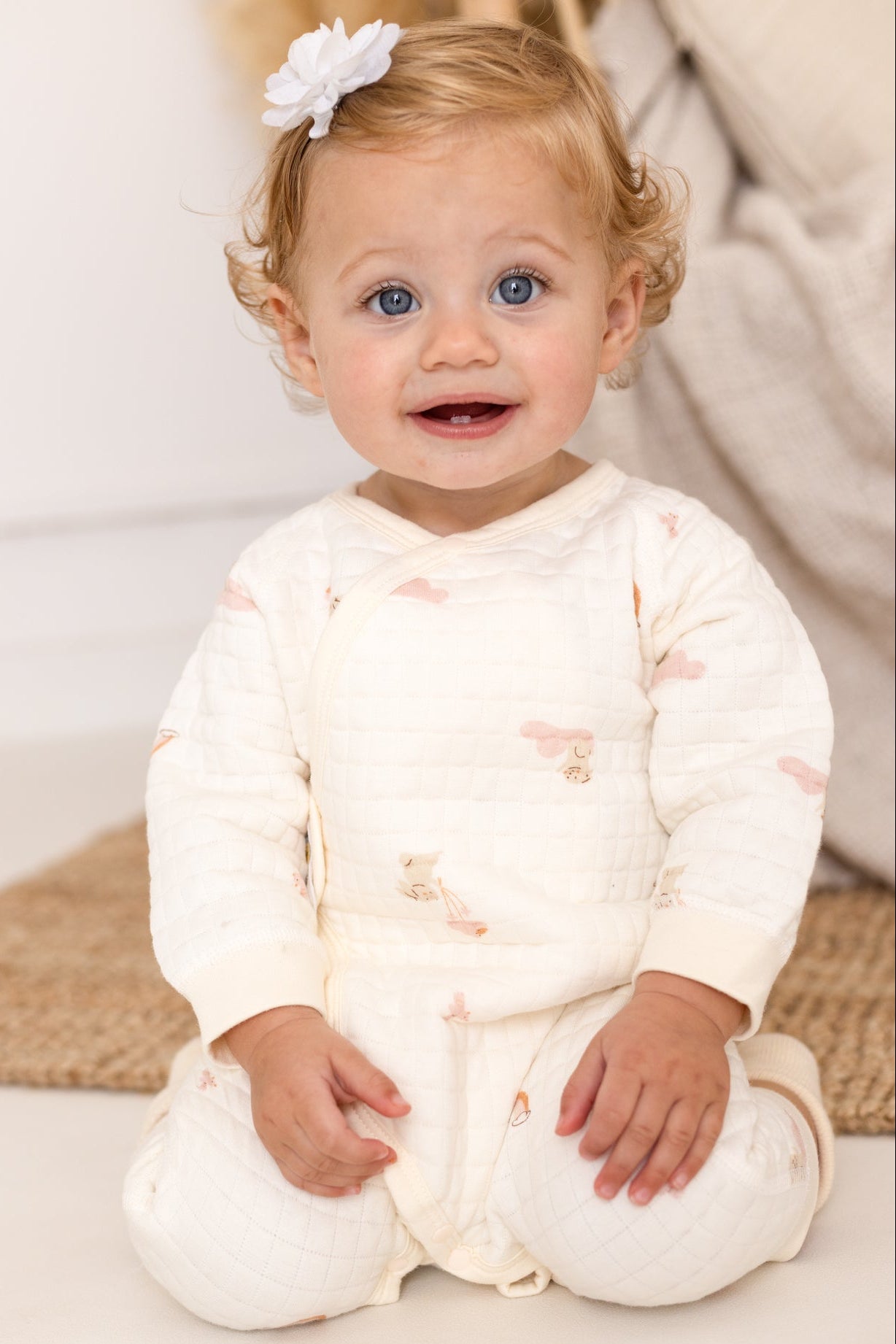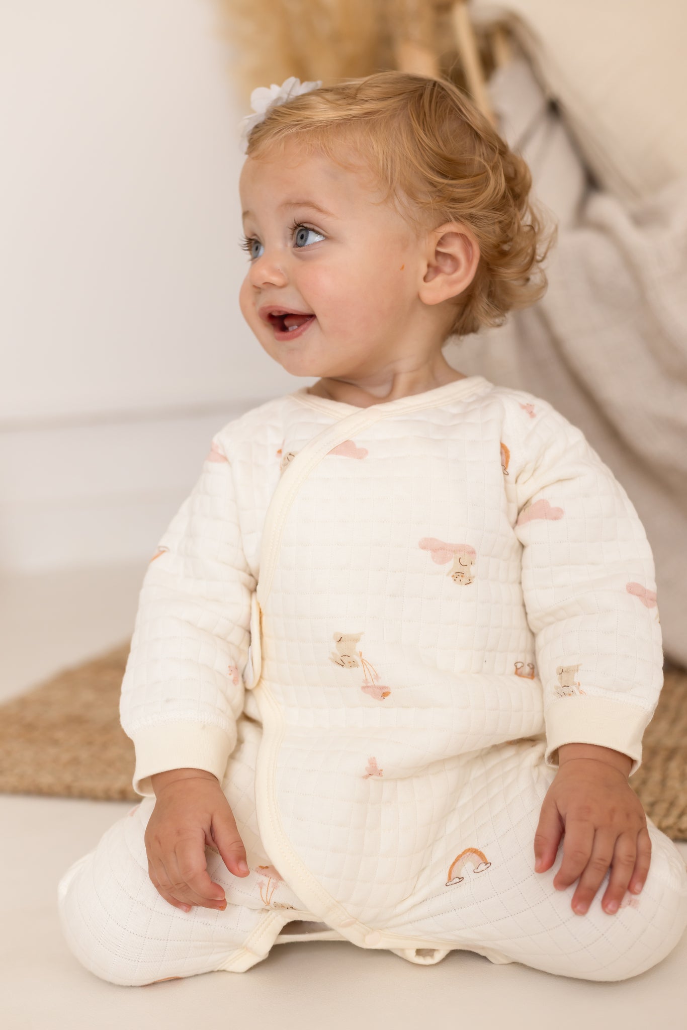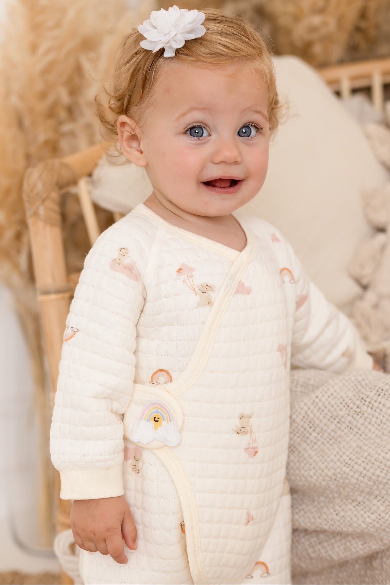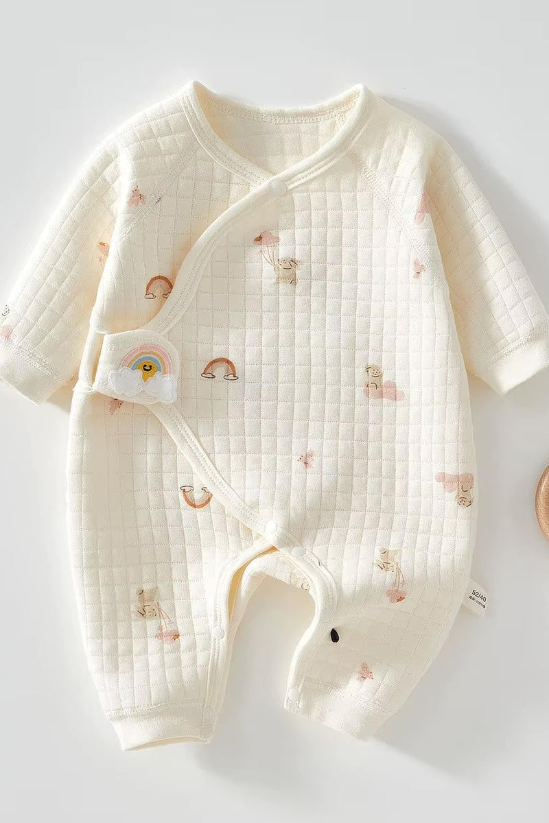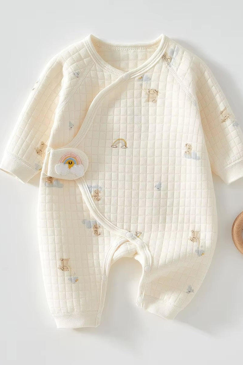 🧸 Soft as a Hug Made with our signature boucle and 100% cotton blend, this romper is cloud-soft and oh-so-gentle on delicate baby skin. The quilted texture adds extra coziness, perfect for chillier days or midnight feeds.