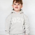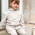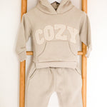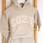 Keep your little one snug and stylish with our COZY Tracksuit, available in Brown, Stone, and Off-White. This adorable set features an oversized hoodie with the word "COZY" on the front in soft towel applique lettering, adding a fun and tactile touch to their outfit. Paired with matching sweatpants, this tracksuit is perfect for play, relaxing, or heading out on family adventures.