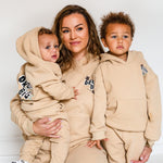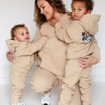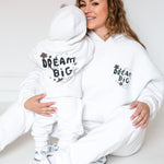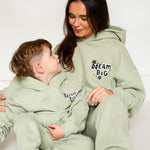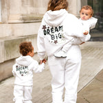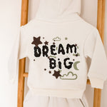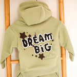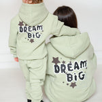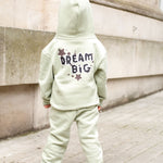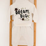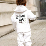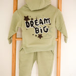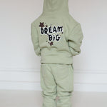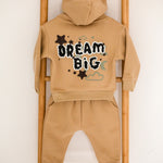 Inspire your little one to reach for the stars with our Dream Big Tracksuit, available in Biscuit, Sage, and Off-White. This cozy set includes an oversized hoodie with a puff print "Dream Big" graphic on the chest and a large "Dream Big" slogan on the back, making it the perfect blend of comfort and motivation. Paired with matching sweatpants, this tracksuit is ideal for playtime, lounging, or family outings.