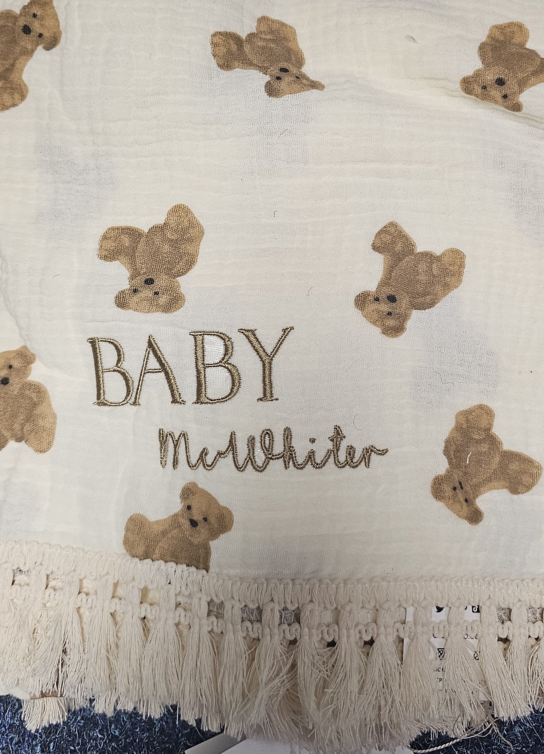 Baby’s name embroidered in the dreamiest thread—such a special keepsake.