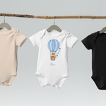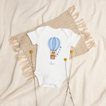 Introducing the Cozy Crew Club's adorable Hot Air Baloon personalized bodysuit, a charming addition to commemorate any occasion. Crafted with love and care, this sweet white onesie features an endearing design of a bear taking flight in a hot air baloon.