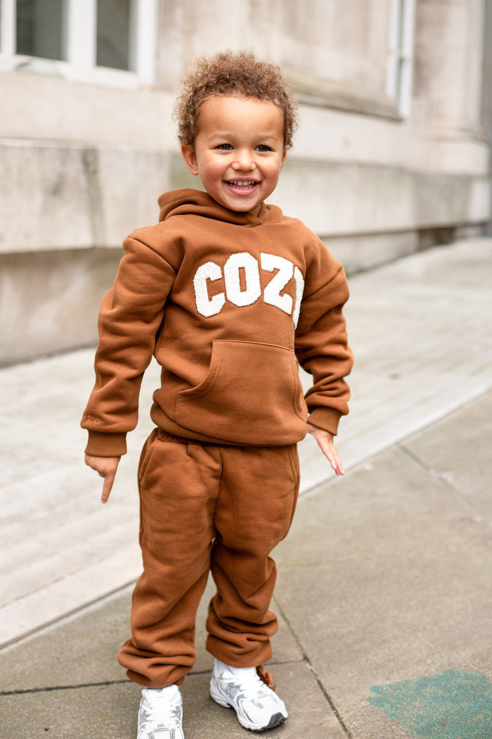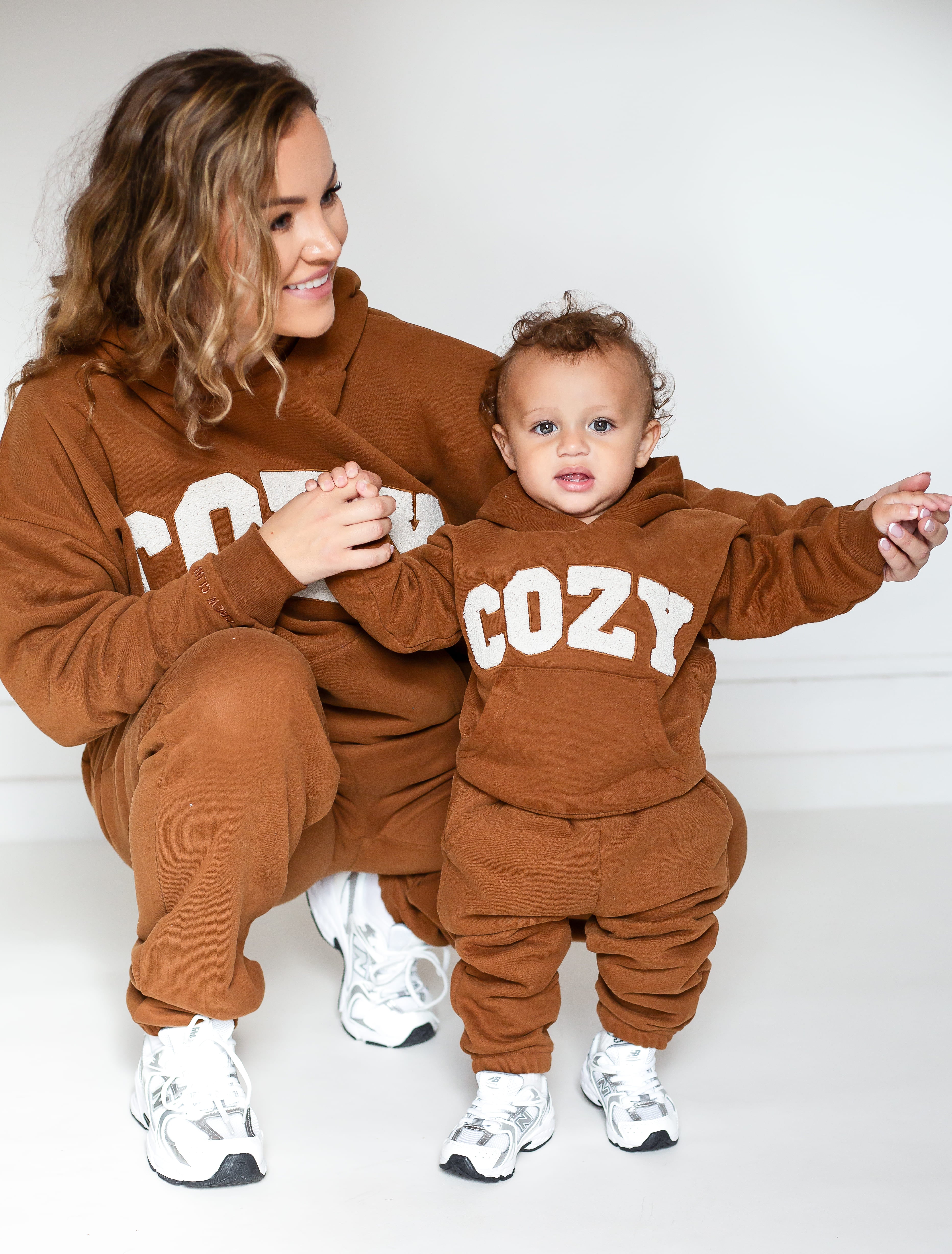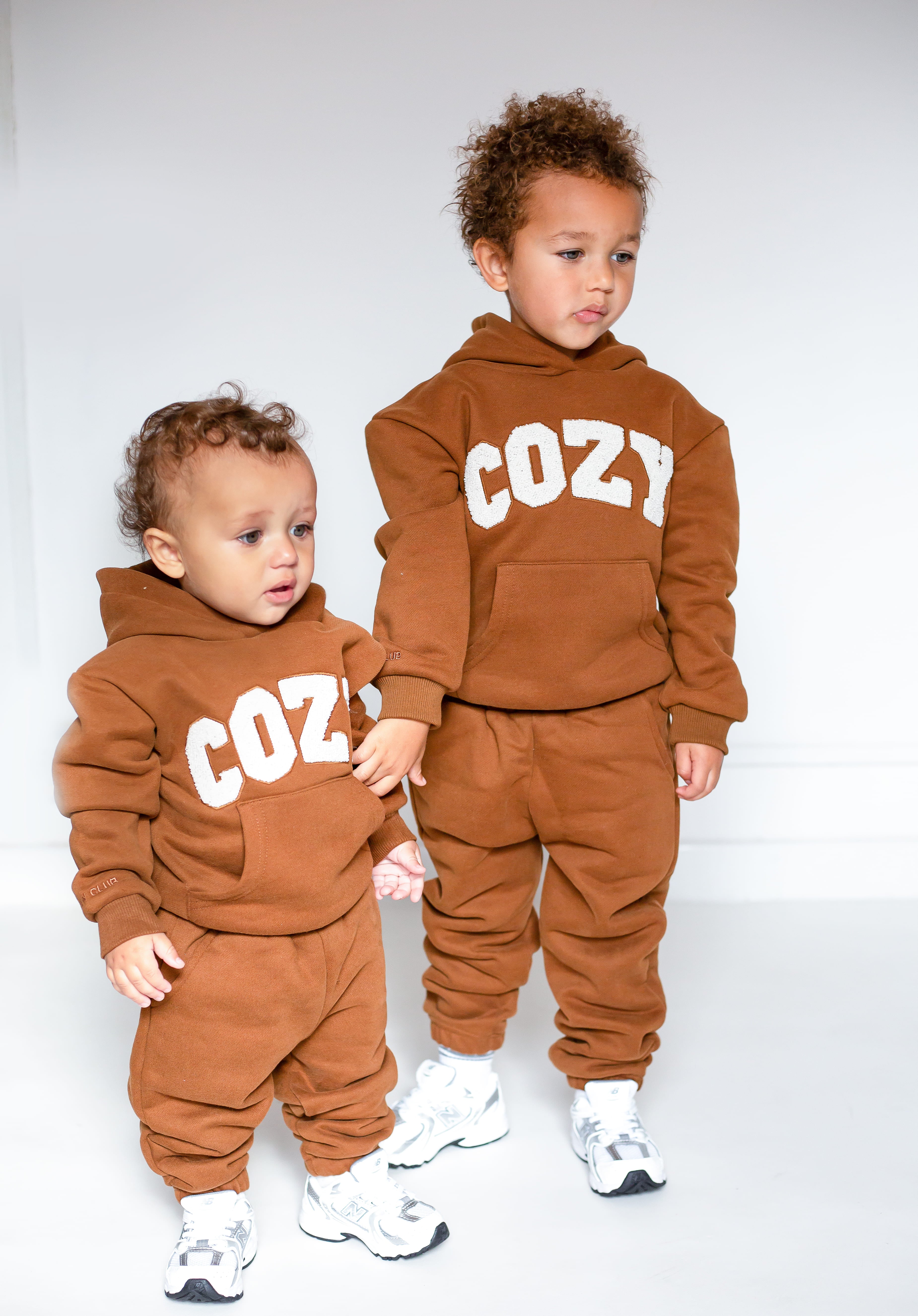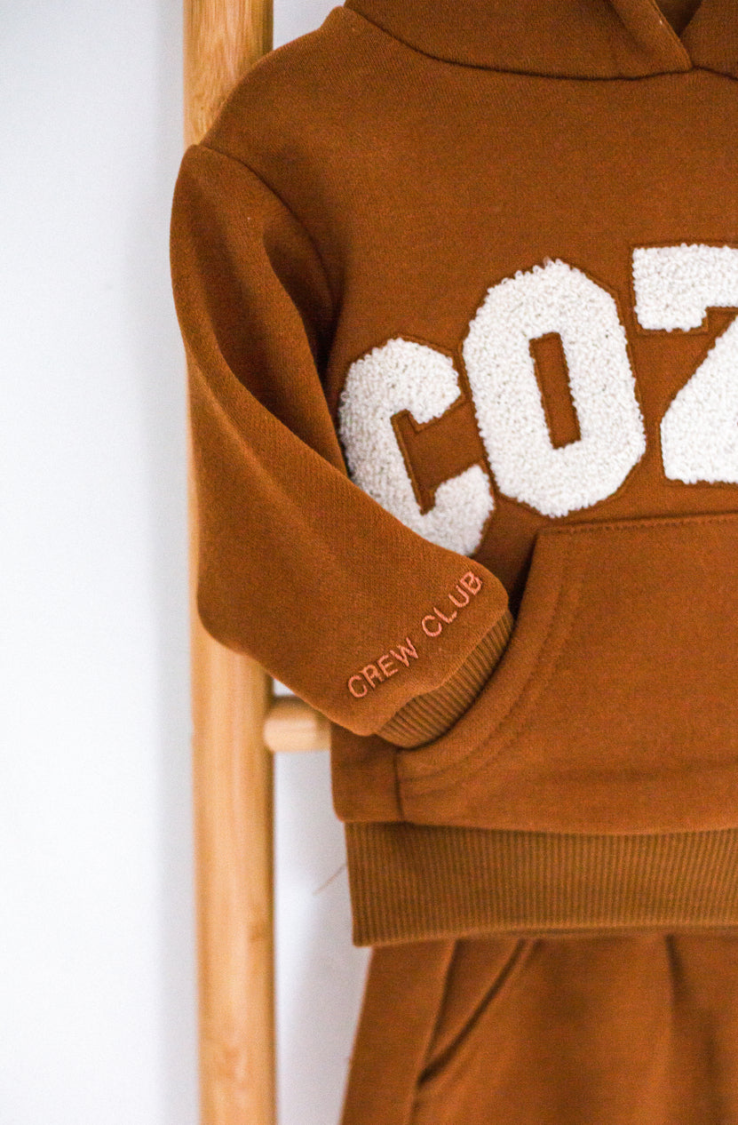 Gardez votre tout-petit bien au chaud et élégant avec notre survêtement COZY, disponible en marron, pierre et blanc cassé. Cet adorable ensemble comprend un sweat à capuche surdimensionné avec le mot « COZY » sur le devant en lettres appliquées en tissu éponge doux, ajoutant une touche amusante et tactile à sa tenue. Associé à un pantalon de survêtement assorti, ce survêtement est parfait pour jouer, se détendre ou partir à l'aventure en famille.