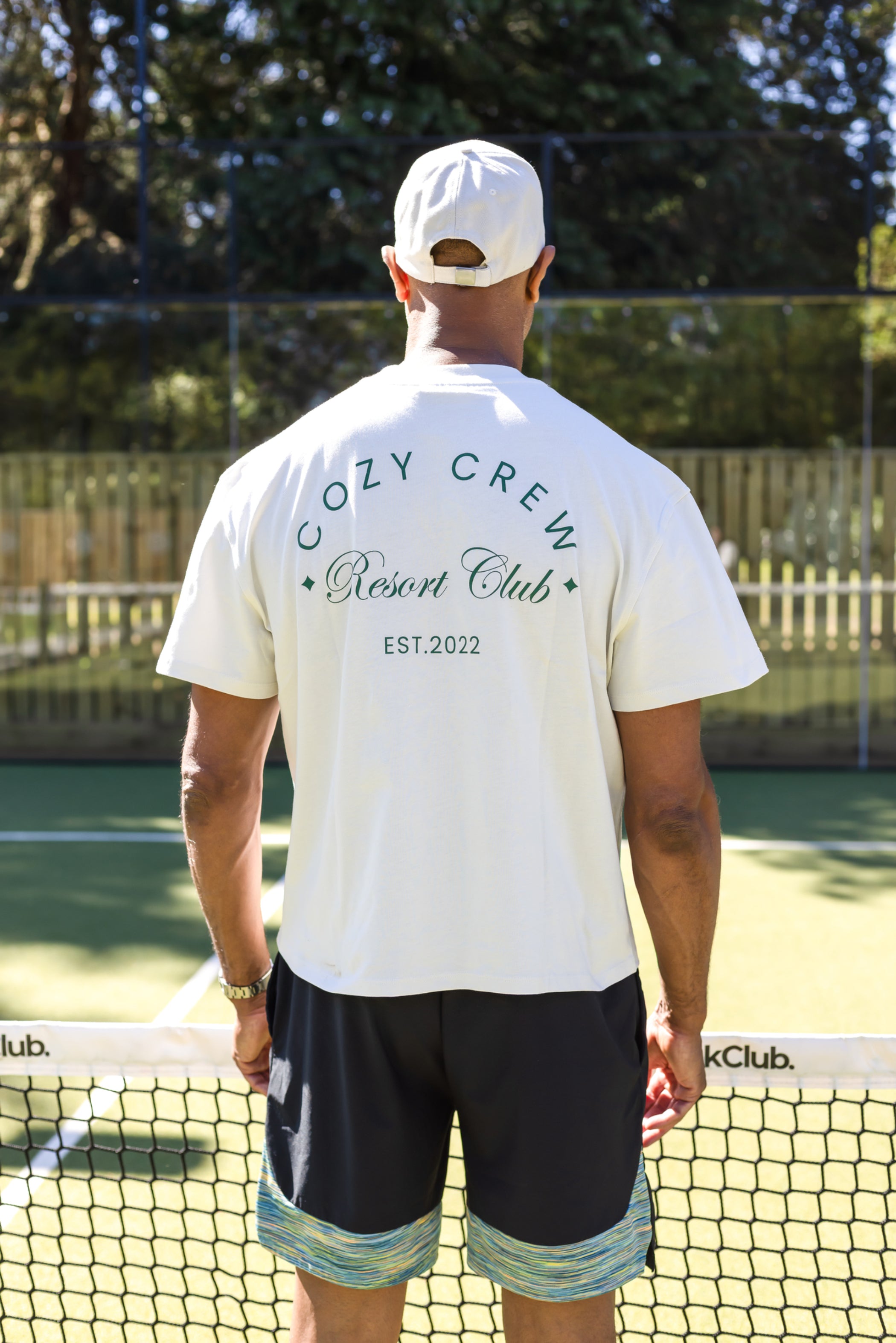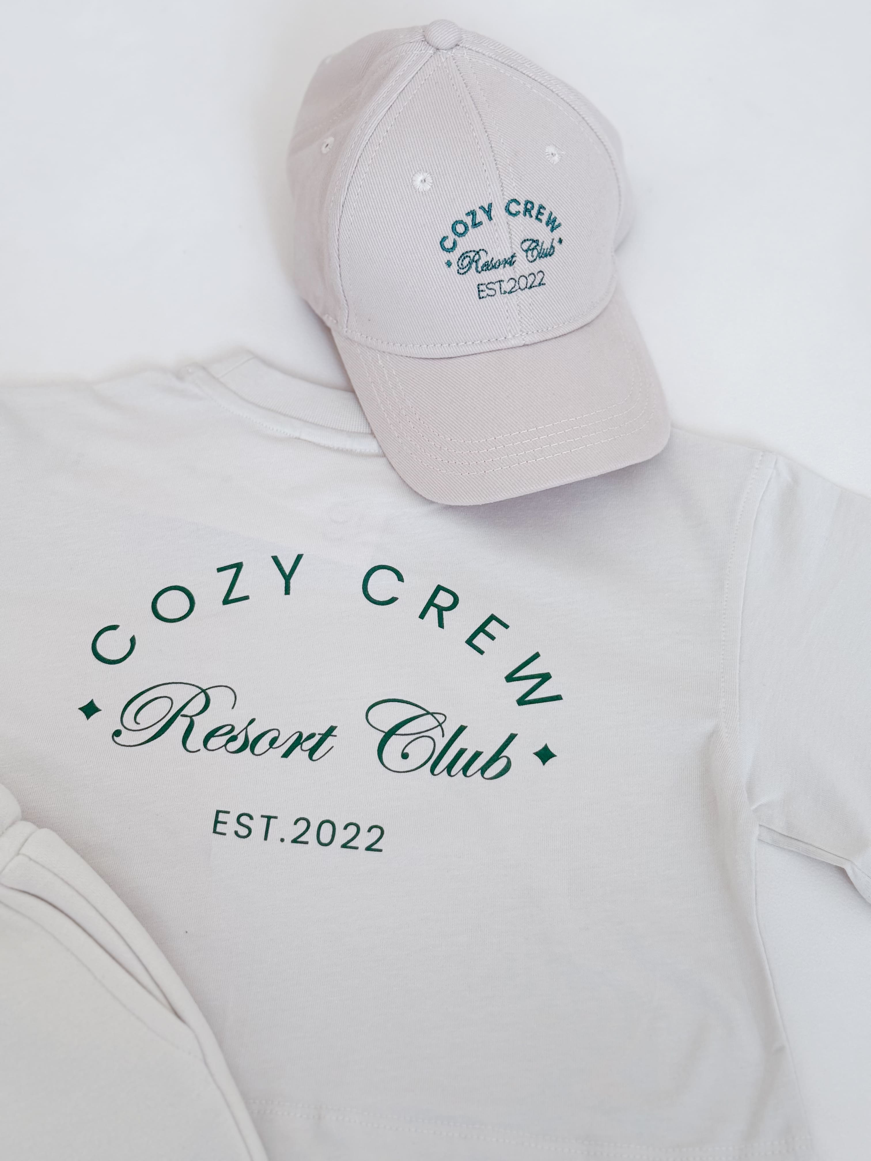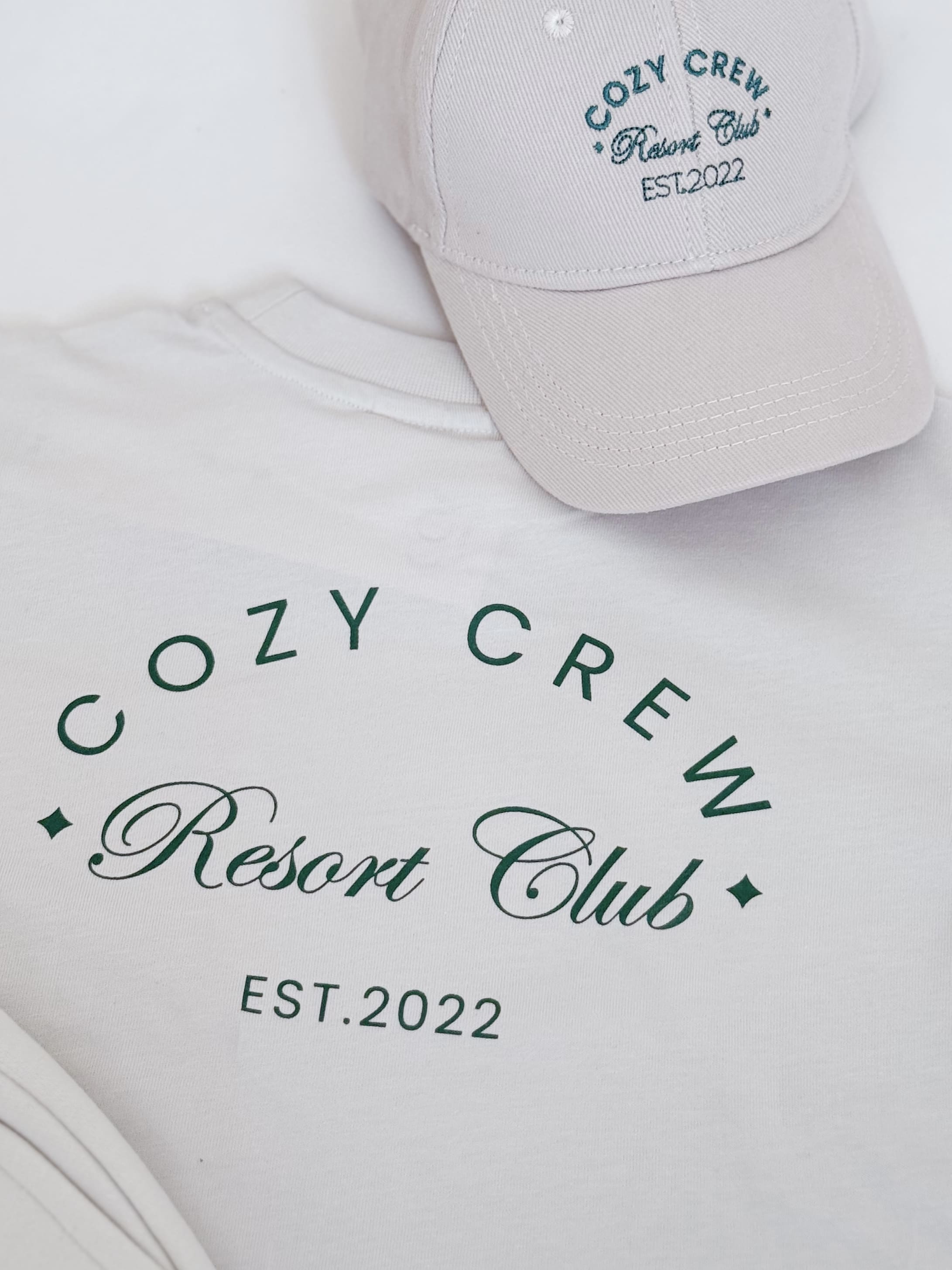Crafted from ultra-soft cotton, it features a relaxed fit, chest pocket, and our signature Cozy Crew Club Resort Club print across the back — a nod to chilled-out luxury and minimalist style. Match with your mini or wear solo with your favourite denim or shorts.
