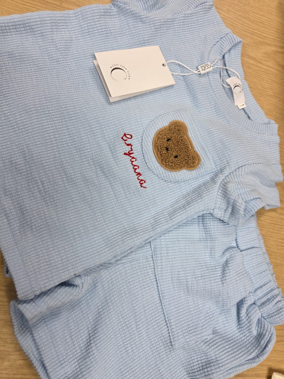 Sample Sale - 12-18m - Blue tshirt and short set - 'Aryaana' in red thread