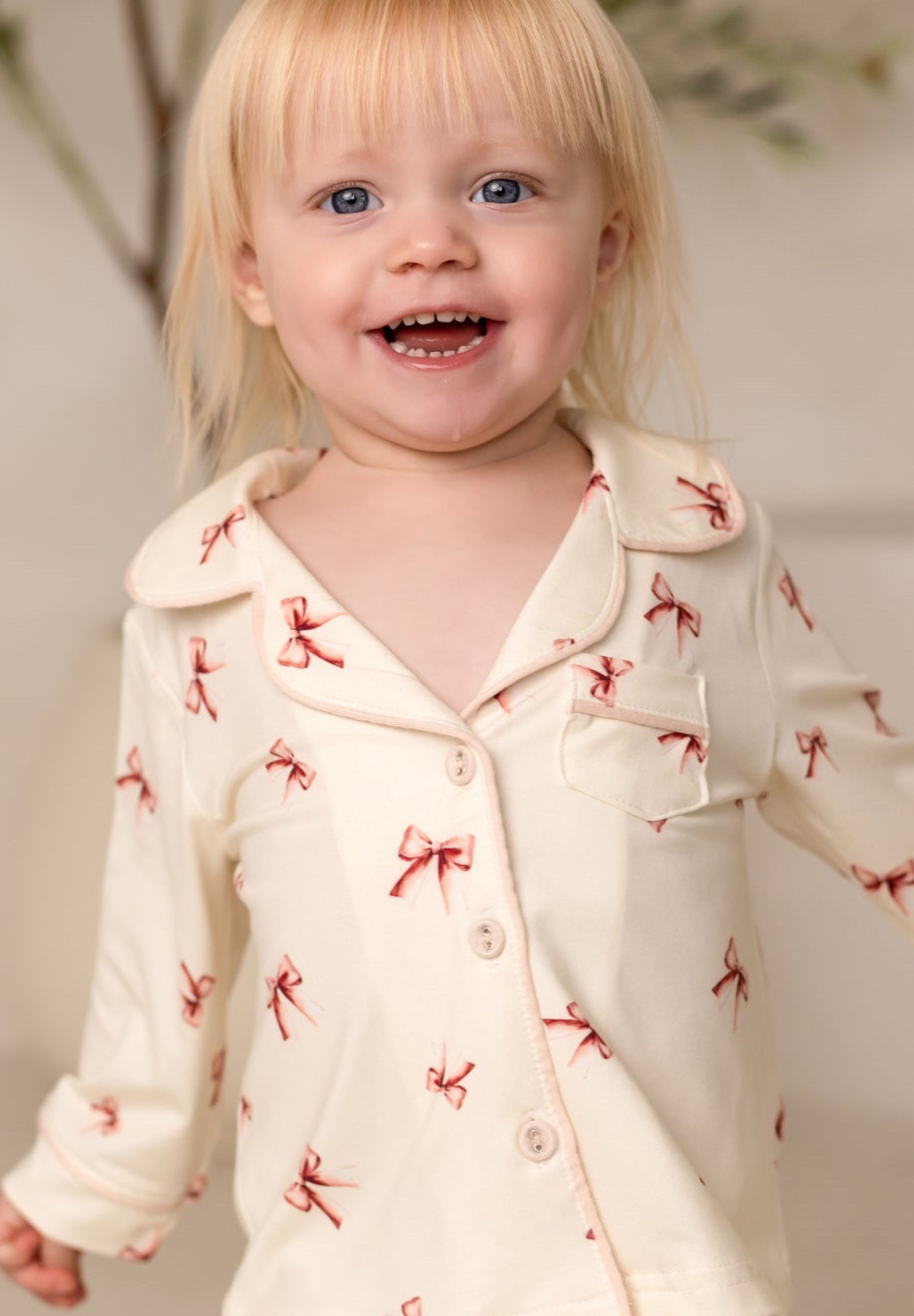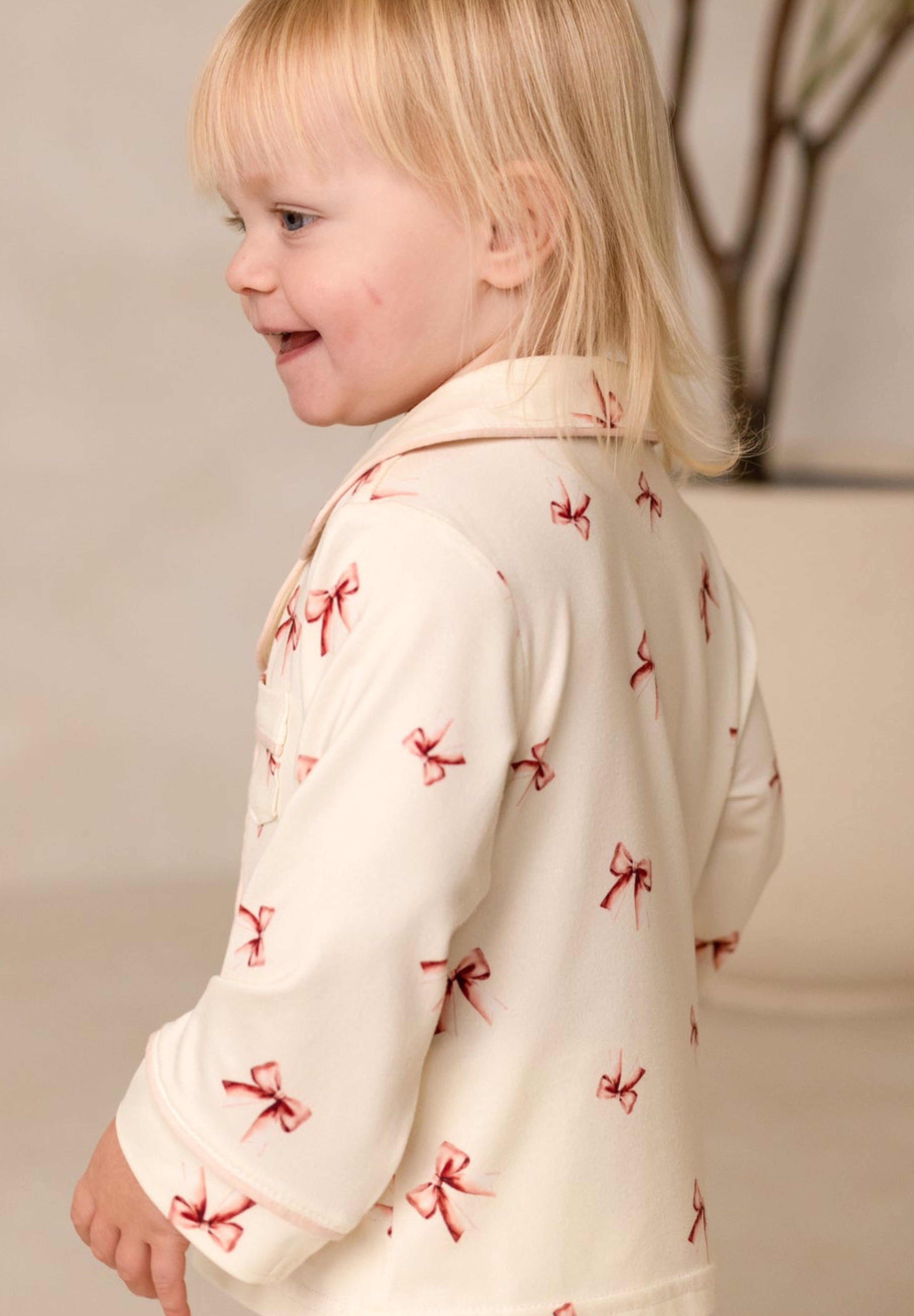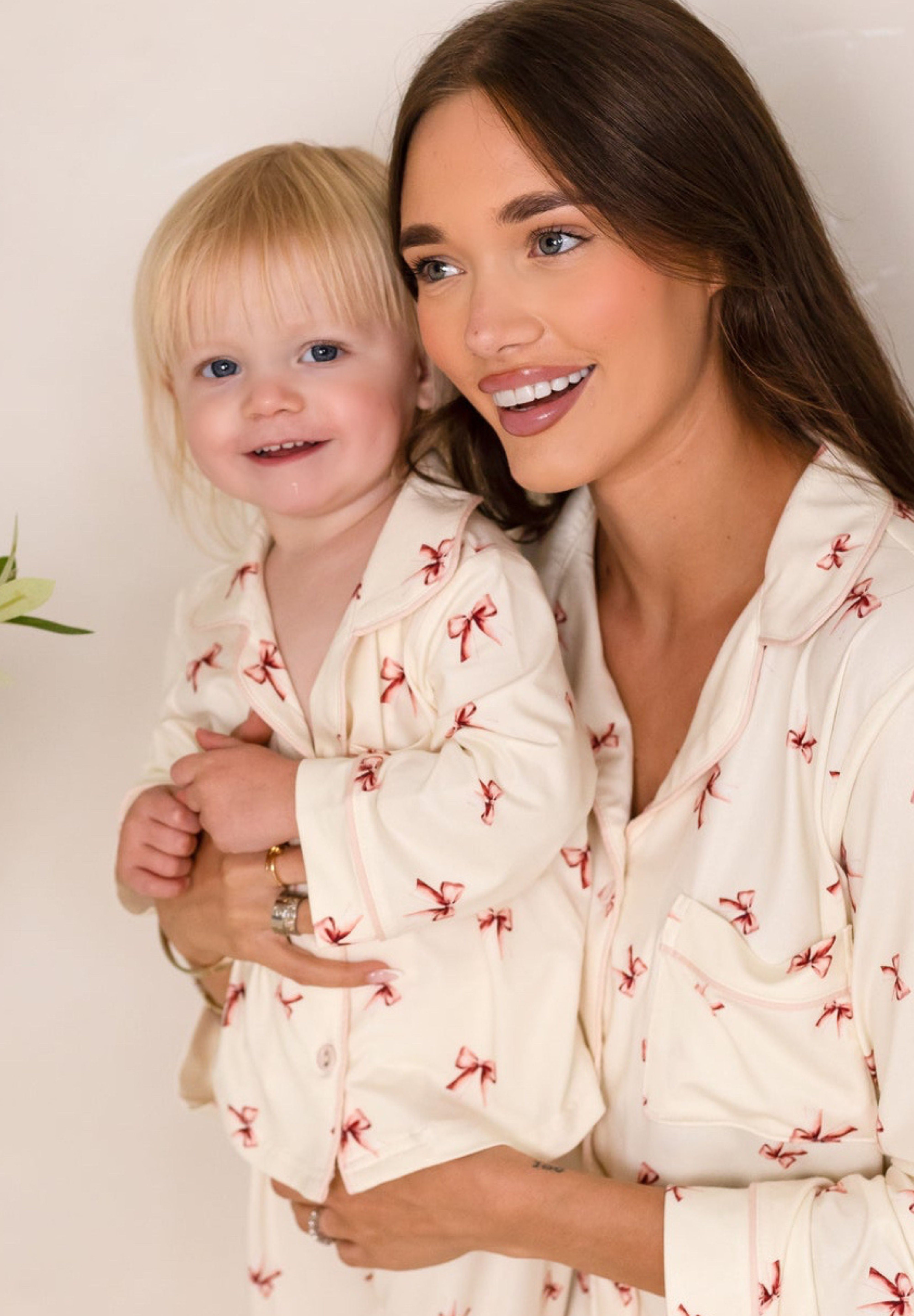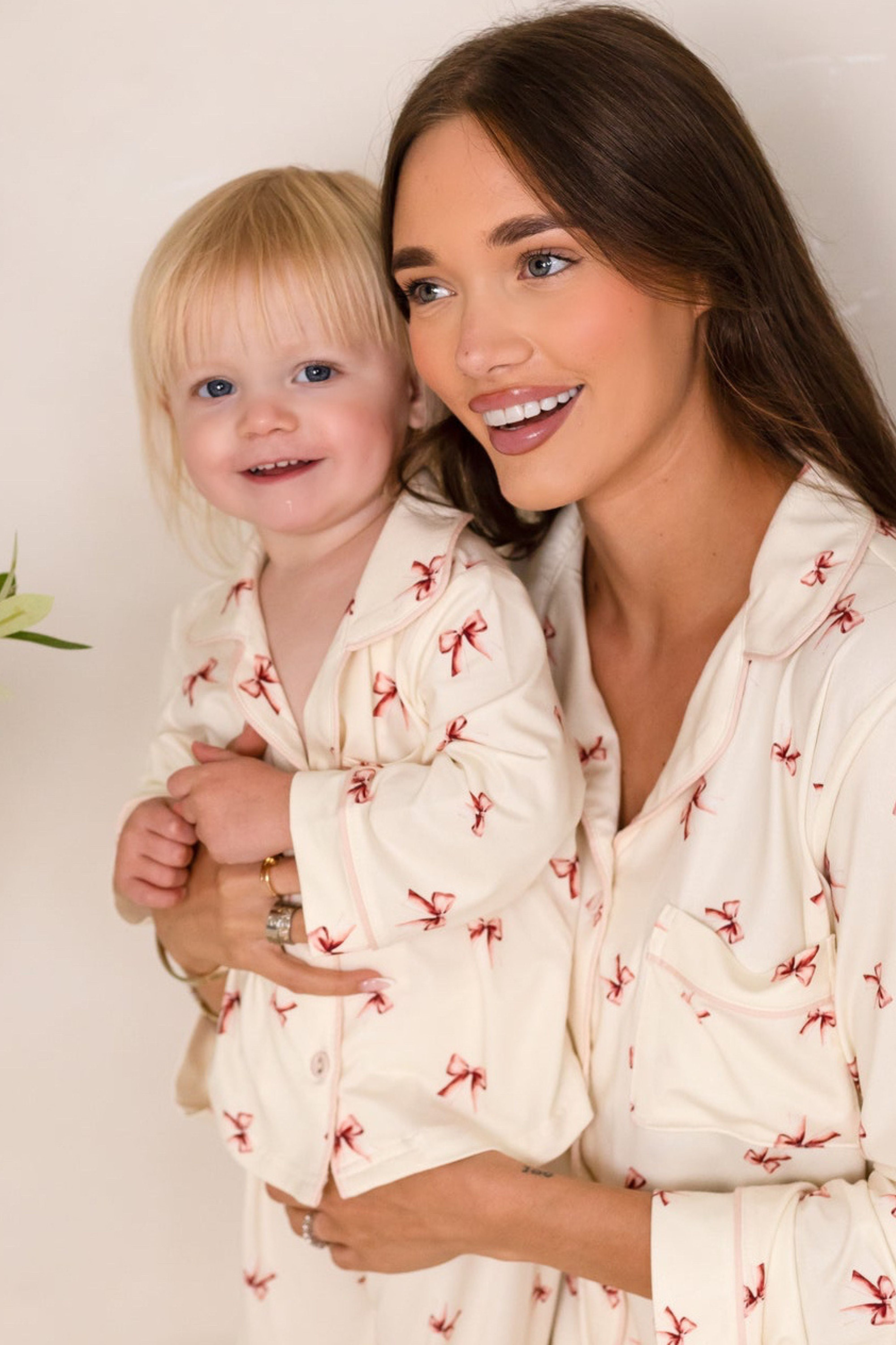 Say hello to our sweetest set yet — the Mini COZY Rosy Ribbon Pyjamas, featuring an all-over print of delicate pink bows on our signature creamy base. Perfect for bedtime cuddles, slow Sunday mornings, and twirling around the lounge, these jammies are made to feel as lovely as they look.