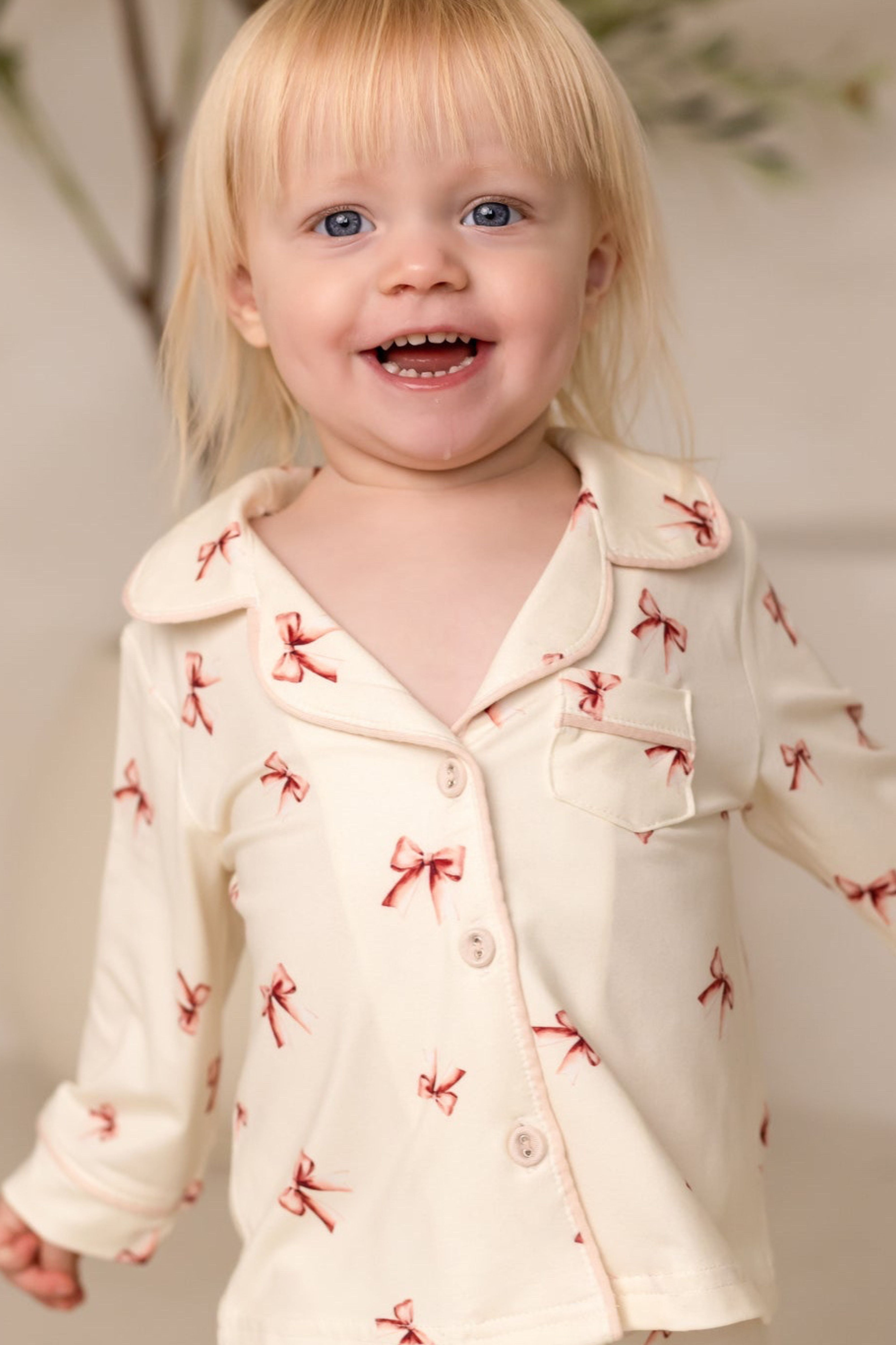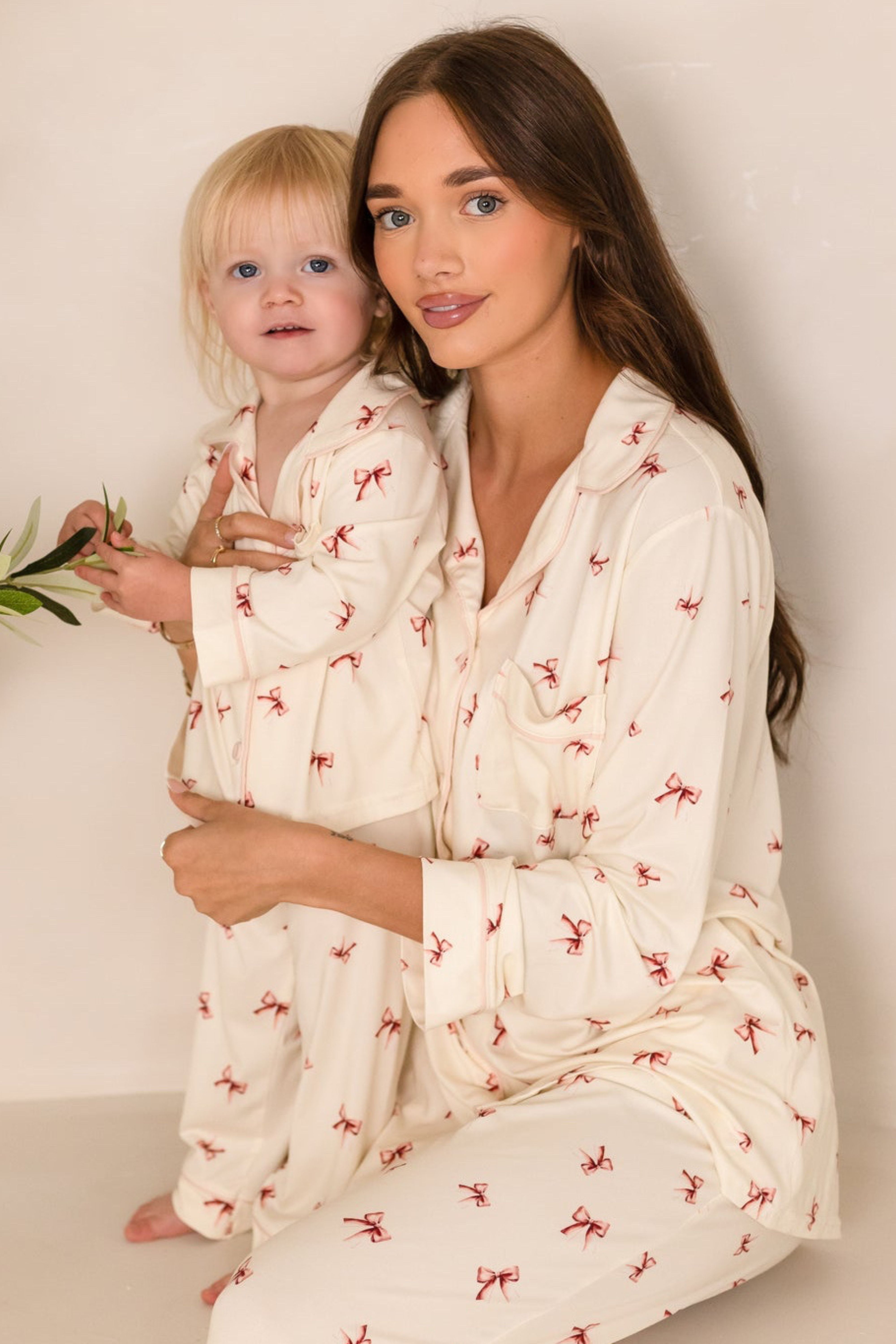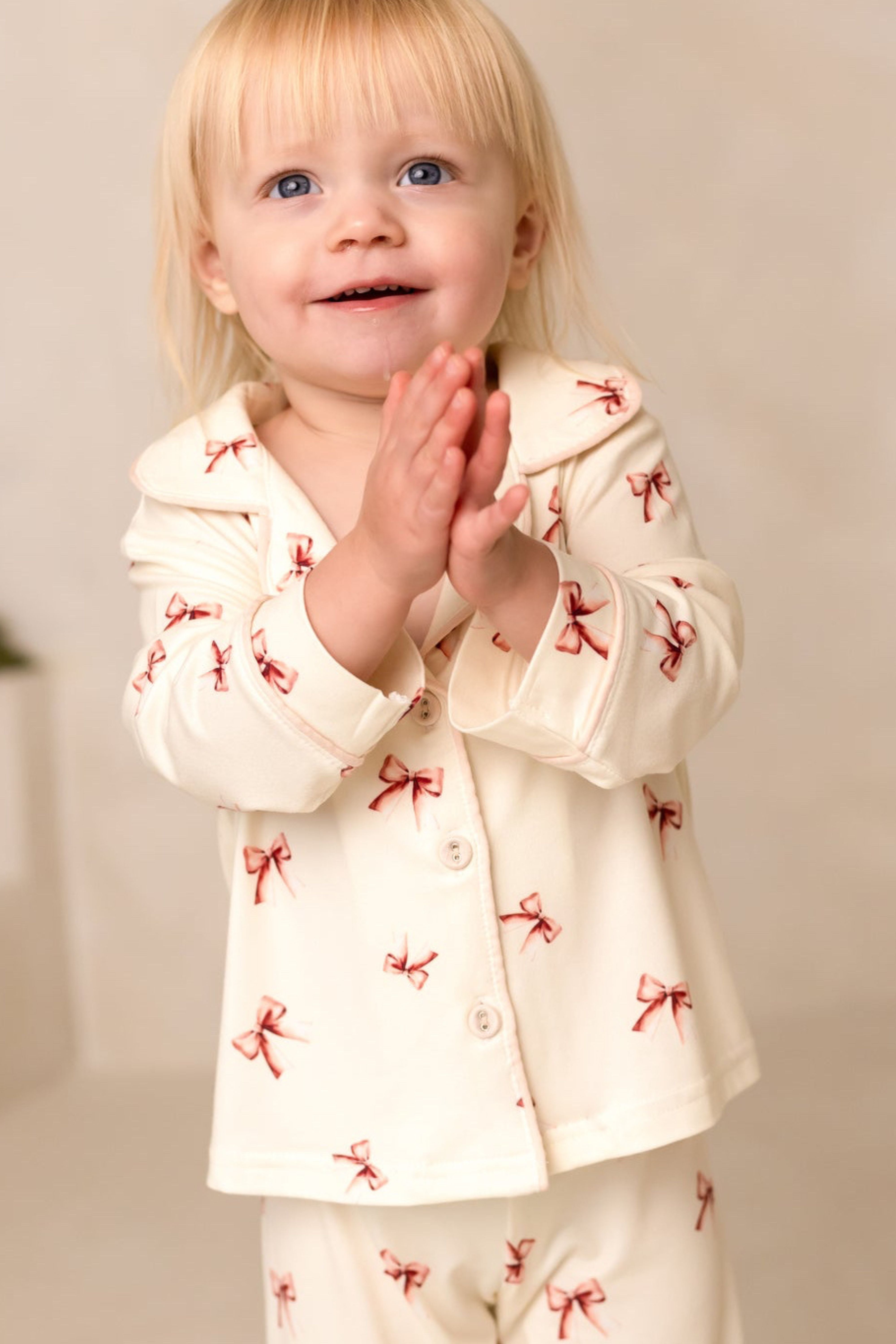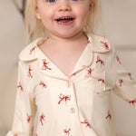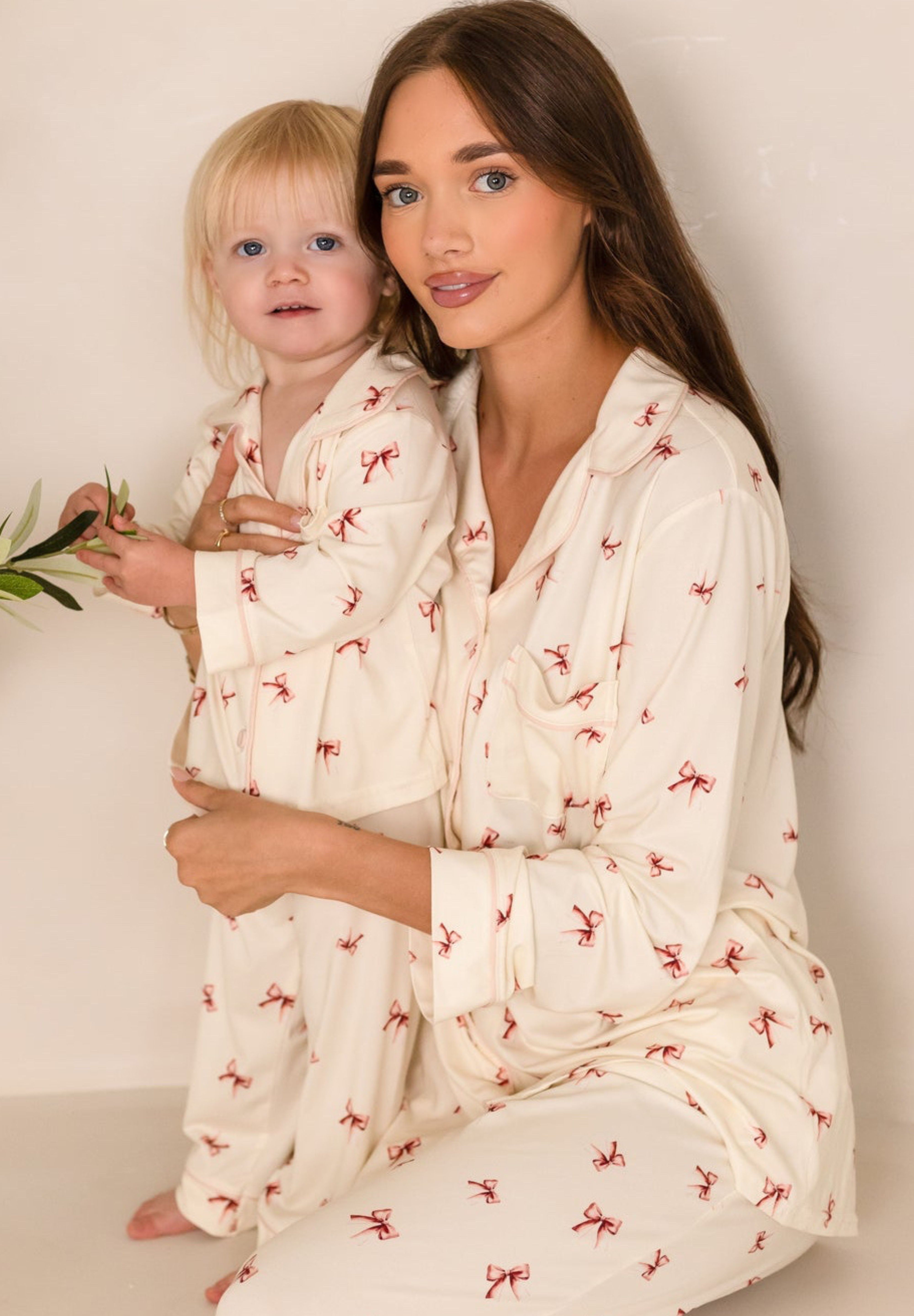 Say hello to our sweetest set yet — the Mini COZY Rosy Ribbon Pyjamas, featuring an all-over print of delicate pink bows on our signature creamy base. Perfect for bedtime cuddles, slow Sunday mornings, and twirling around the lounge, these jammies are made to feel as lovely as they look.