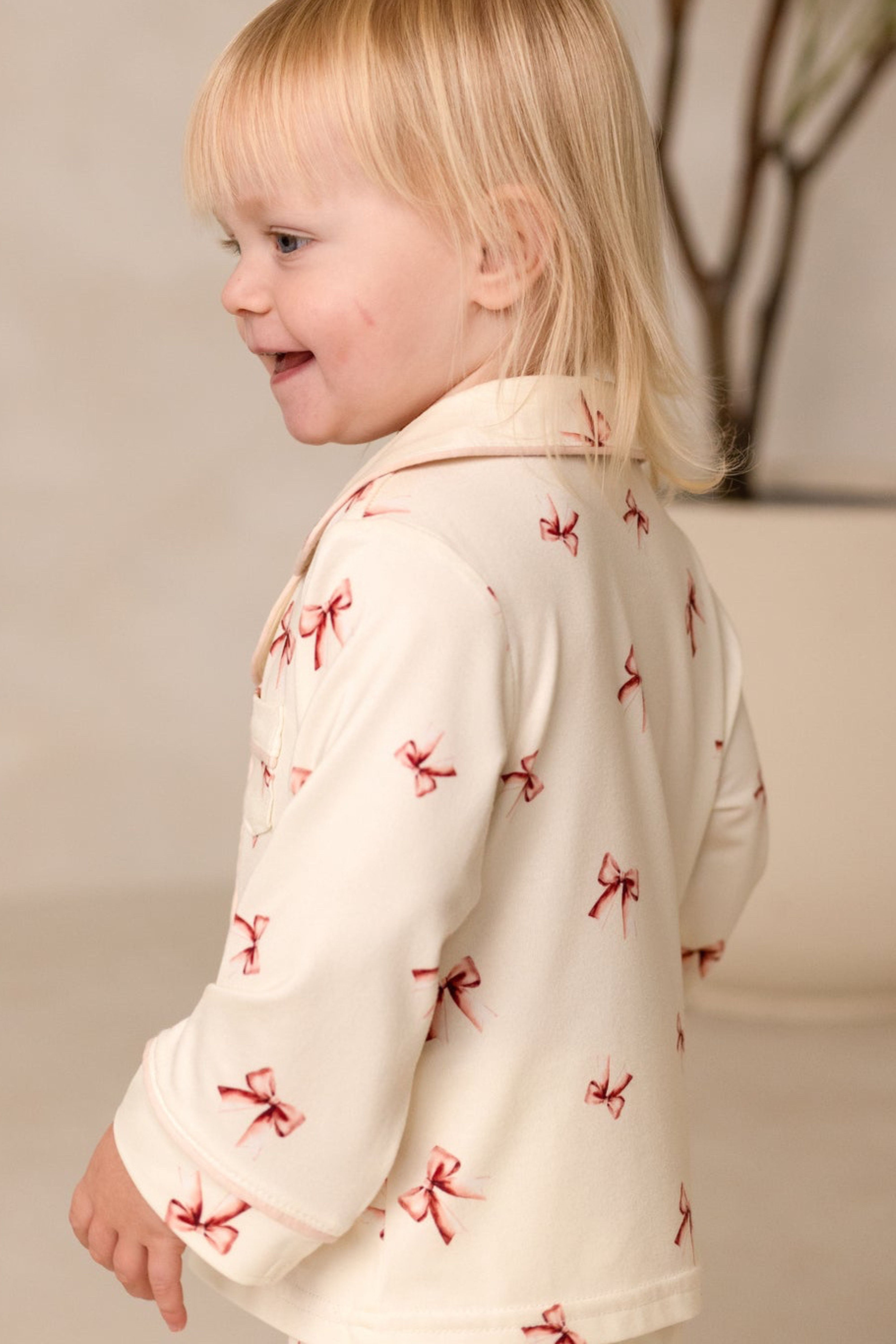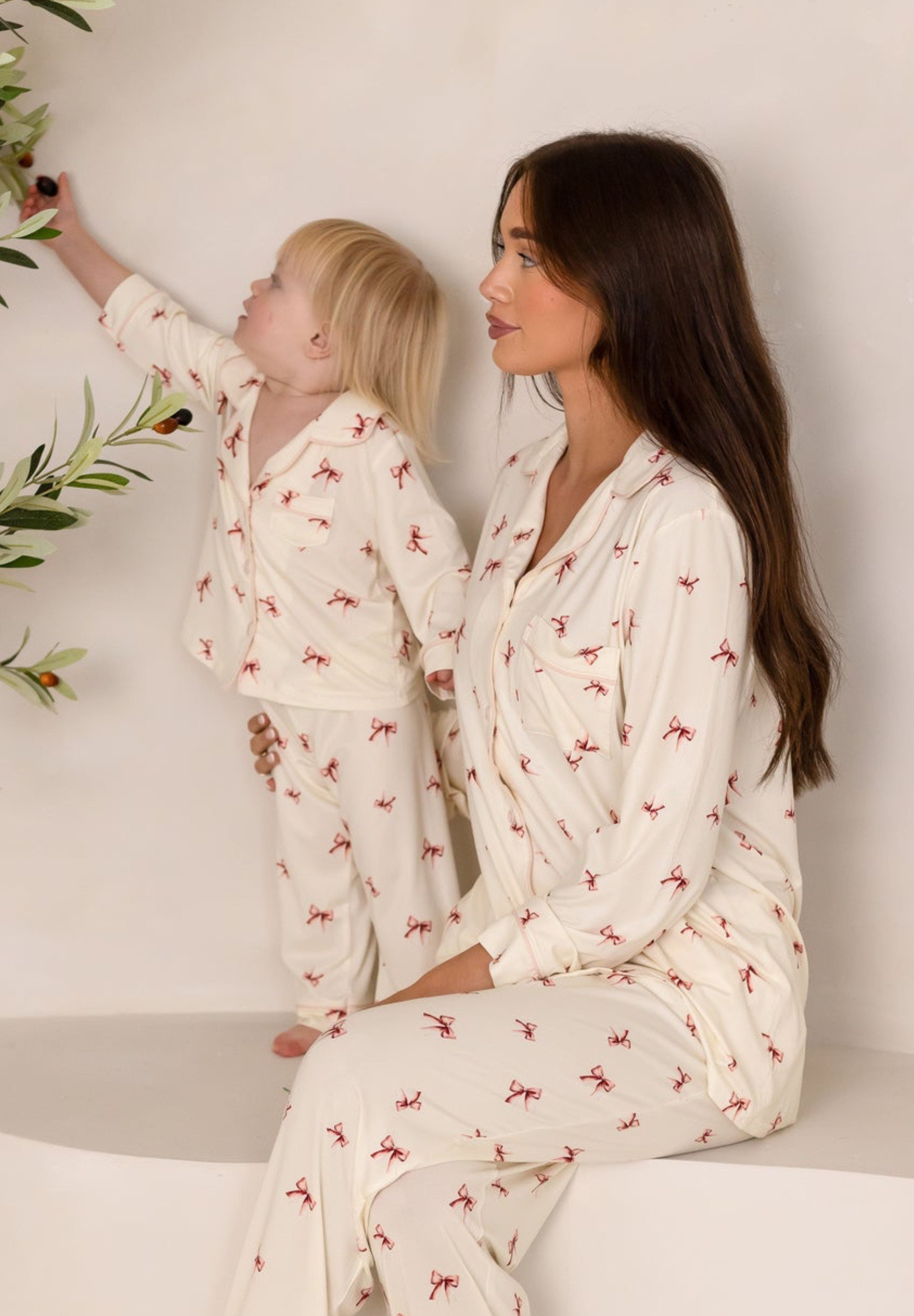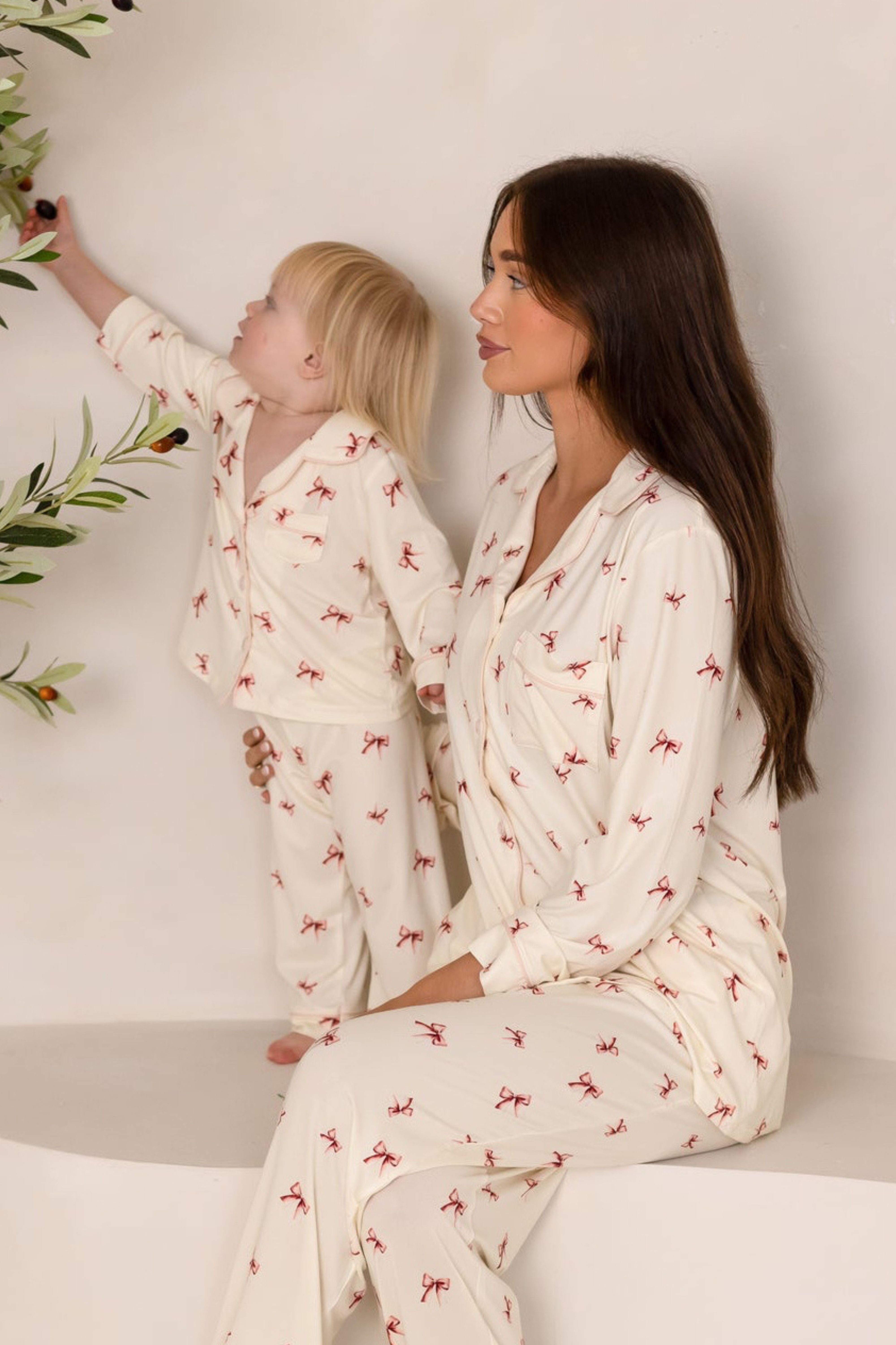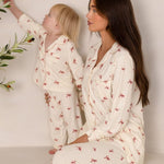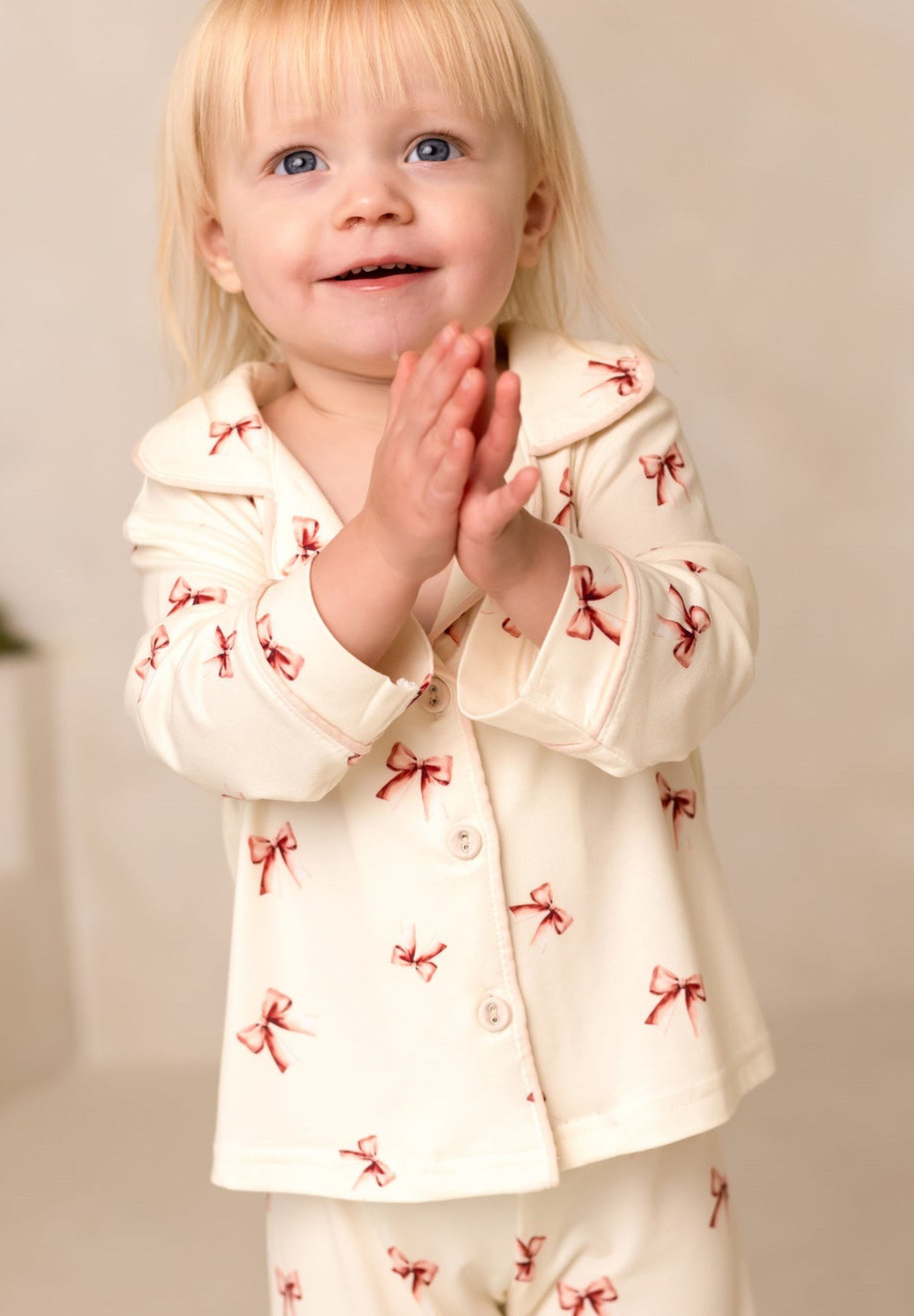 Say hello to our sweetest set yet — the Mini COZY Rosy Ribbon Pyjamas, featuring an all-over print of delicate pink bows on our signature creamy base. Perfect for bedtime cuddles, slow Sunday mornings, and twirling around the lounge, these jammies are made to feel as lovely as they look.